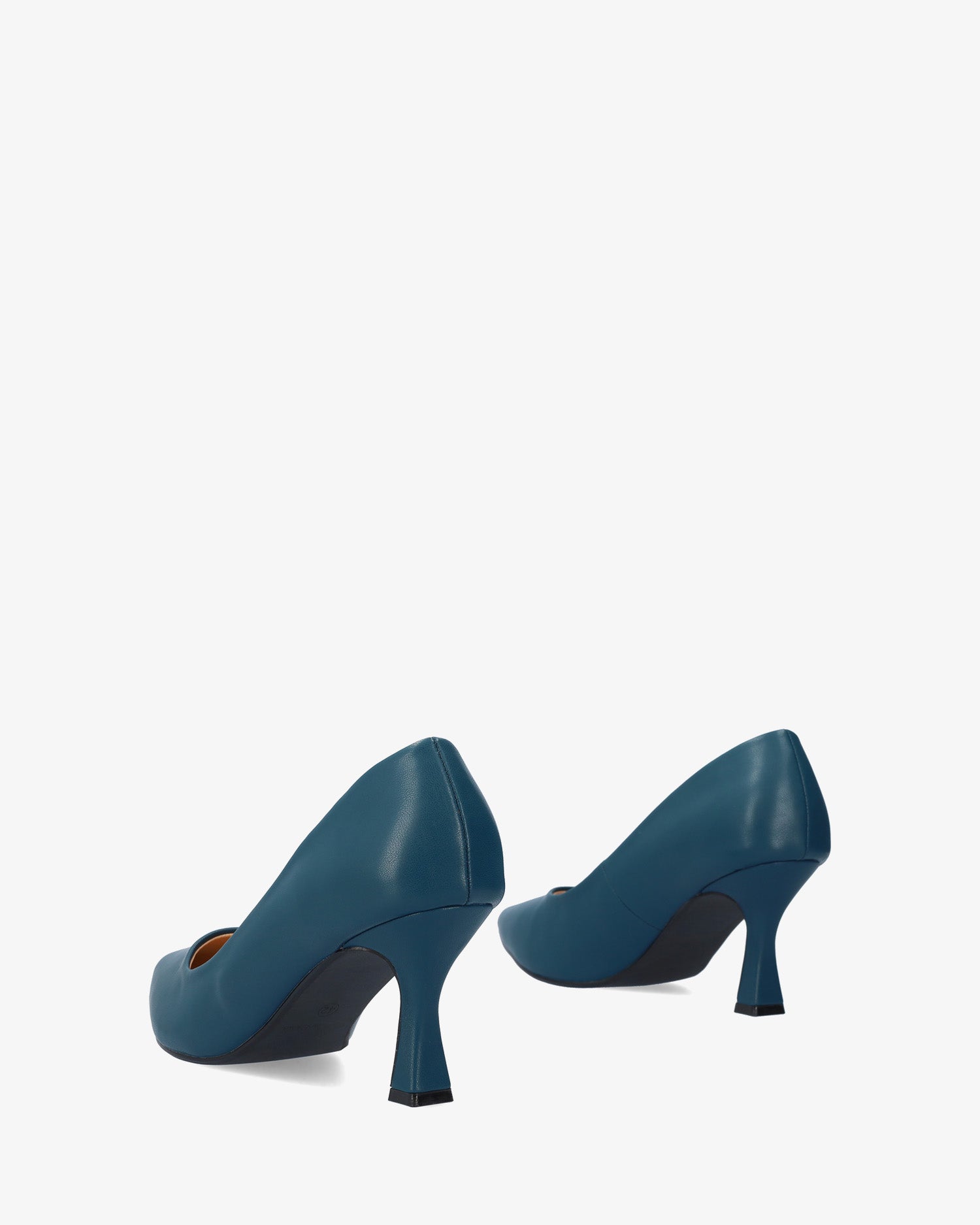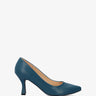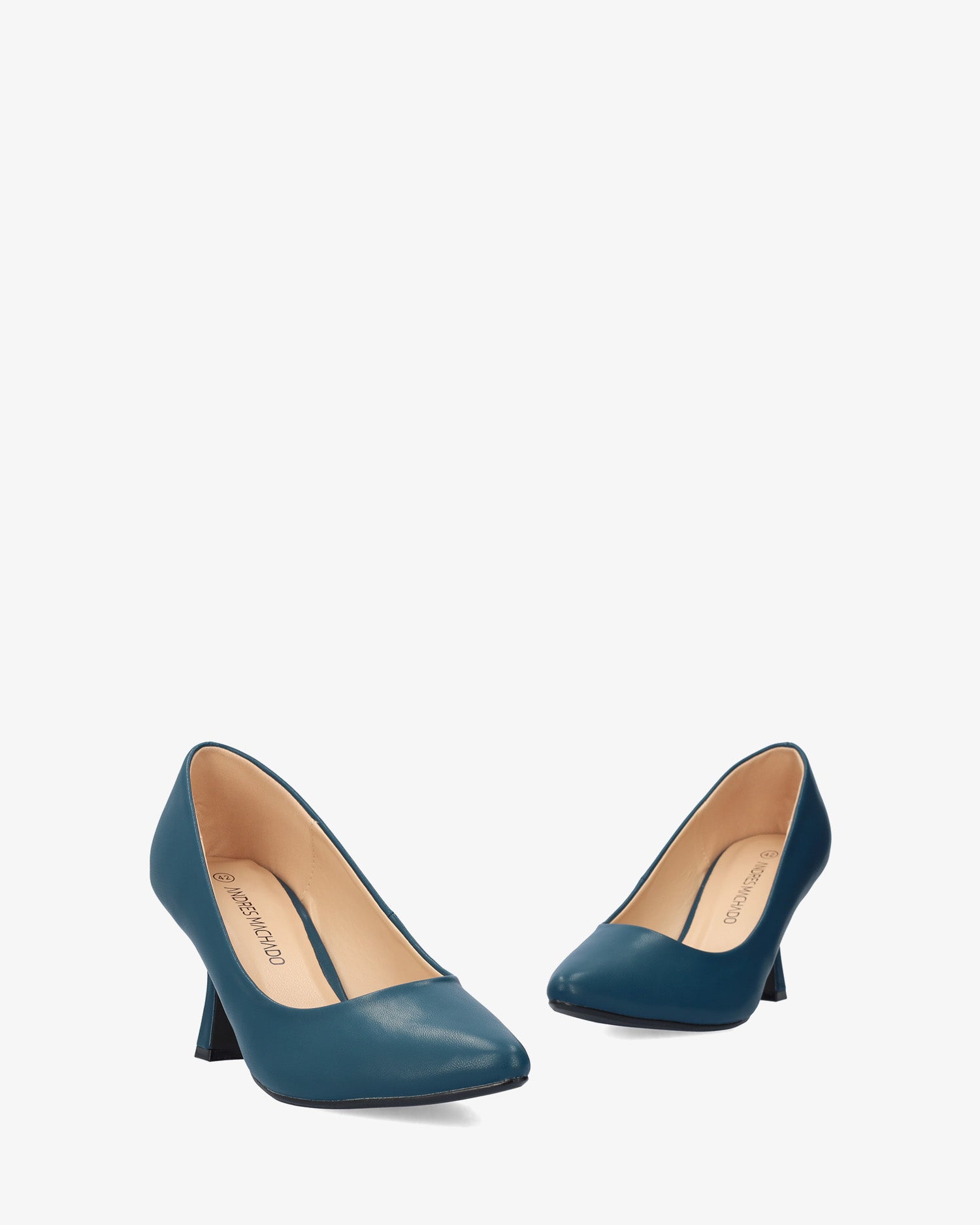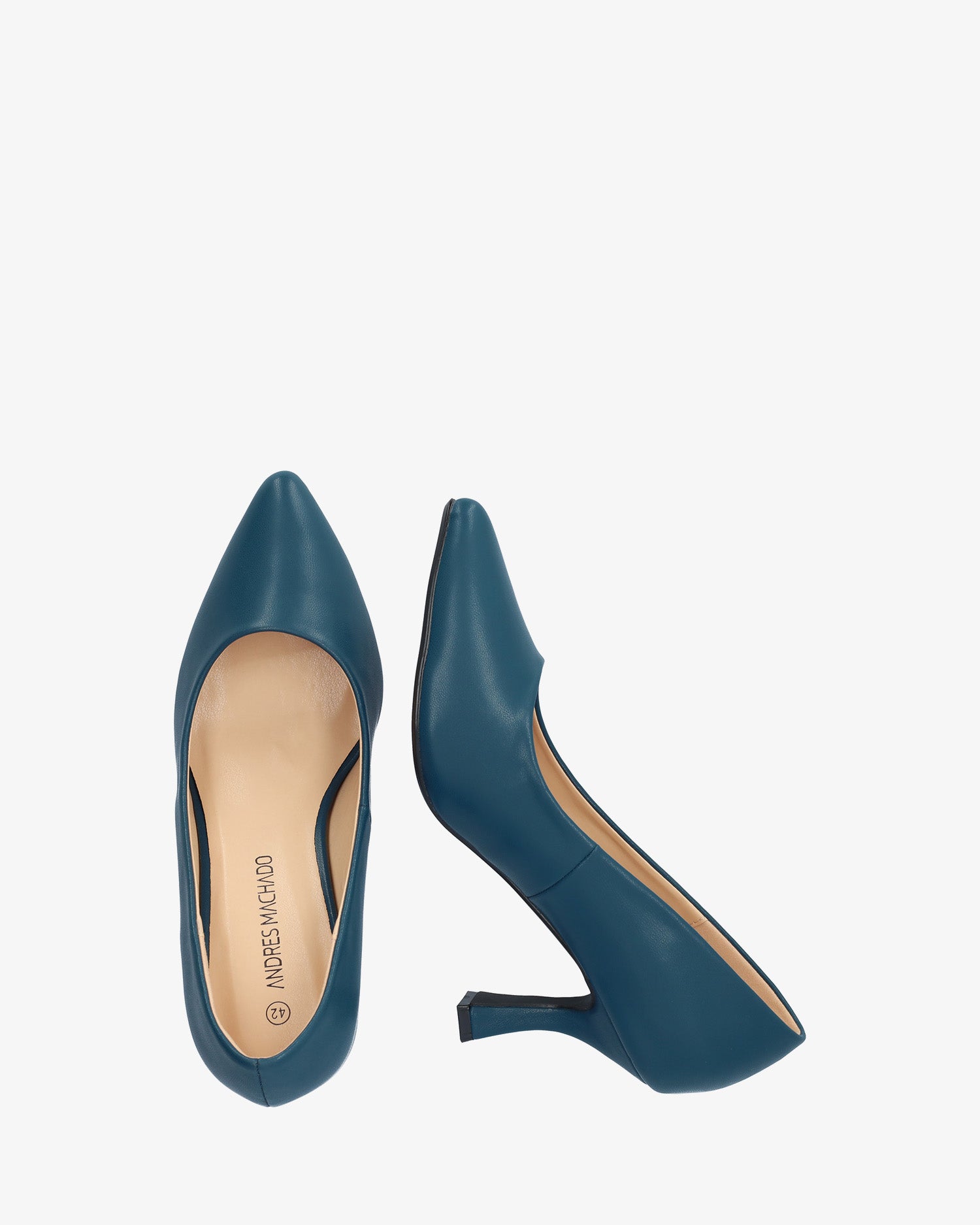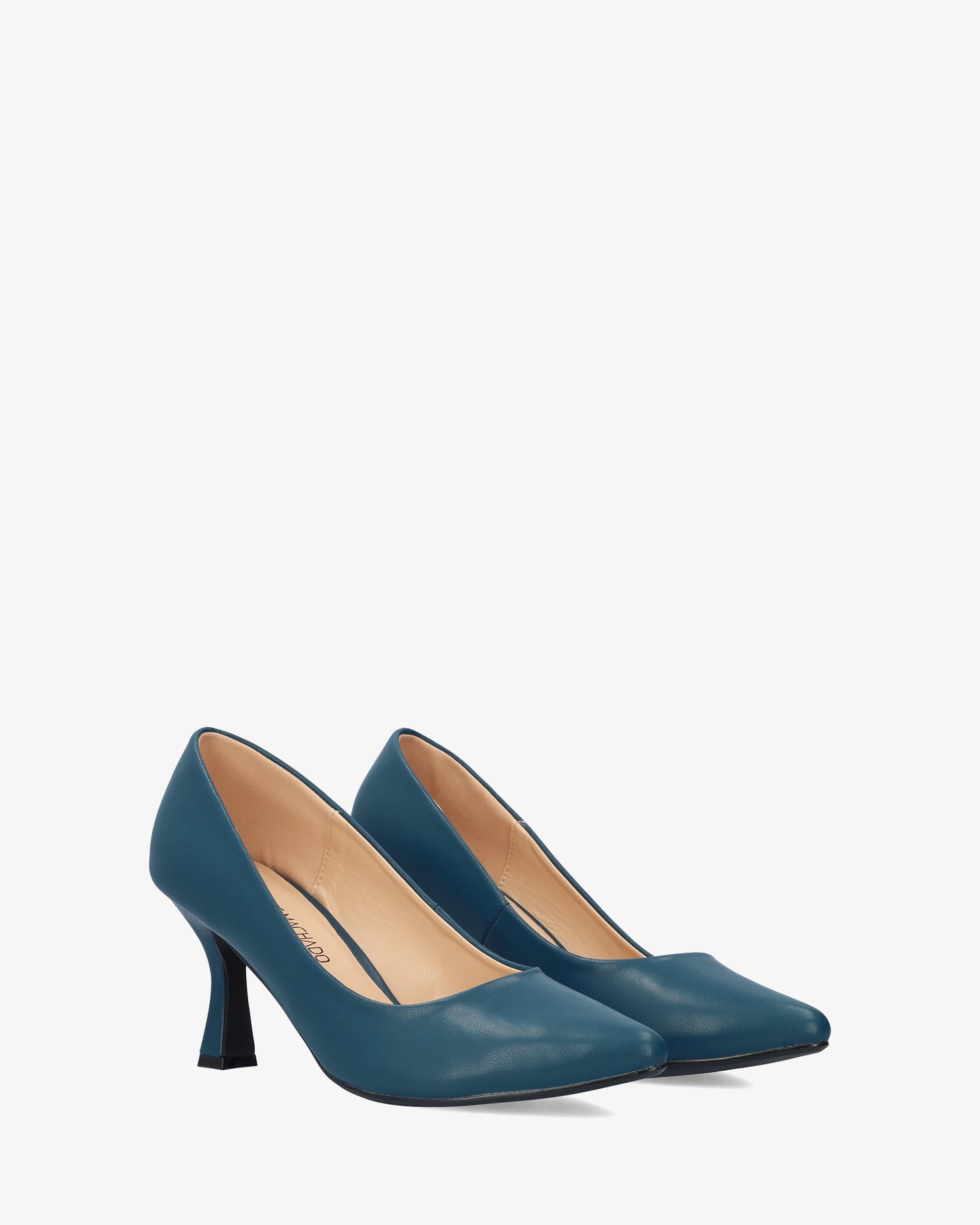 Heeled shoes in blue faux leather. Finished in a pointed toe box. The patent lined kitten heel is 2,73" high for small sizes from 32 to 35 EU and 3,31" high for large sizes from 42 to 45 EU.