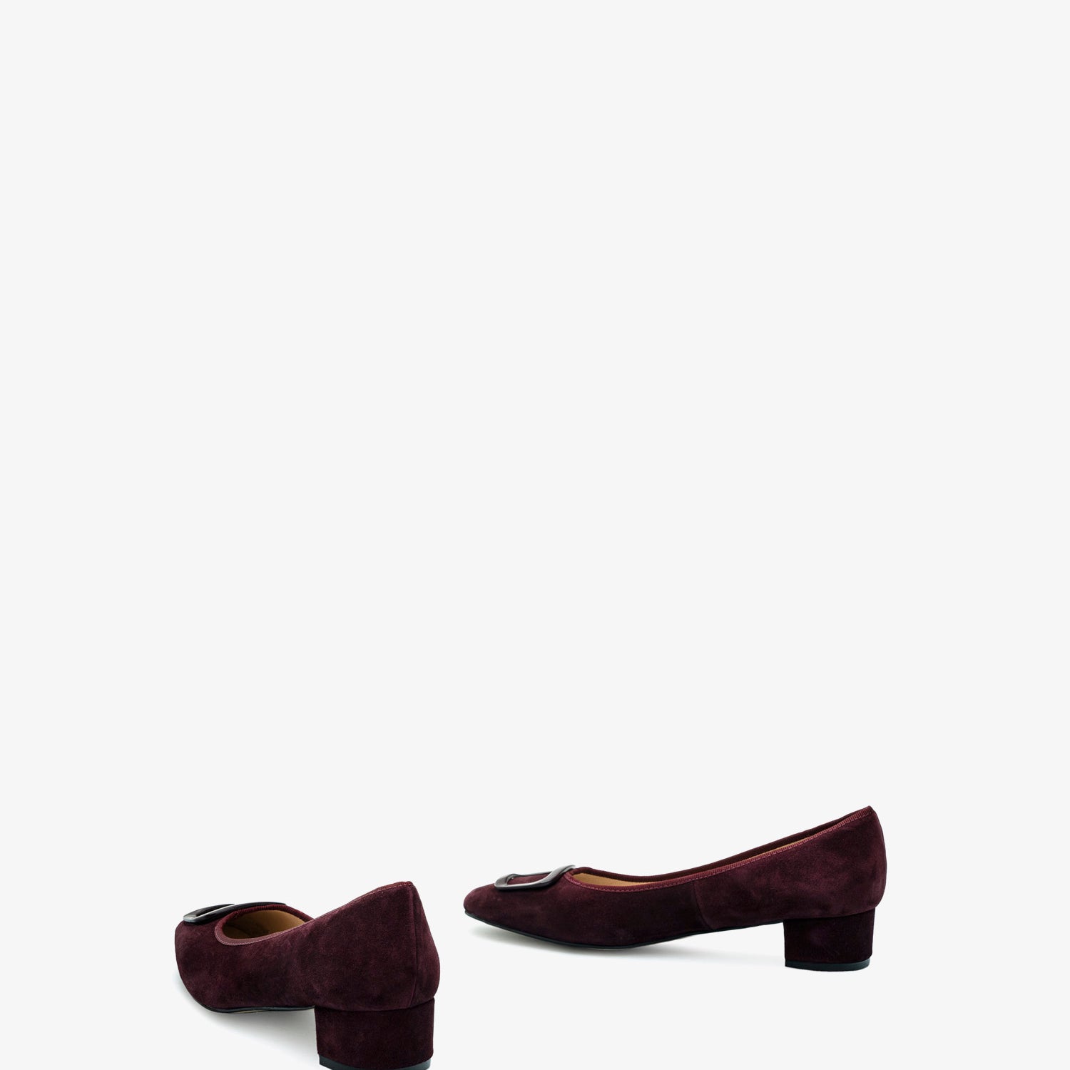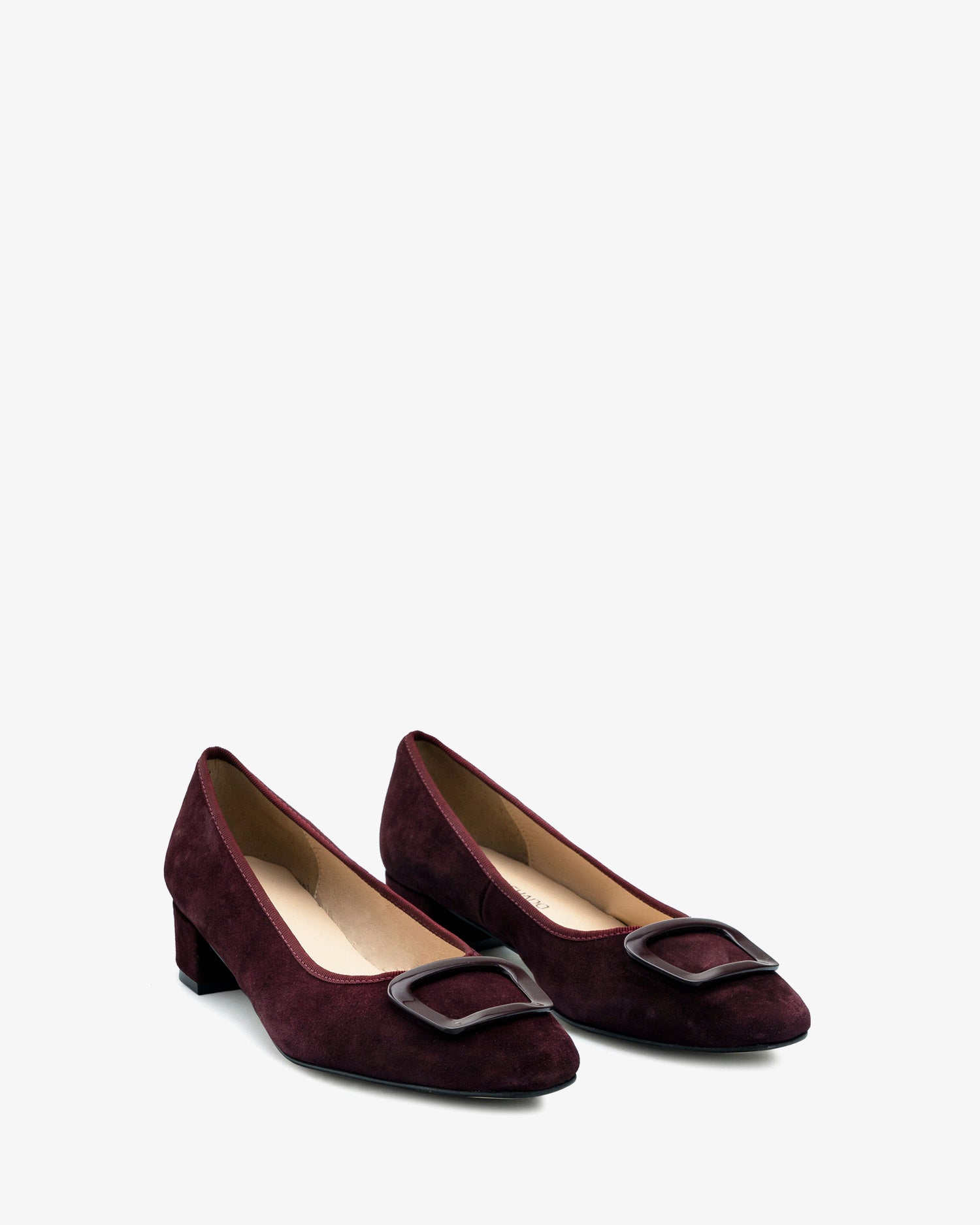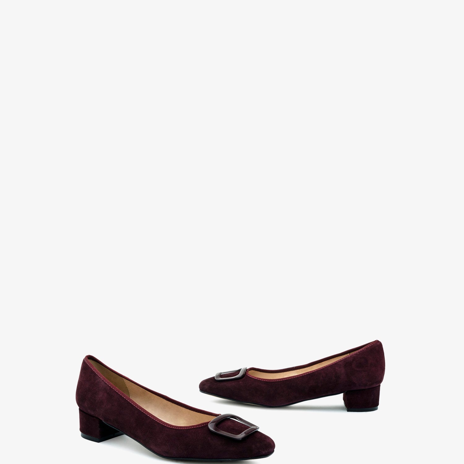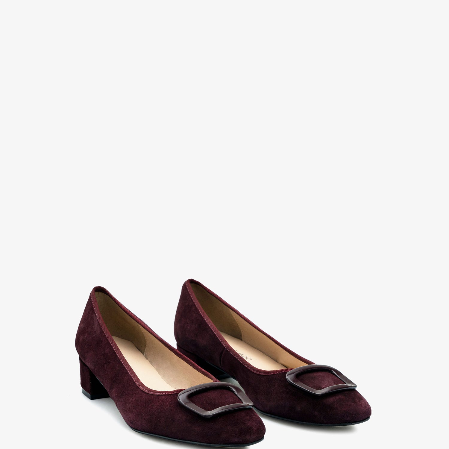 Burgundy coloured split leather heeled shoe. Decorative square-shaped metallic trim on the upper. Square toe finish. Matching edging. Inner lining in camel-colored leather. Wide 3,5cm/ 1.37in heel lined with split leather for small sizes from 32 to 35. 3,5cm/ 1.37in heel for large sizes from 42 to 45. Made in Spain.