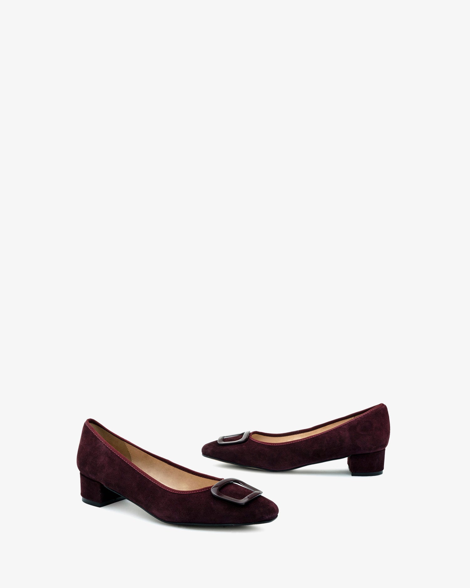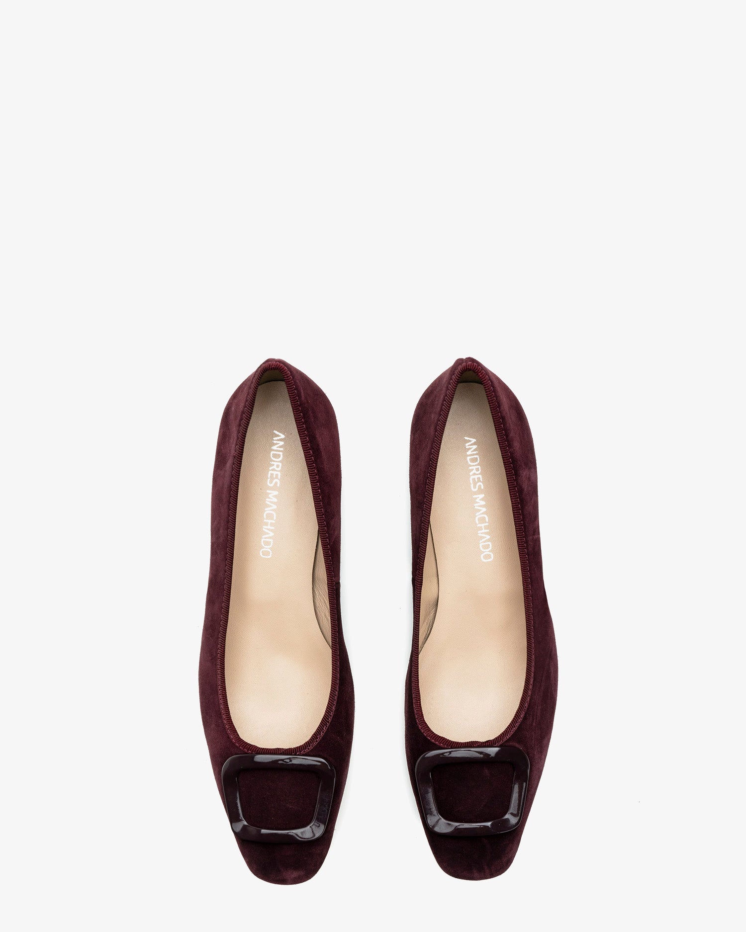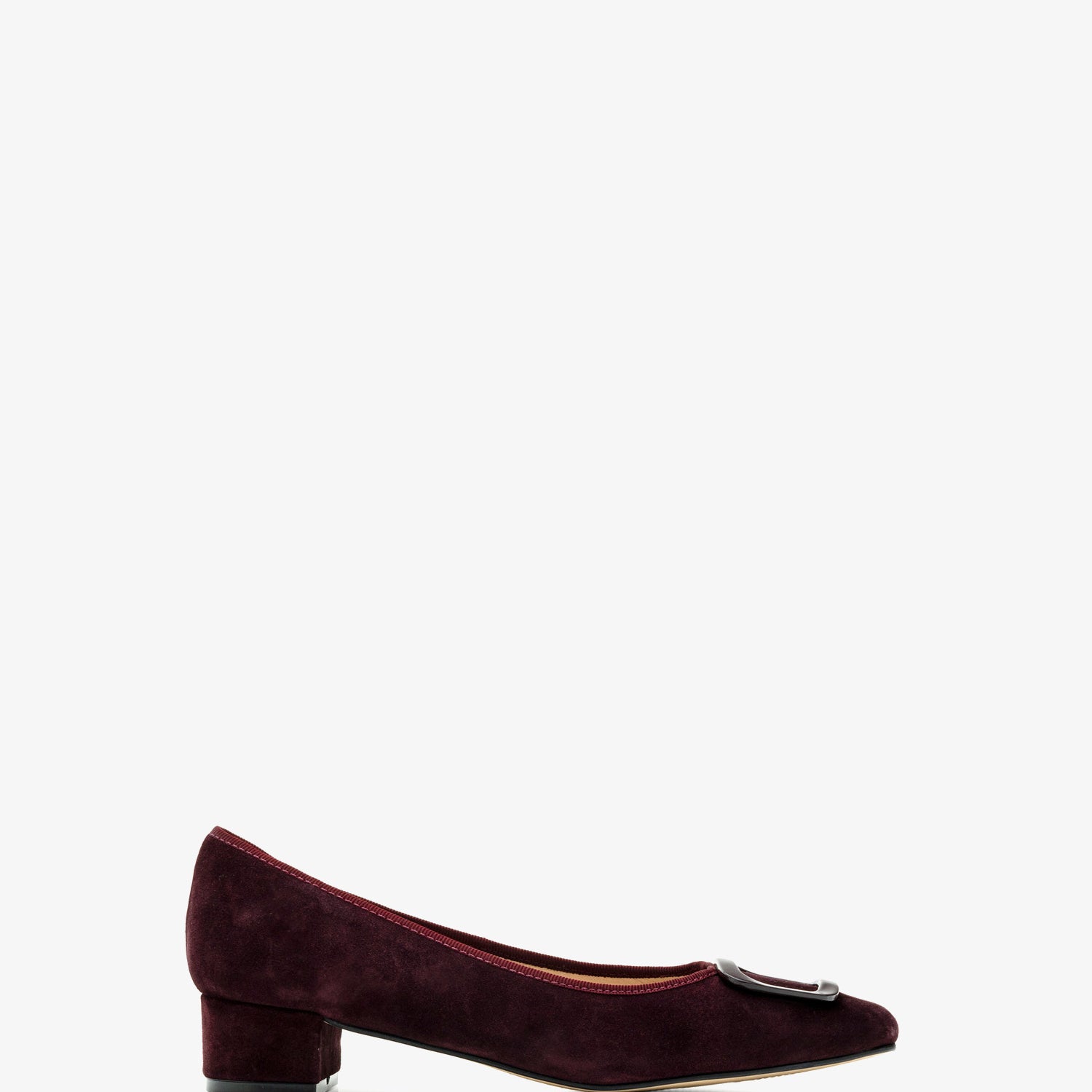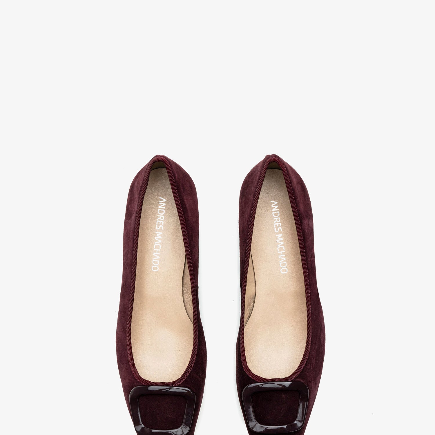 Burgundy coloured split leather heeled shoe. Decorative square-shaped metallic trim on the upper. Square toe finish. Matching edging. Inner lining in camel-colored leather. Wide 3,5cm/ 1.37in heel lined with split leather for small sizes from 32 to 35. 3,5cm/ 1.37in heel for large sizes from 42 to 45. Made in Spain.