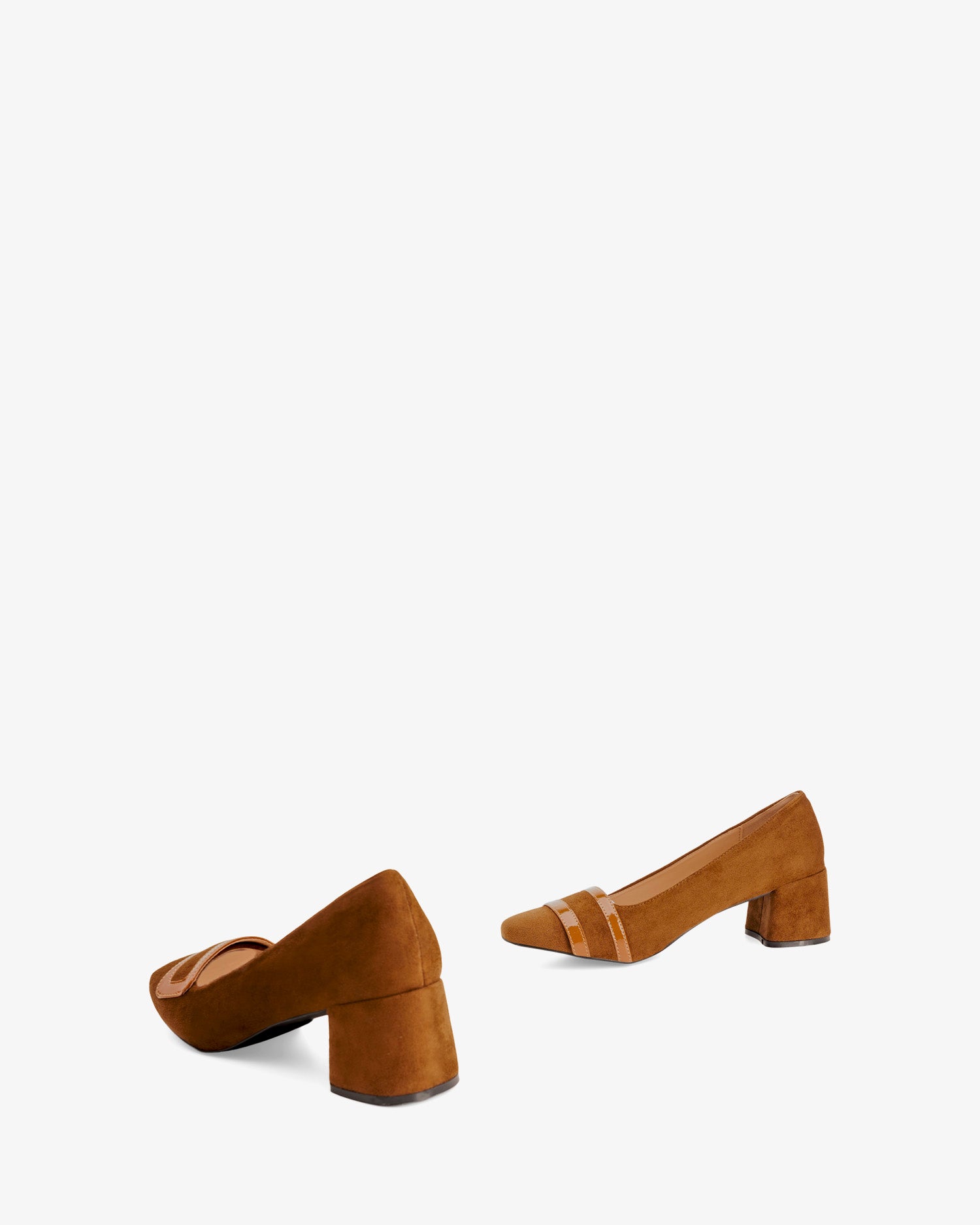 Heeled shoes in camel colored faux suede and matching patent rectangular applique on the vamp. Finished in a square toe. The wide heel is 5.5 cm / 2.16" high for small sizes from 32 to 35 EU and 5.5 cm / 2.16" high for large sizes from 42 to 45 EU. This model may vary from the standard, we recommend you check the cms of the insole.