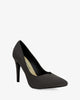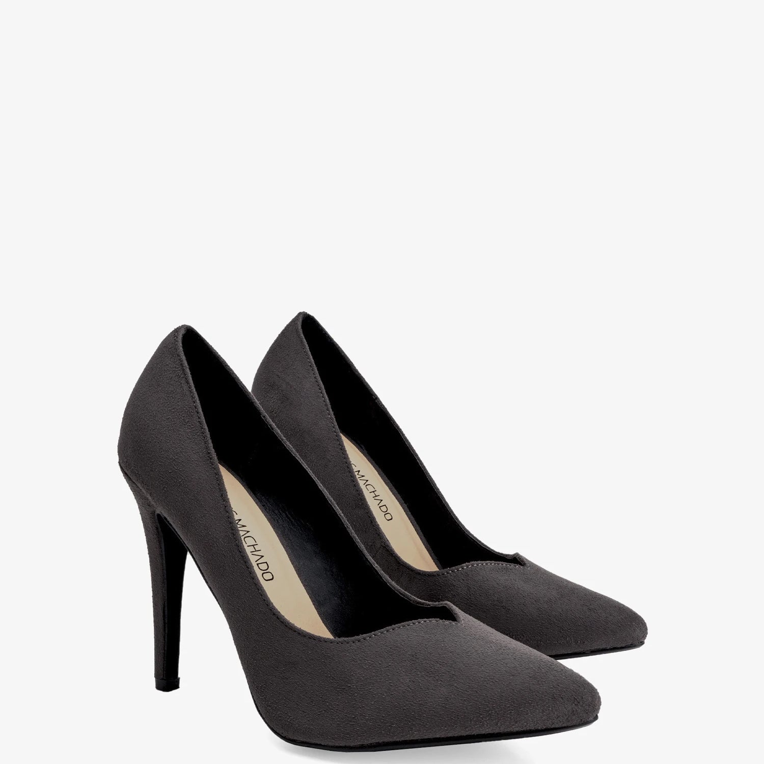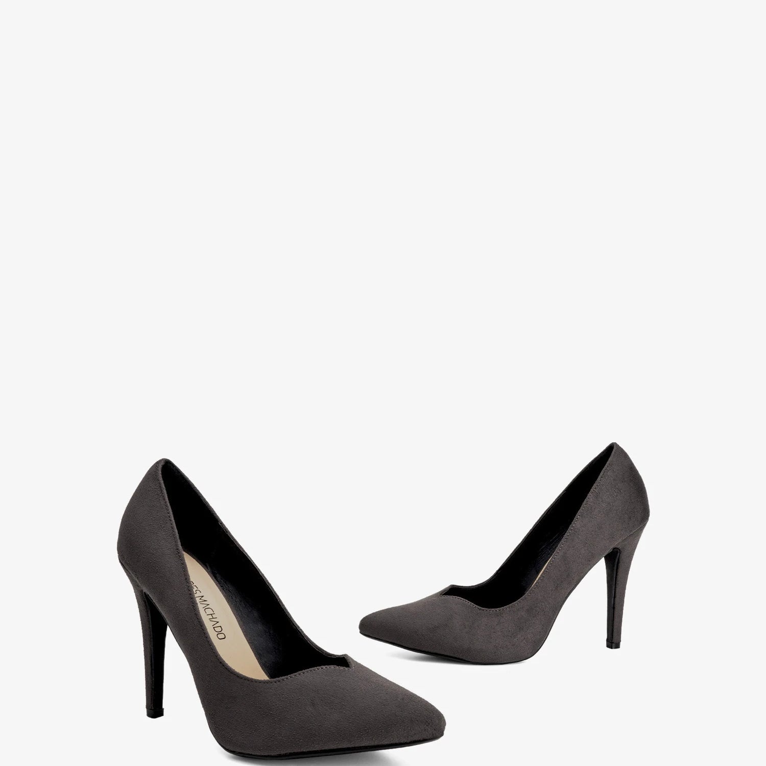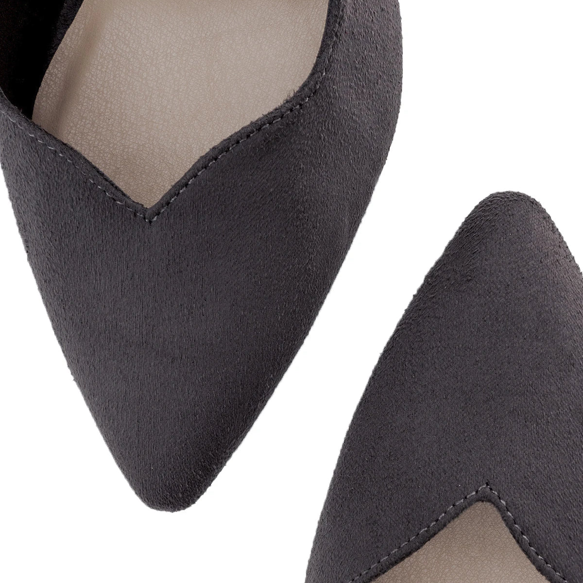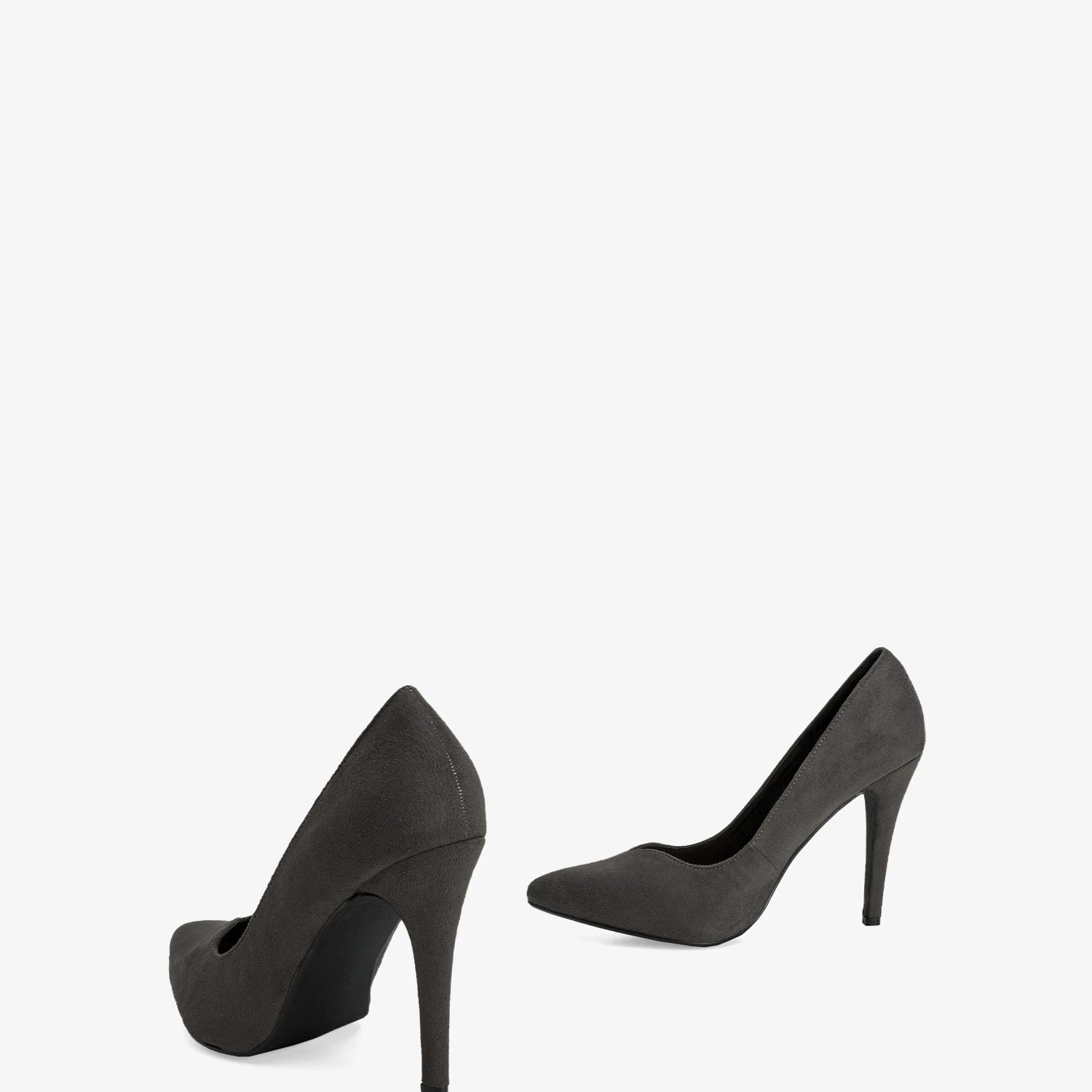 Heeled shoes in grey faux suede, V-shaped vamp and finished in a pointed toe. The thin heel is 9.5 cm / 3.74`` high for small sizes from 32 to 35 EU and 11 cm / 4.33`` high for large sizes from 42 to 45 EU.