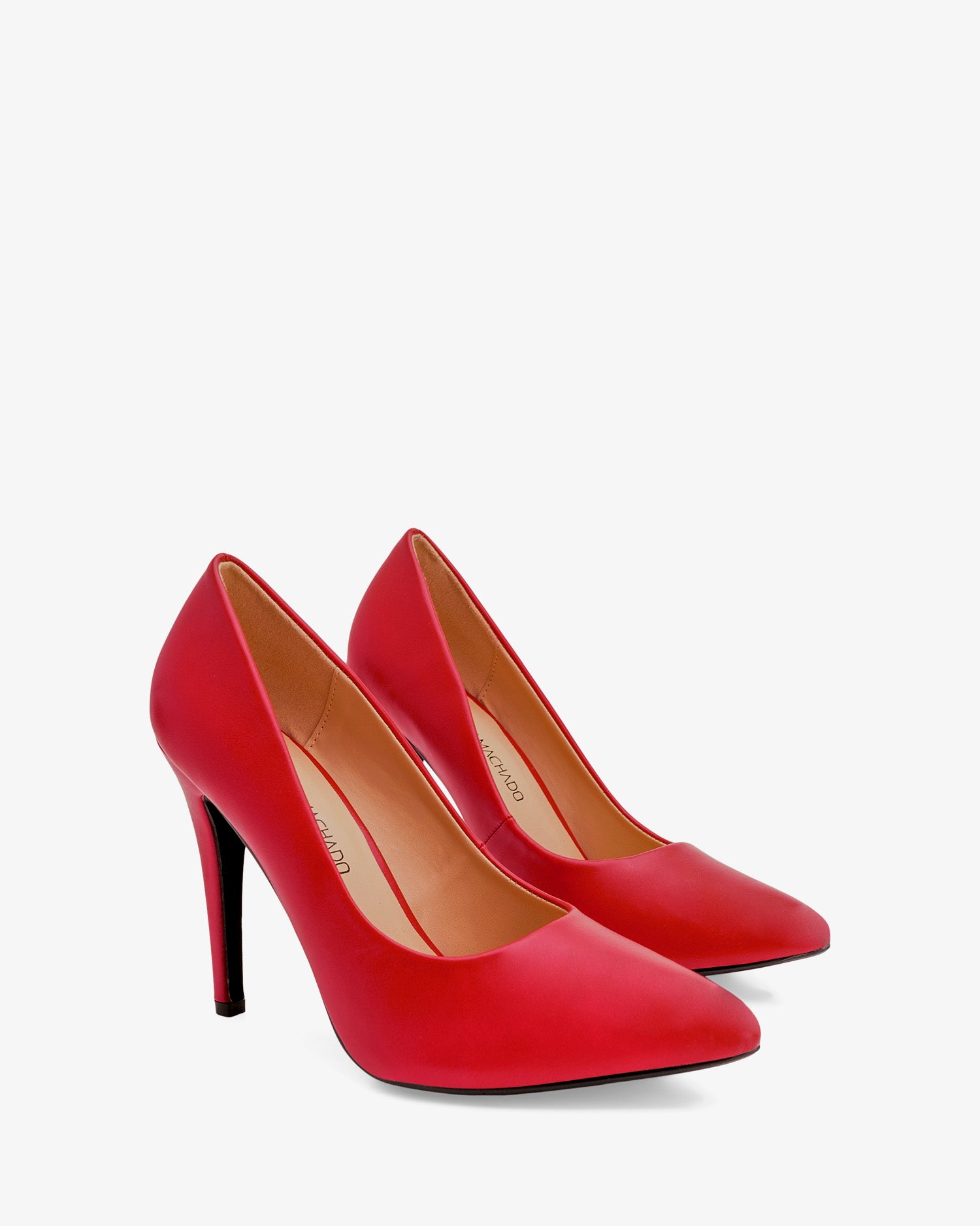 Heeled shoes in rojo faux leather finished in a pointed toe. The thin heel is 9.5 cm / 3.74`` high for small sizes from 32 to 35 EU and 11 cm / 4.33`` high for large sizes from 42 to 45 EU.