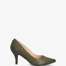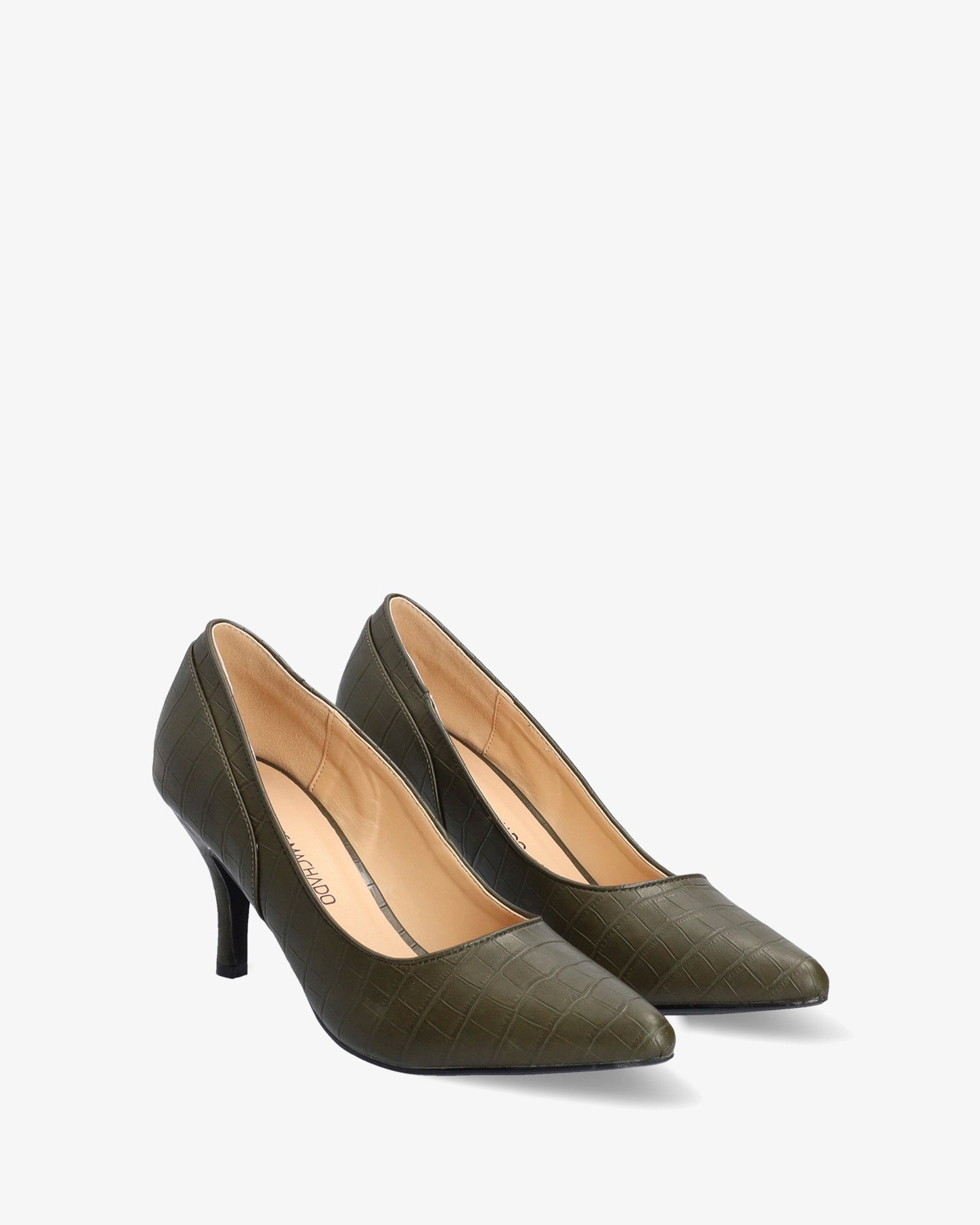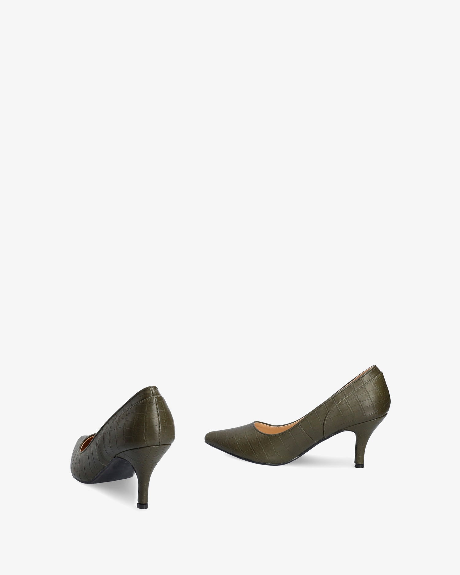 Heeled shoes in kaki colored faux croc, decorative stitching around the heel and finished in a pointed toe. The thin heel is 6 cm / 2.36`` high for small sizes from 32 to 35 EU and 8 cm / 3.14`` high for large sizes from 42 to 45 EU.