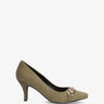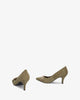 Heeled shoes in kaki faux suede and gold chain links detail on the vamp. Finished in a pointed toe. The thin heel is 6 cm / 2.36" high for small sizes from 32 to 35 EU and 8 cm / 3.14" high for large sizes from 42 to 45 EU. This model fits small, we recommend taking one size larger than usual.
