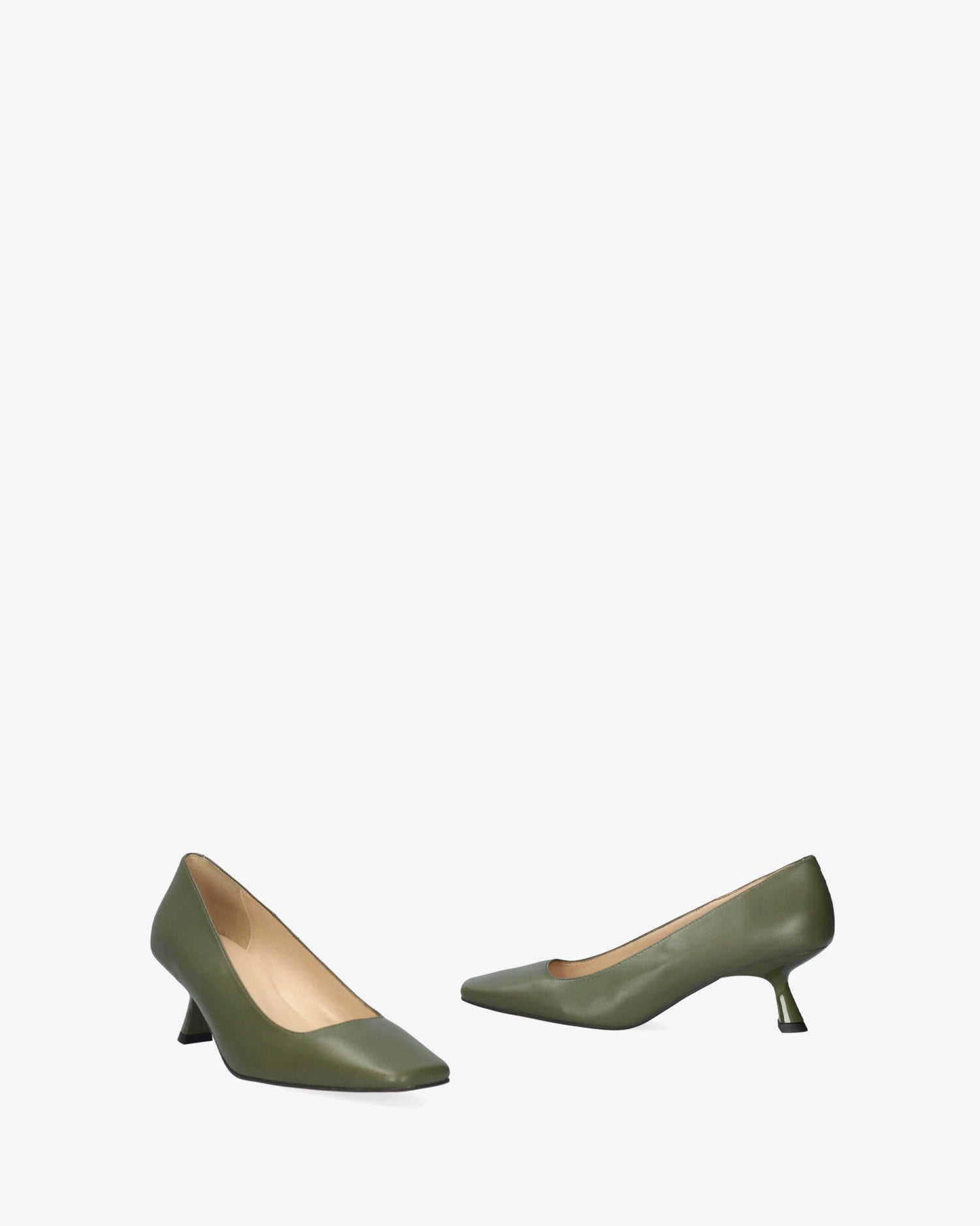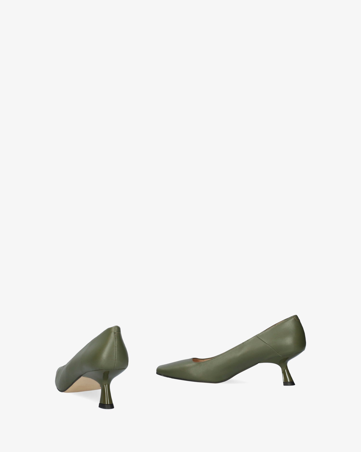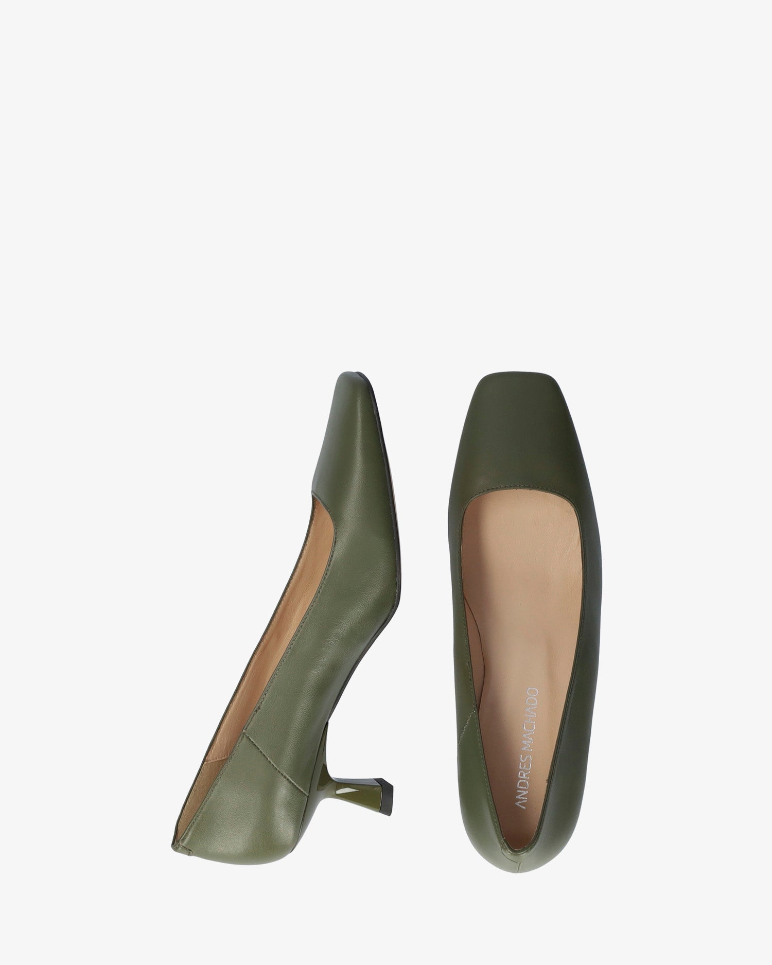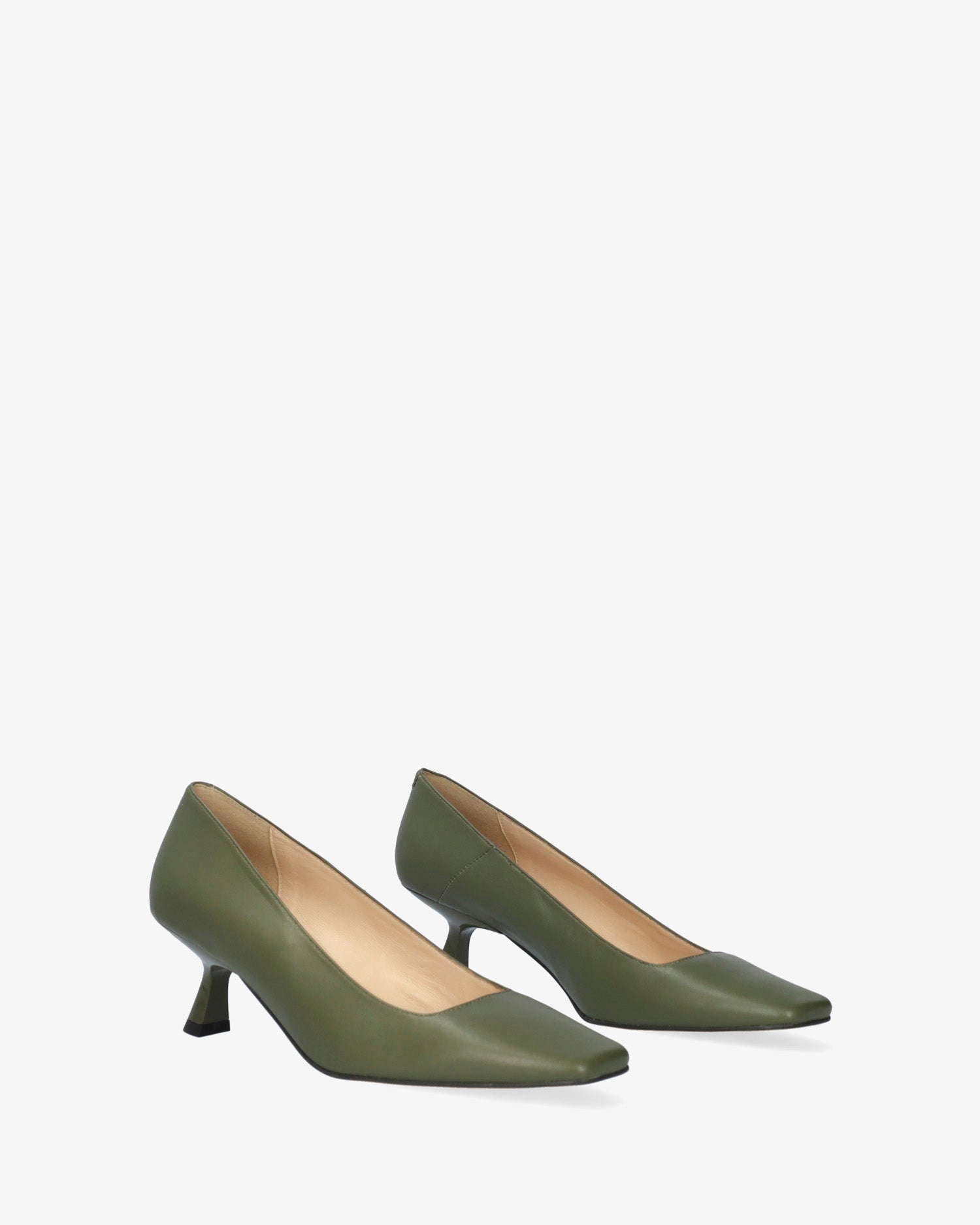 Heeled shoes in kaki leather. Finished in a square toe box. Beige leather inner lining. The patent lined kitten heel is 5.5 cm / 2.16`` high for small sizes from 32 to 35 EU, 5.5 cm / 2.16`` high for medium sizes from 36 to 41 EU and 6 cm / 2.36`` high for large sizes from 42 to 45 EU. Made in Spain.