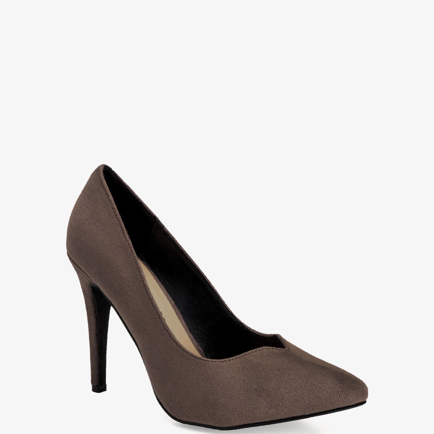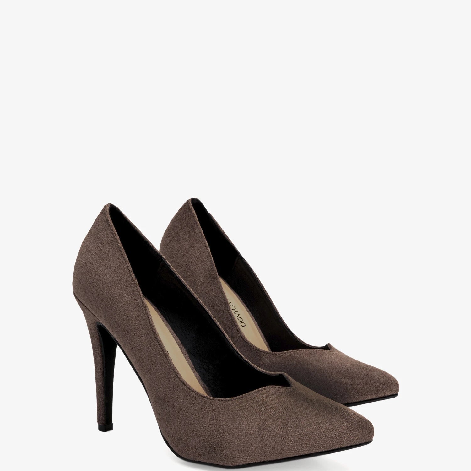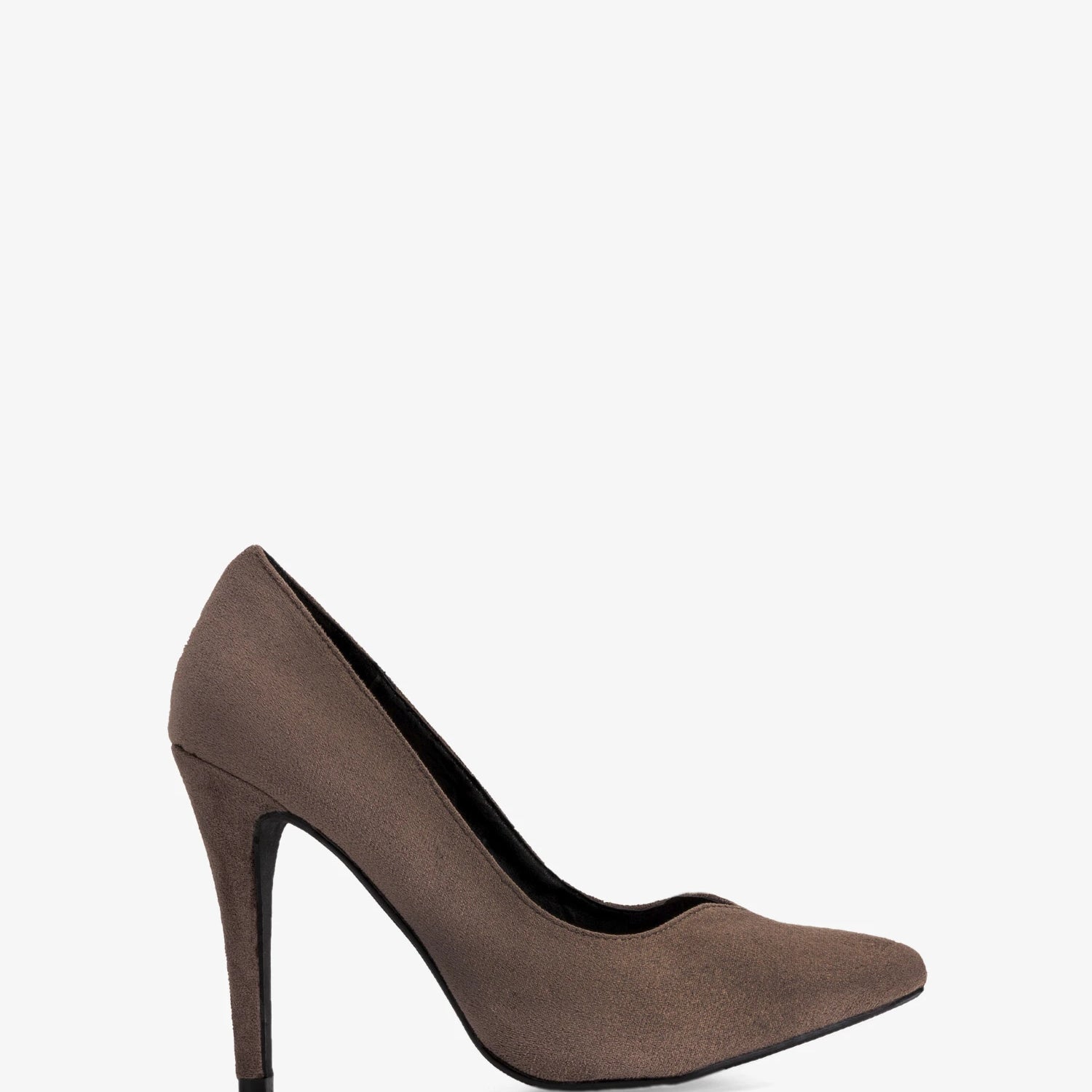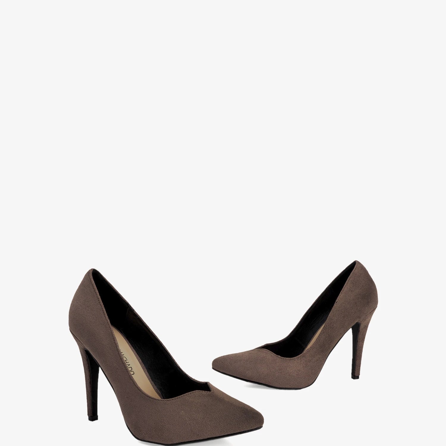Heeled shoes in light brown faux suede, V-shaped vamp and finished in a pointed toe. The thin heel is 9.5 cm / 3.74`` high for small sizes from 32 to 35 EU and 11 cm / 4.33`` high for large sizes from 42 to 45 EU.