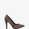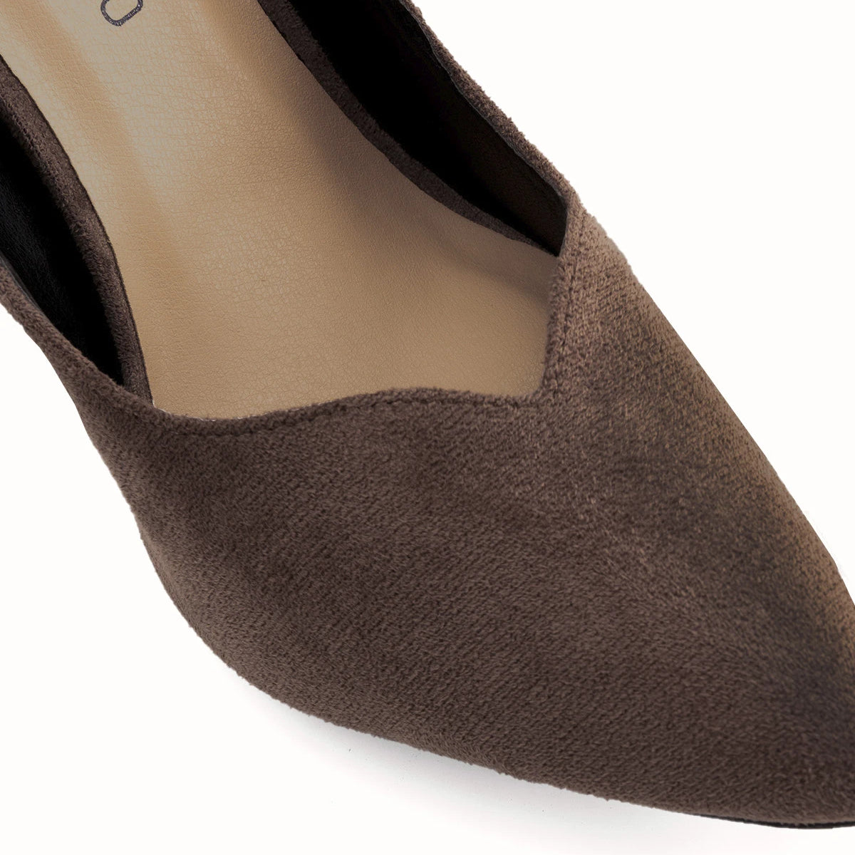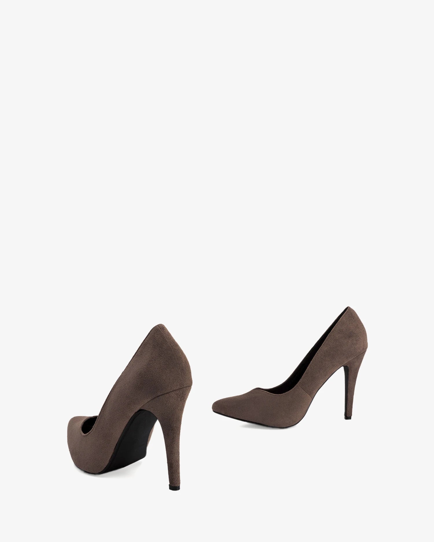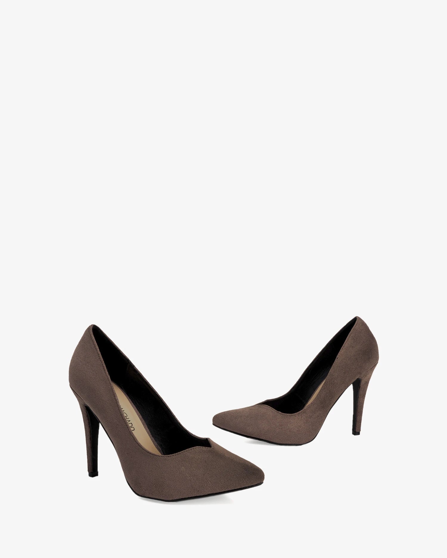 Heeled shoes in light brown faux suede, V-shaped vamp and finished in a pointed toe. The thin heel is 9.5 cm / 3.74`` high for small sizes from 32 to 35 EU and 11 cm / 4.33`` high for large sizes from 42 to 45 EU.