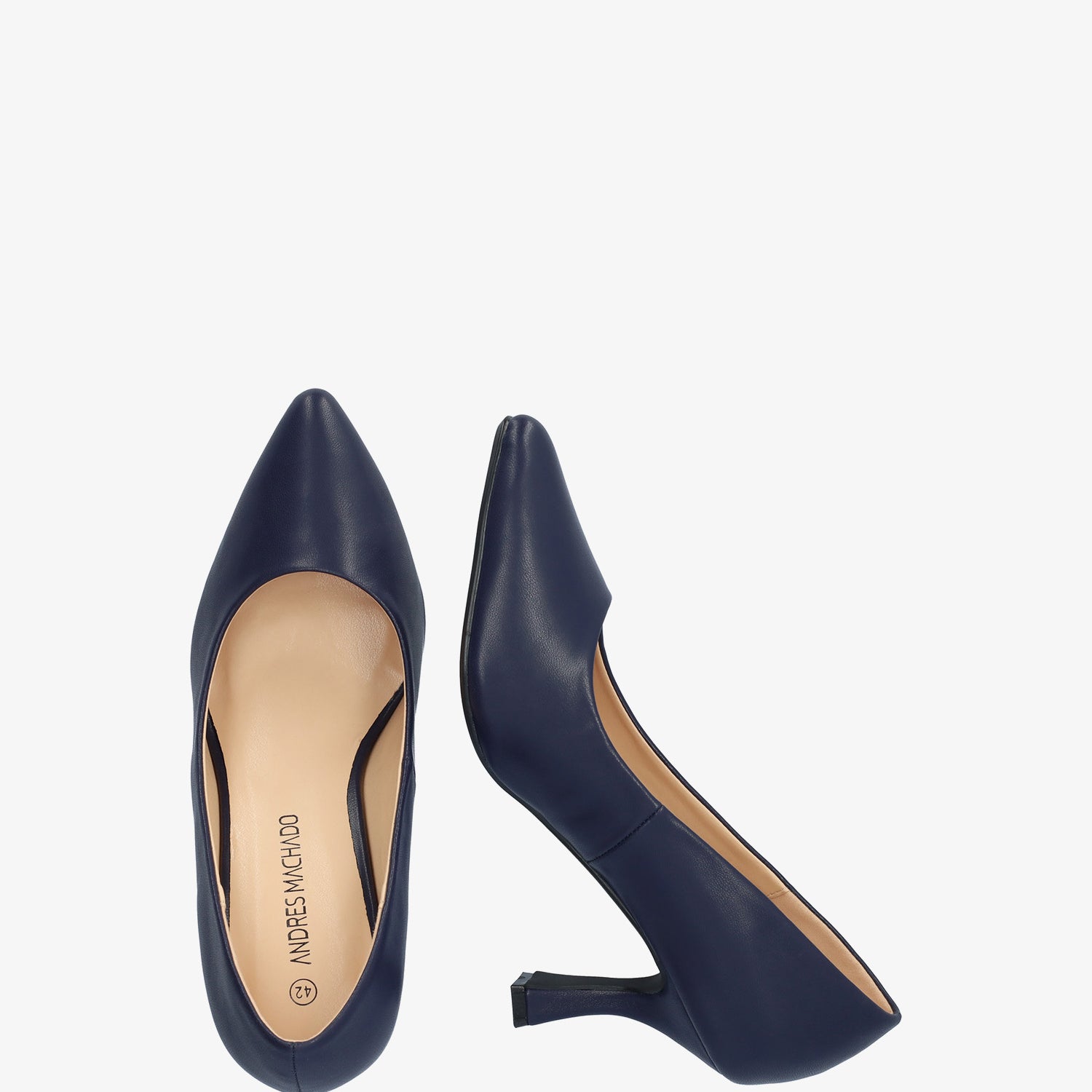 Heeled shoes in navy faux leather. Finished in a pointed toe box. The patent lined kitten heel is 2,73" high for small sizes from 32 to 35 EU and 3,31" high for large sizes from 42 to 45 EU.