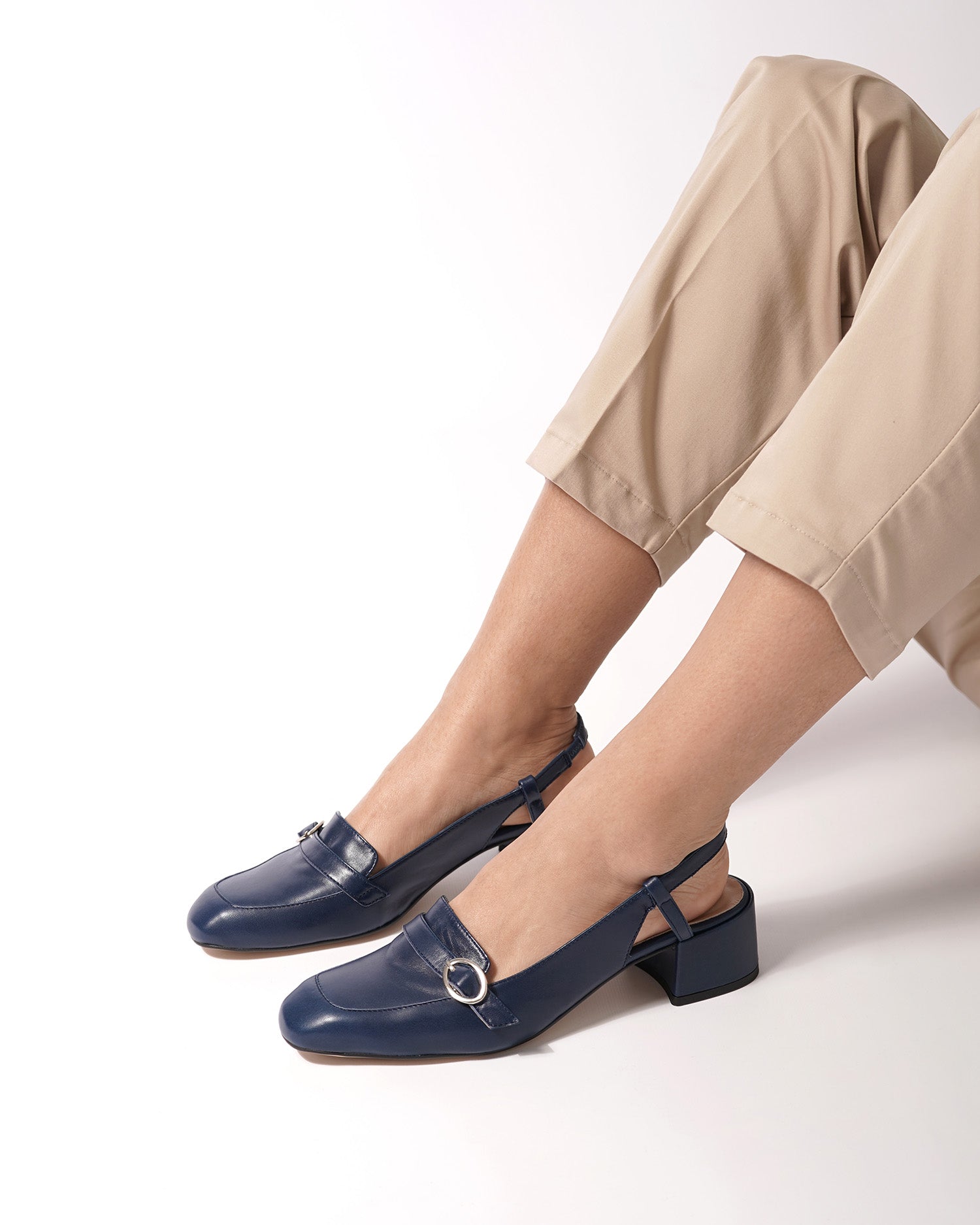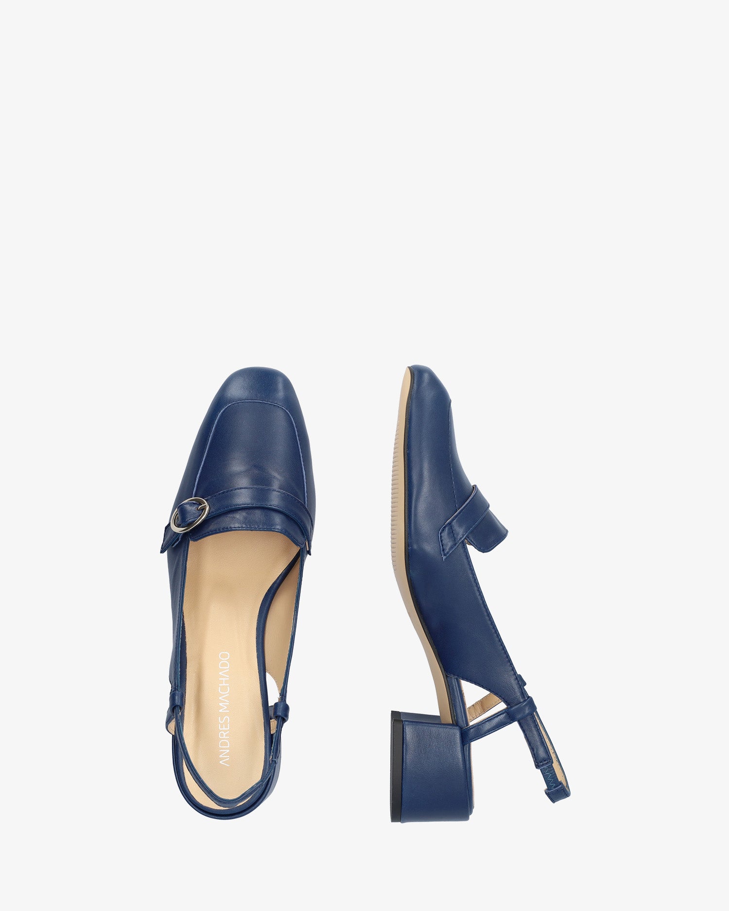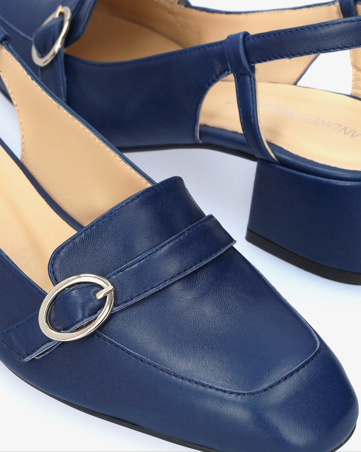Heeled slingback navy leather loafers with a squared toe and a decorative buckled strap over the instep. Matching stitching over the toe and an ankle elastic strap for more security. Inner beige leather lining. The block heel measures 1,77" for small sizes from 32 to 35 and 1,96" for large sizes from 42 to 45. Made in Spain.