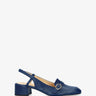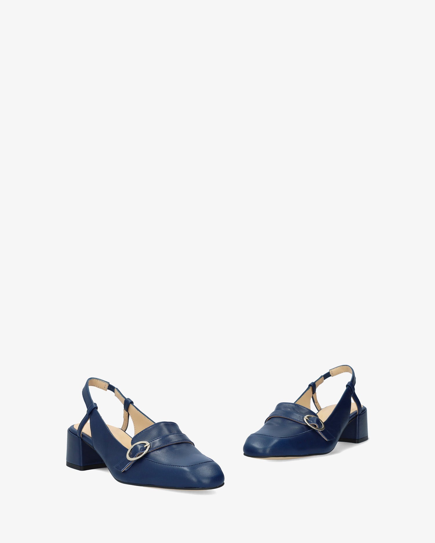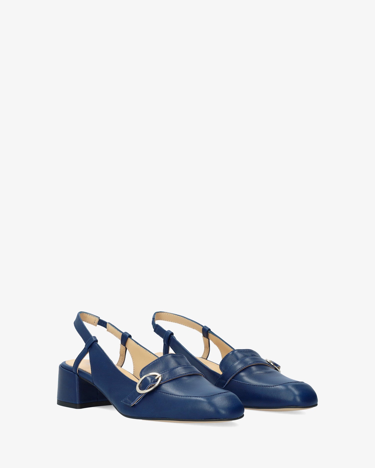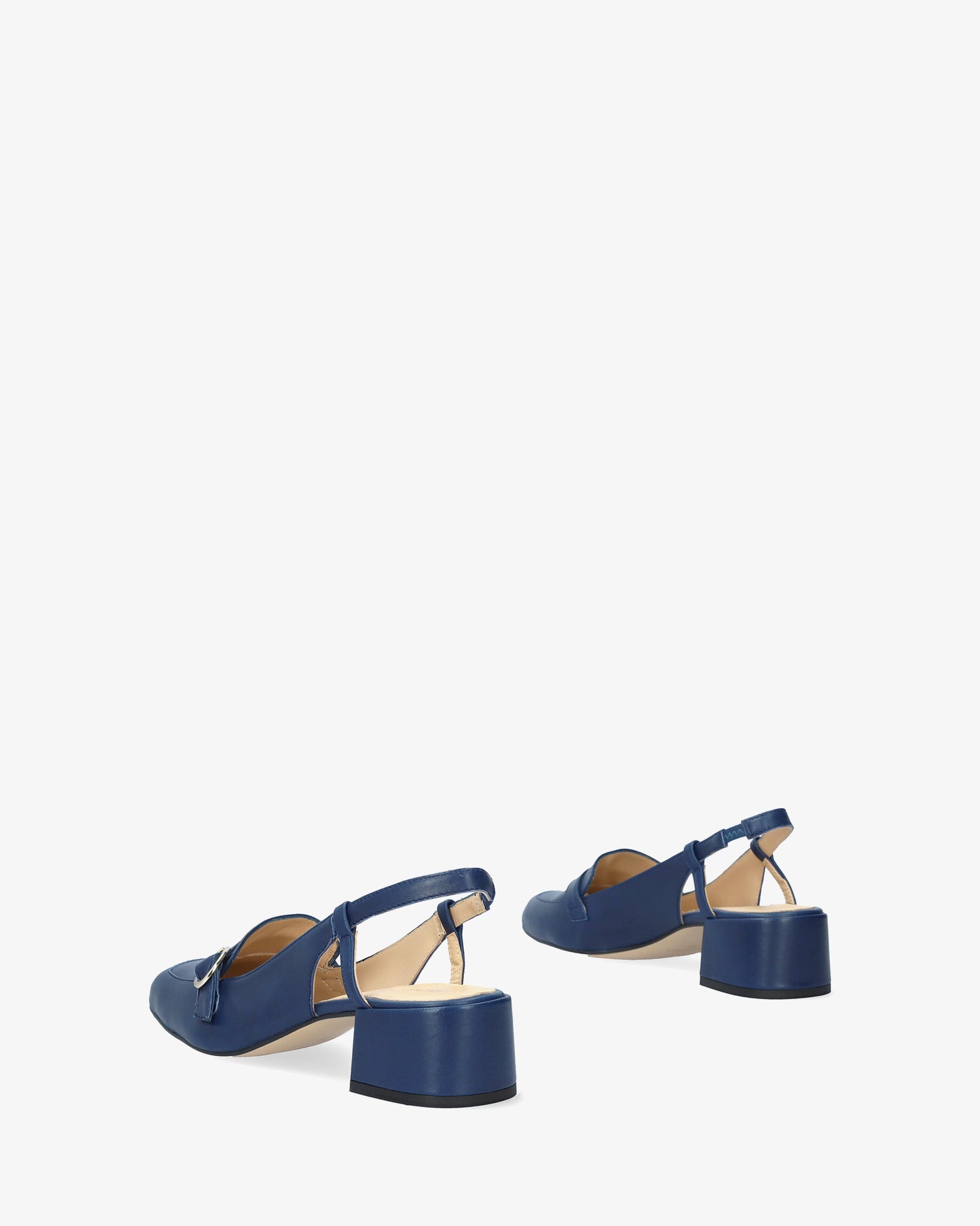 Heeled slingback navy leather loafers with a squared toe and a decorative buckled strap over the instep. Matching stitching over the toe and an ankle elastic strap for more security. Inner beige leather lining. The block heel measures 1,77" for small sizes from 32 to 35 and 1,96" for large sizes from 42 to 45. Made in Spain.