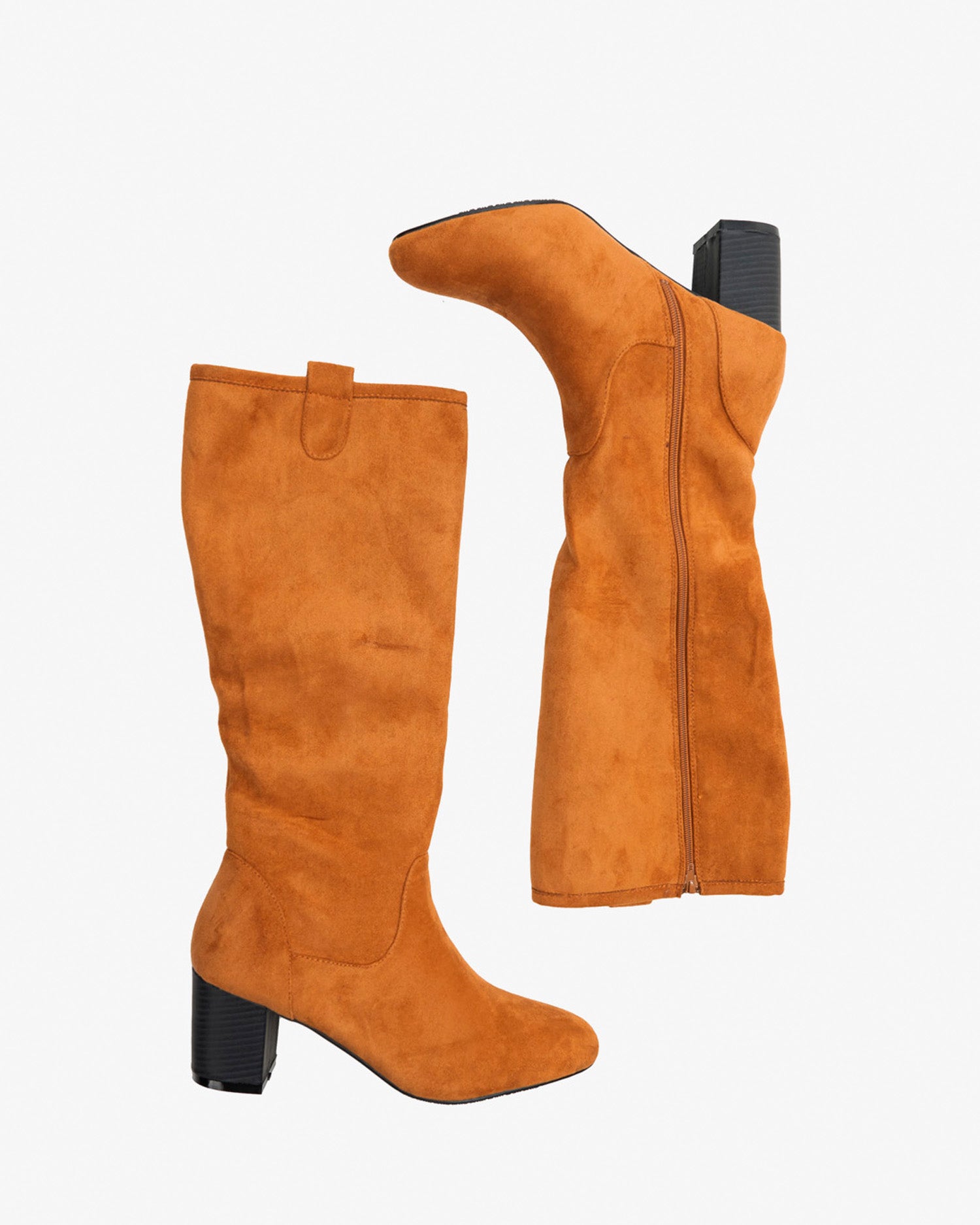High boot in Camel-coloured Suedette. High shaft with Matching zipper closure on the inside. Matching decorative pull tab. Wide wood effect 5,5cm/ 2.16in high heel for small sizes from 32 to 35. 5,5cm/ 2.16in high heel for large sizes from 42 to 45.
