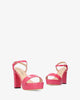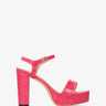 Sandals in fuxia croc soft color with high and wide heel and platform. Open-back design with a wide front strap in the same tone. Metallic buckle closure around the ankle. Heel height of 4,33" and platform height of 1,18" for small sizes from 32 to 35. Heel height of 4,92" and platform height of 1,37" for large sizes from 42 to 45.