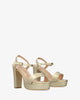 Sandals in golden croc soft color with high and wide heel and platform. Open-back design with a wide front strap in the same tone. Metallic buckle closure around the ankle. Heel height of 4,33" and platform height of 1,18" for small sizes from 32 to 35. Heel height of 4,92" and platform height of 1,37" for large sizes from 42 to 45.