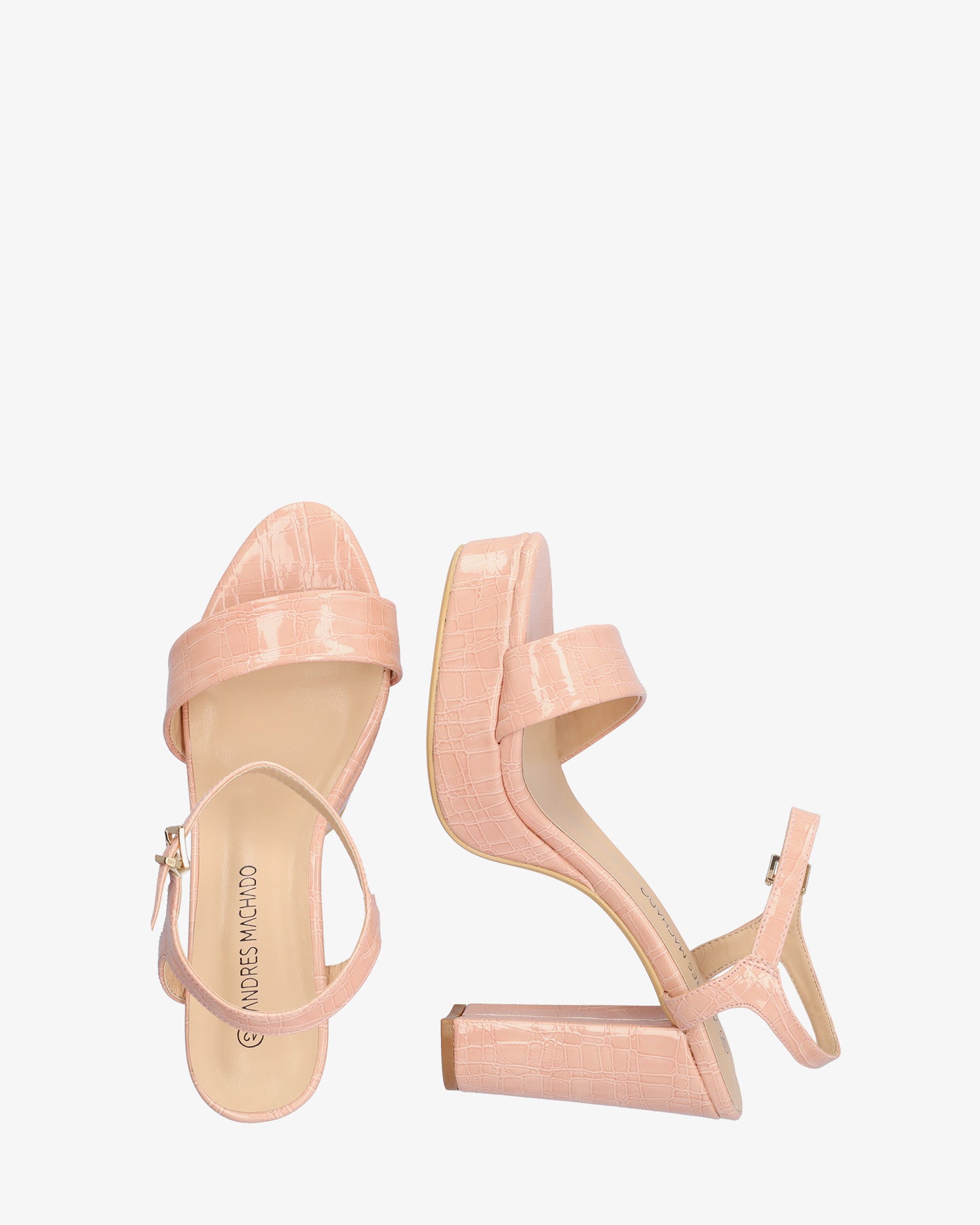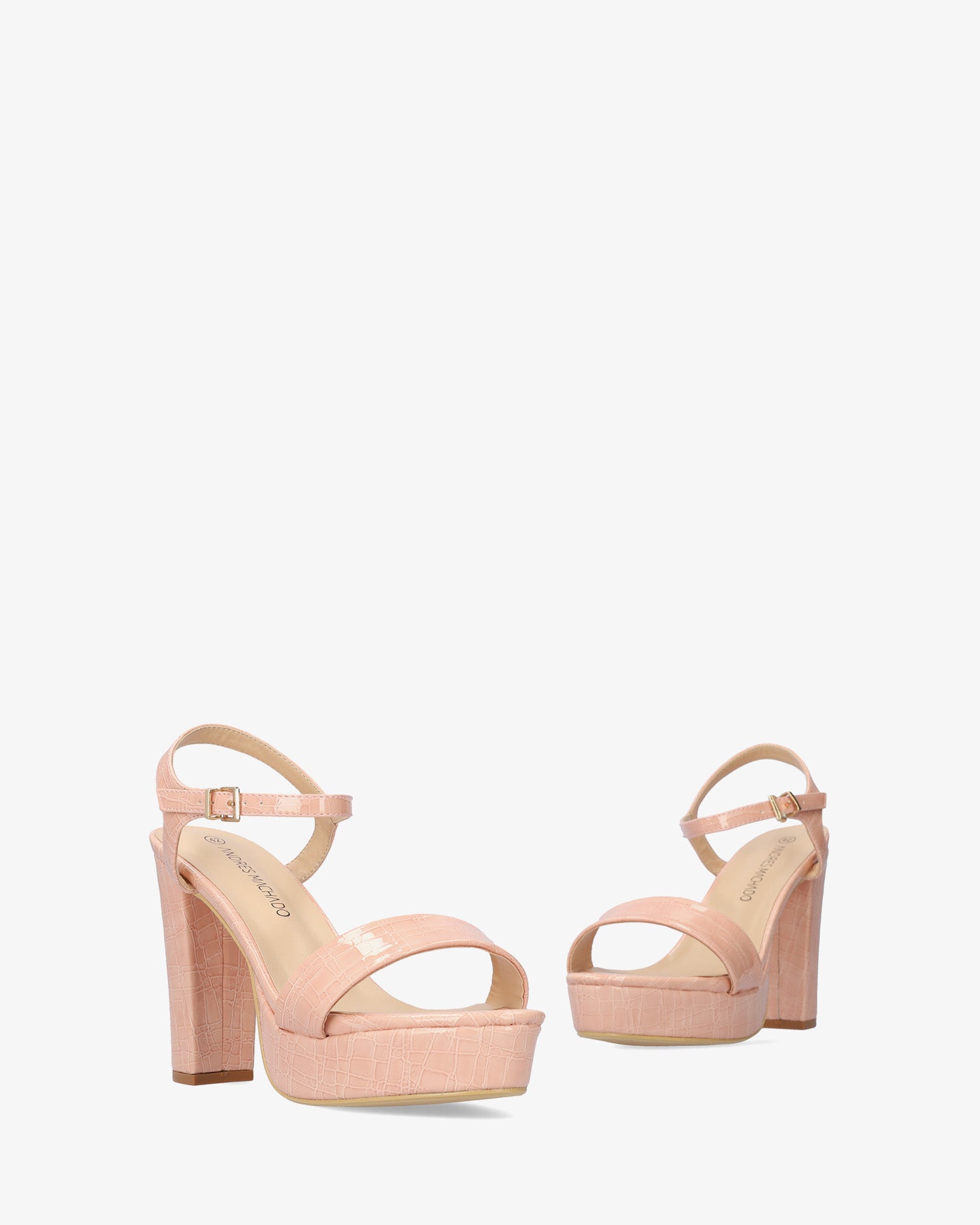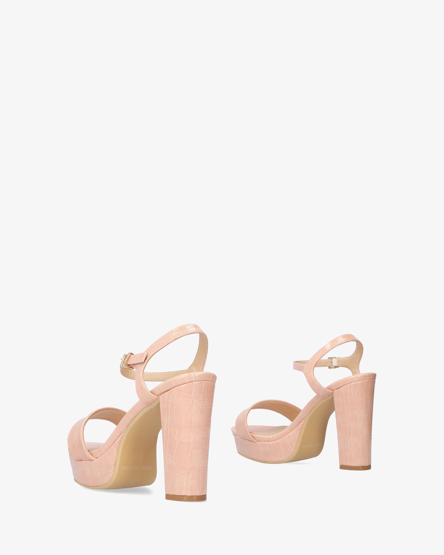 Sandals in nude croc soft color with high and wide heel and platform. Open-back design with a wide front strap in the same tone. Metallic buckle closure around the ankle. Heel height of 4,33" and platform height of 1,18" for small sizes from 32 to 35. Heel height of 4,92" and platform height of 1,37" for large sizes from 42 to 45.