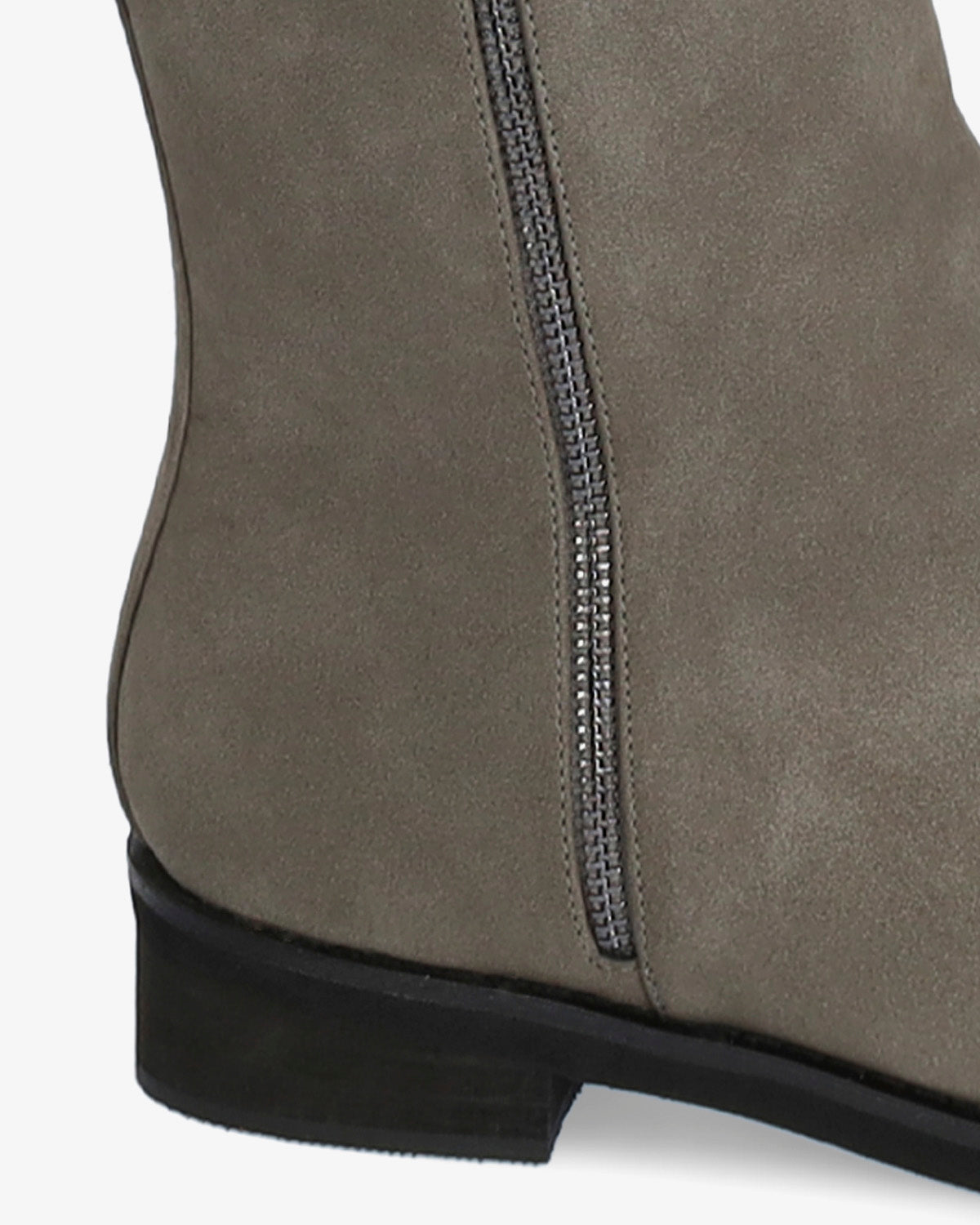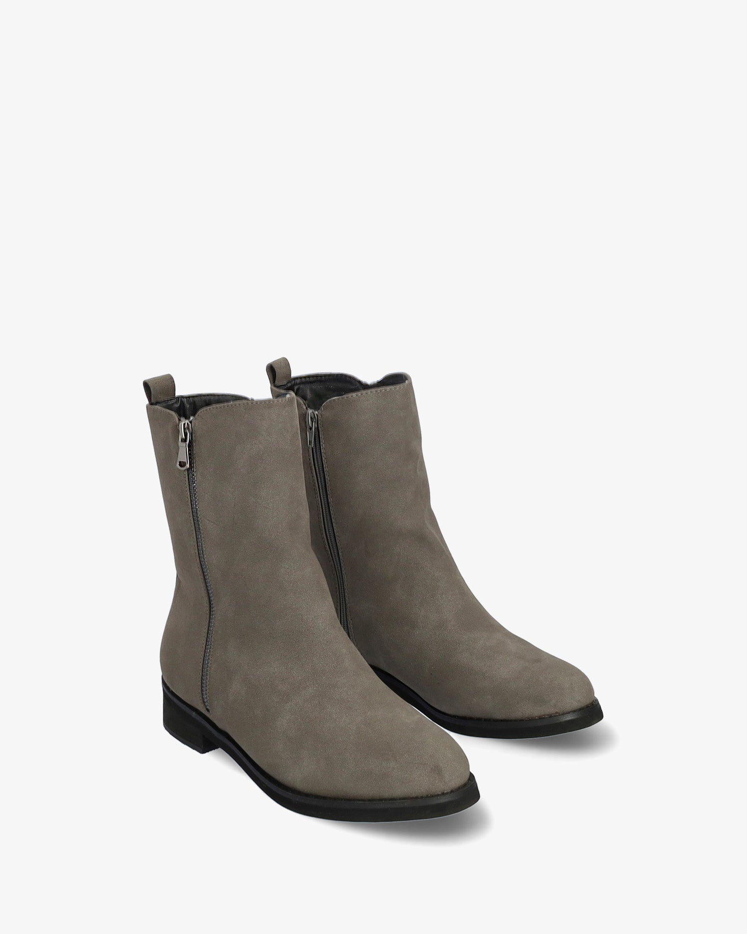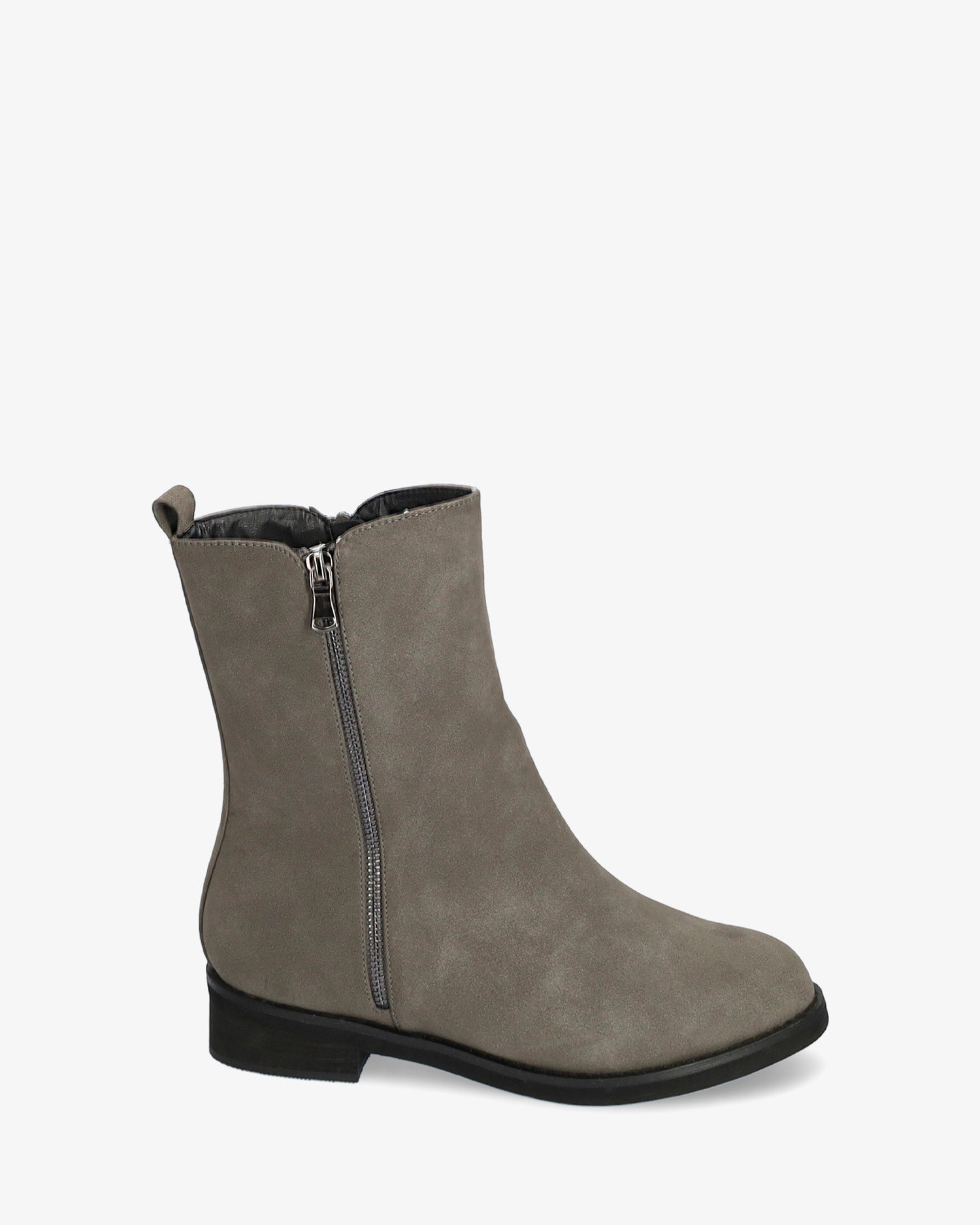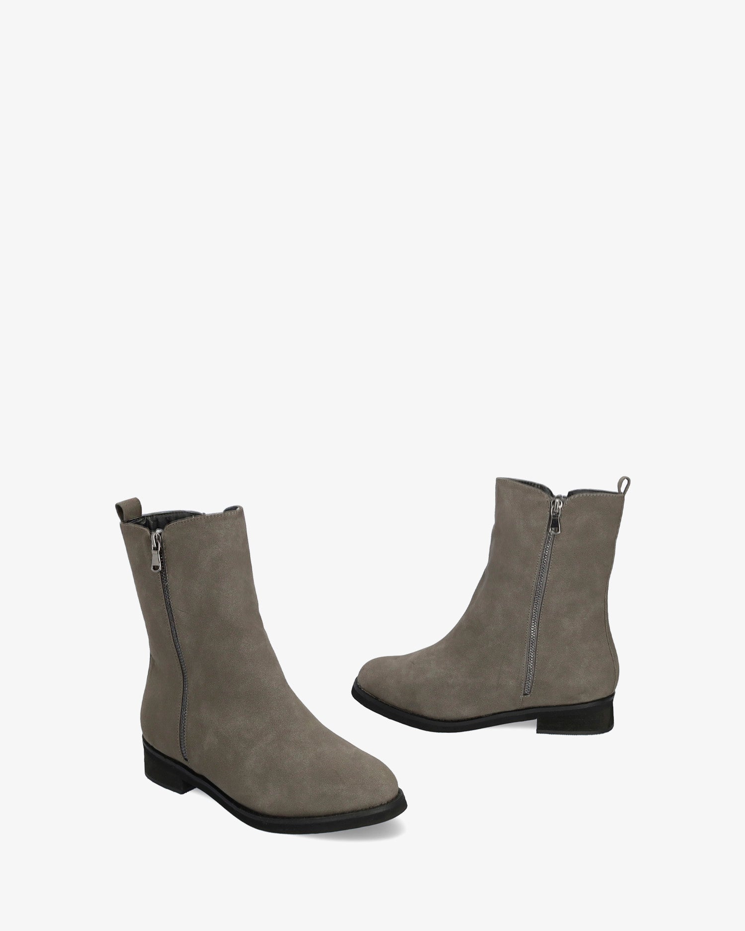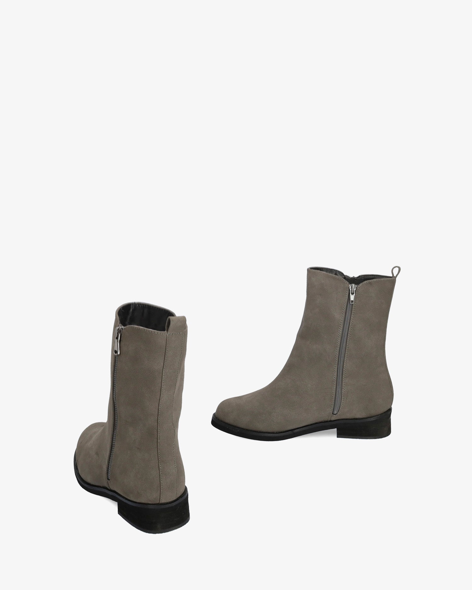 High-top booties in grey colored faux split leather. Matching zipper closure on the internal side of the shaft and decorative zipper on the external side of the shaft. Round toe box and matching heel loop. The heel is finished with a sanded wood texture and is 3 cm / 1.18`` high for large sizes from 42 to 45 EU.