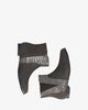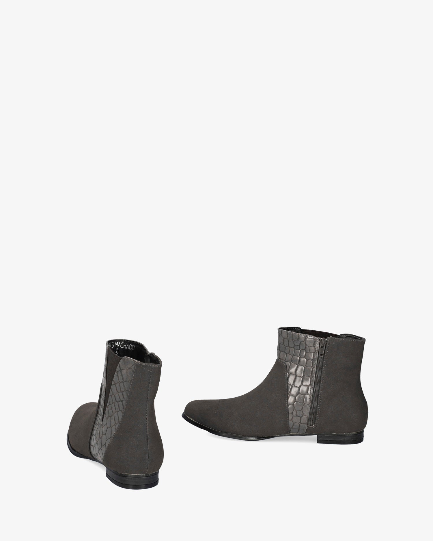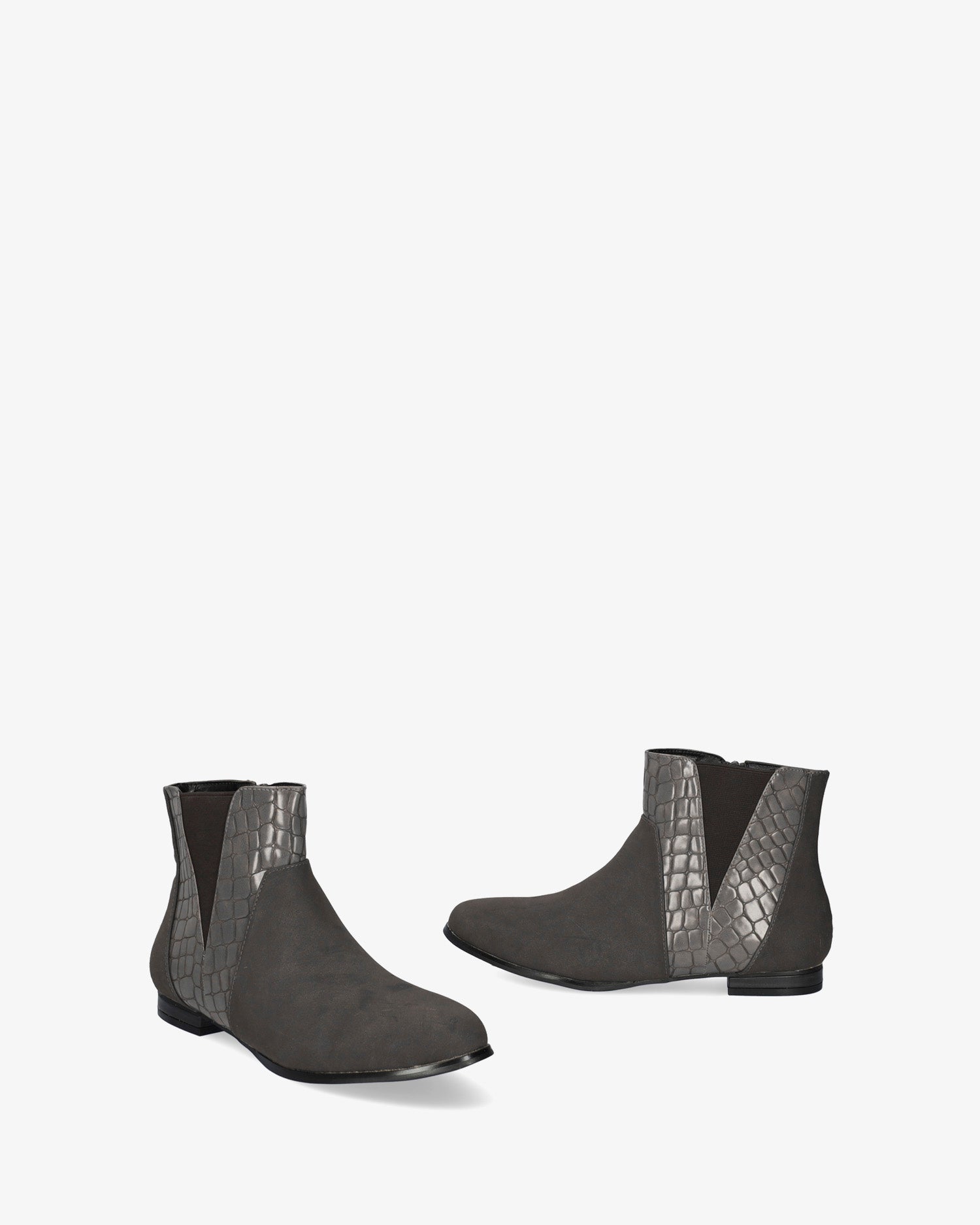High-top booties in combined grey croc faux leather and faux suede. V-shaped elastic on the external side of the shaft. Matching zipper closure on the internal side of the shaft. Almond shaped toe box. The wooden-effect laminated heel is 2 cm / 0.78`` high for lage sizes from 42 to 45 EU.