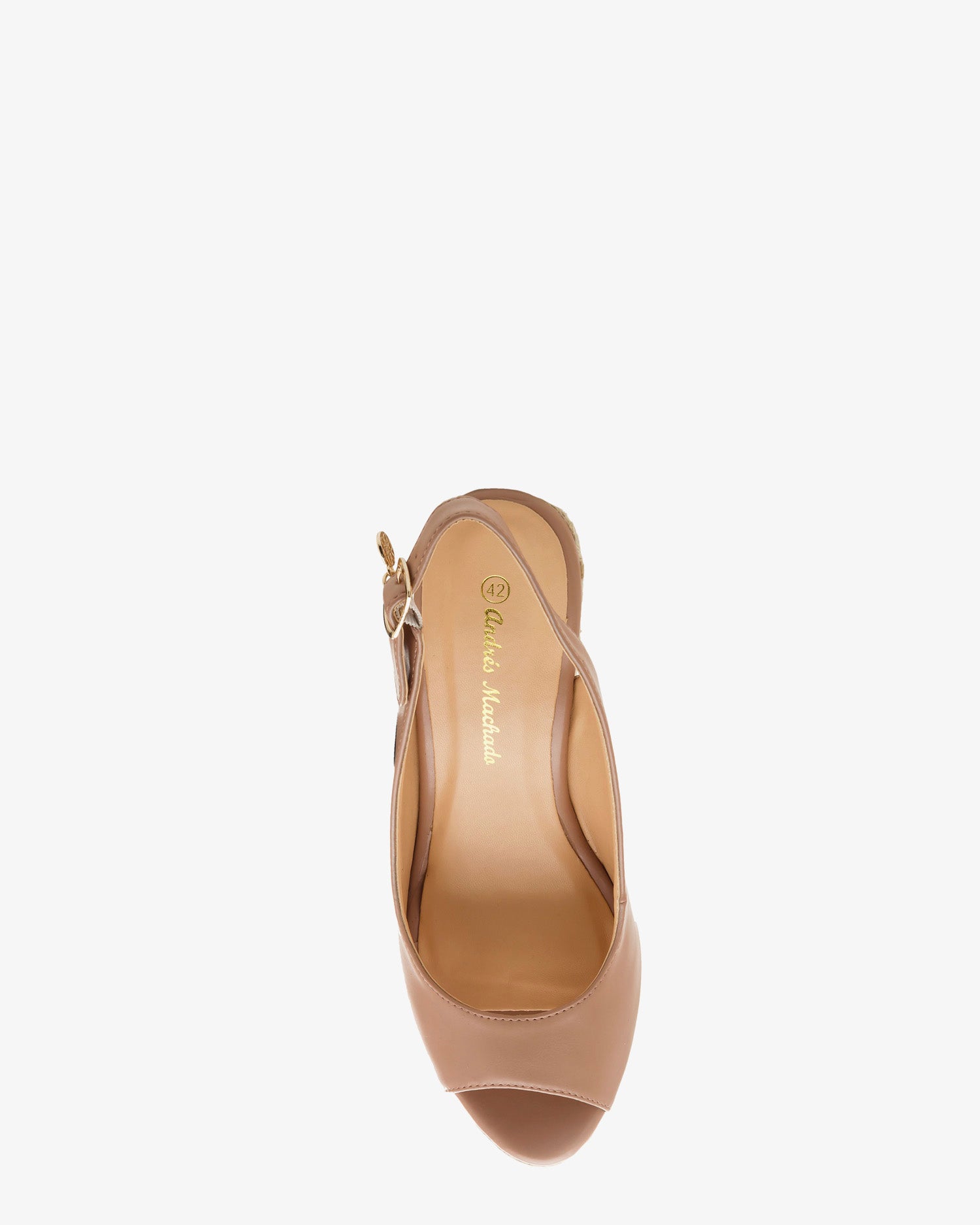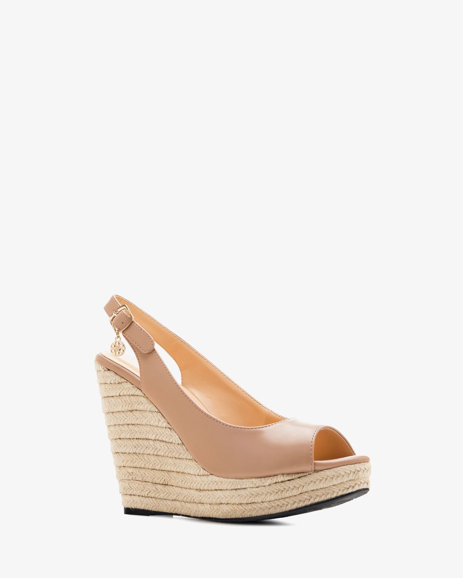 Wedges made of Salmon faux leather. Slingback buckle closure with mini-charm rounded detail, both the buckle and the charm in Gold colour. Braided jute wedge of 4.33" / 11 cm with front platform of 0.79" / 2 cm for Small sizes from UK 0.5 to 2.5 / EU 32 to 35. Braided jute wedge of 5.51" / 14 cm with front platform of 1.18" / 3 cm for Big sizes from UK 8 to 10.5 / EU 42 to 45.