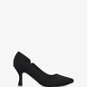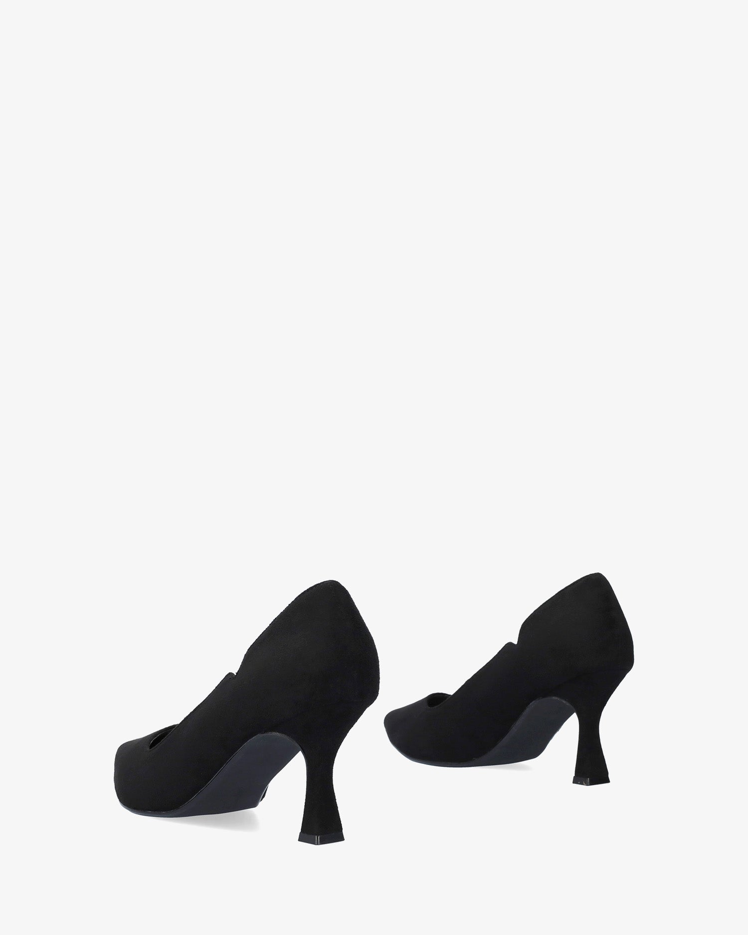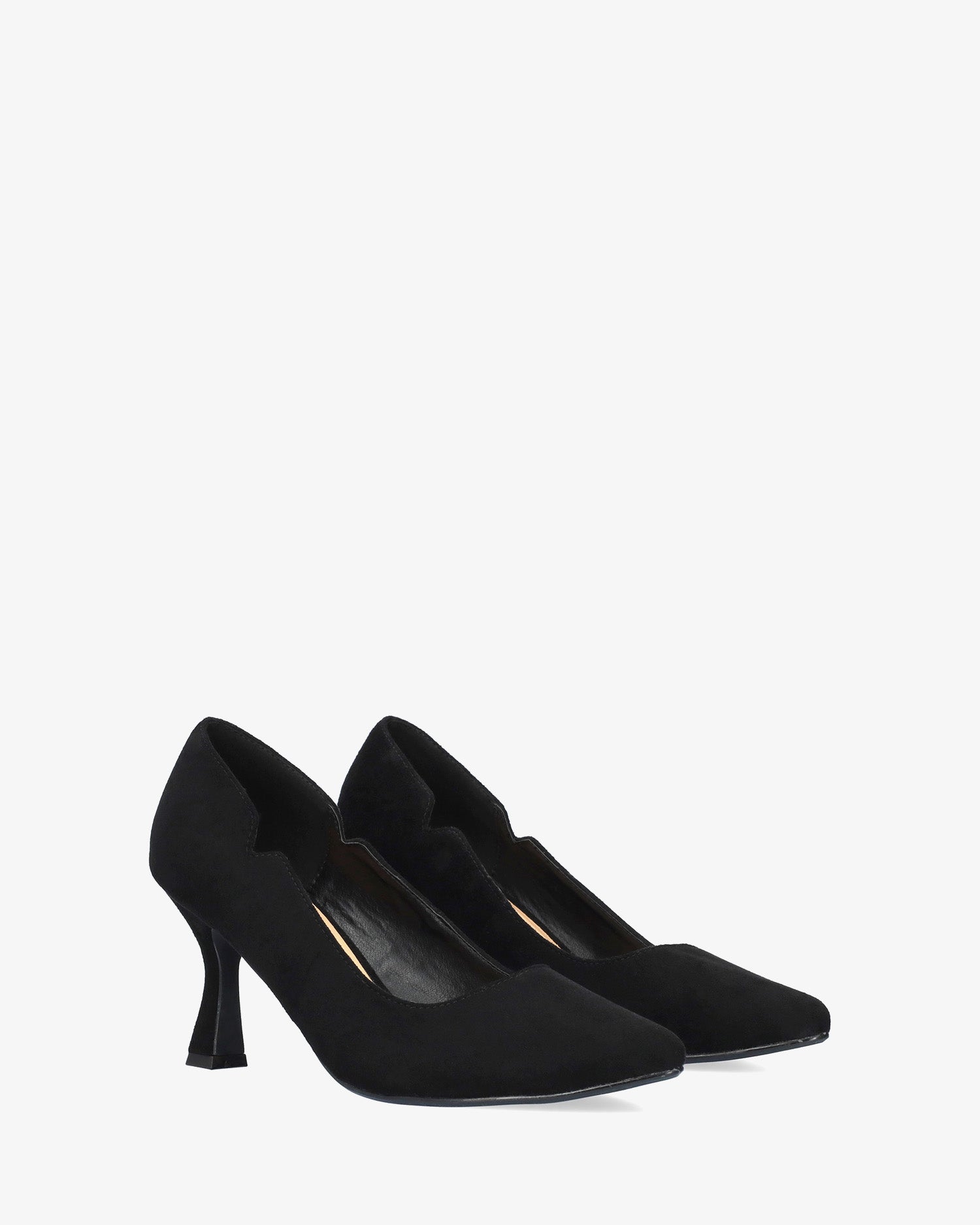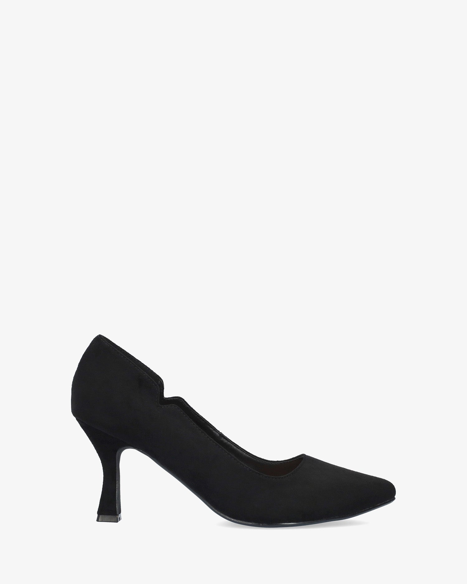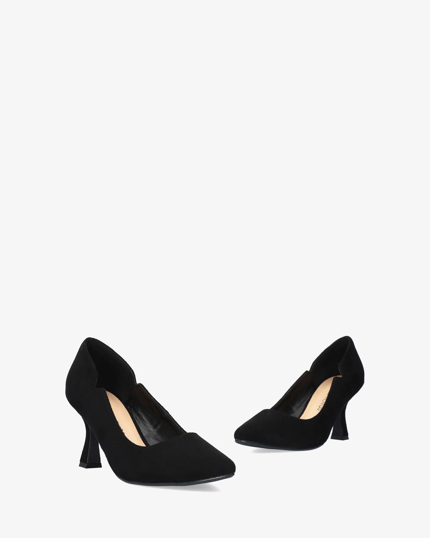Kitten Heeled pumps in faux black suede. The design features a decorative V cut on both sides and a pointed toe. The lined heel measures 2,75 inch for small sizes from 32 to 35 and 3,14 inch for large sizes from 43 to 45