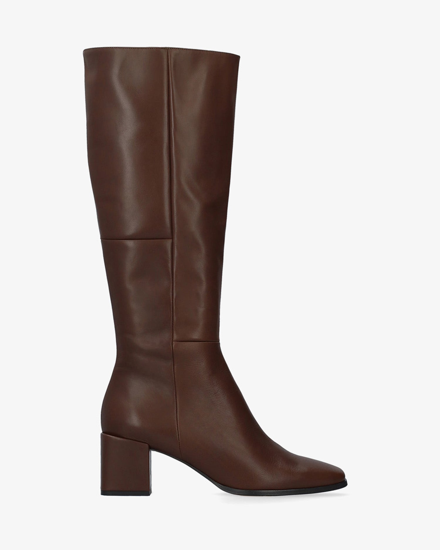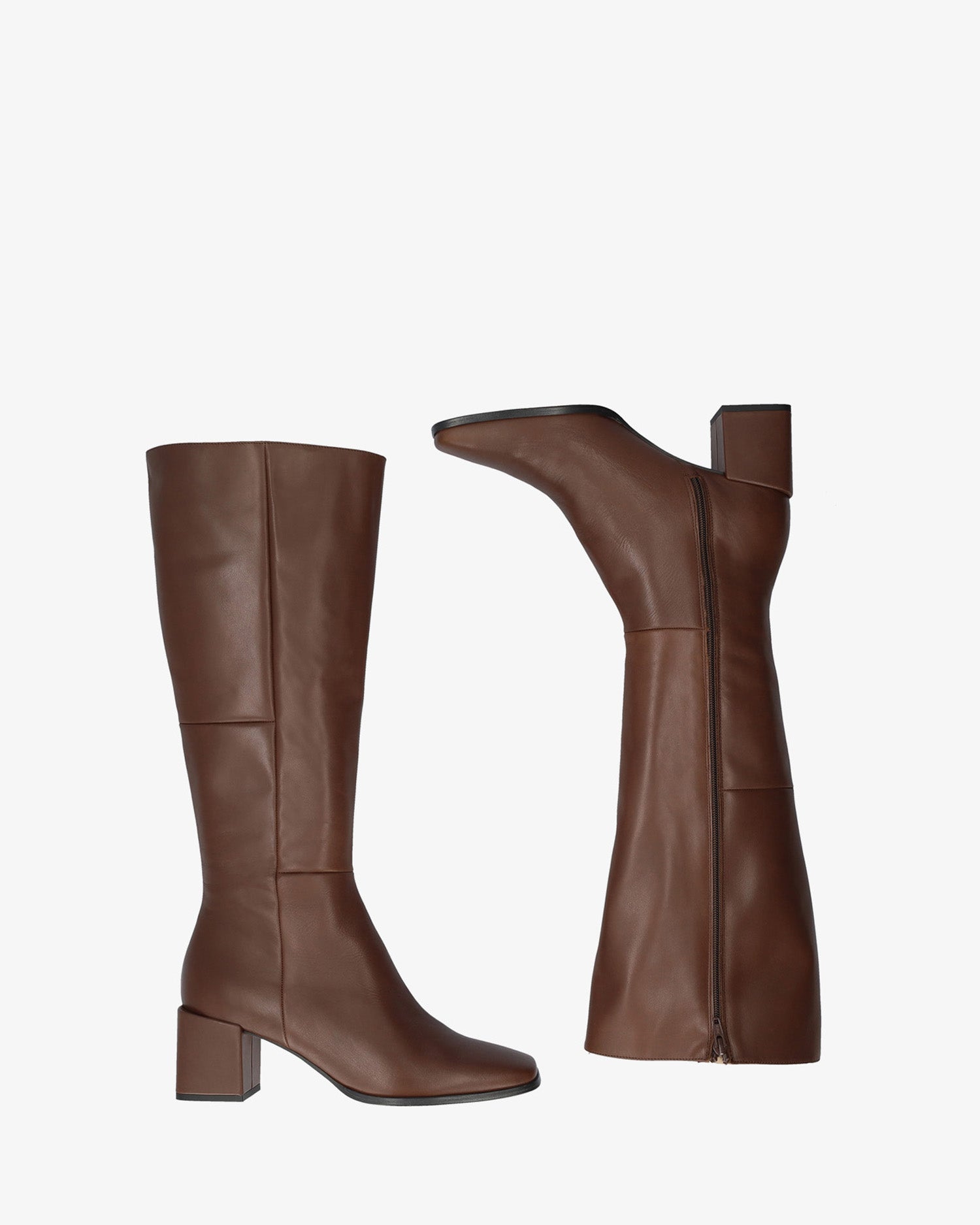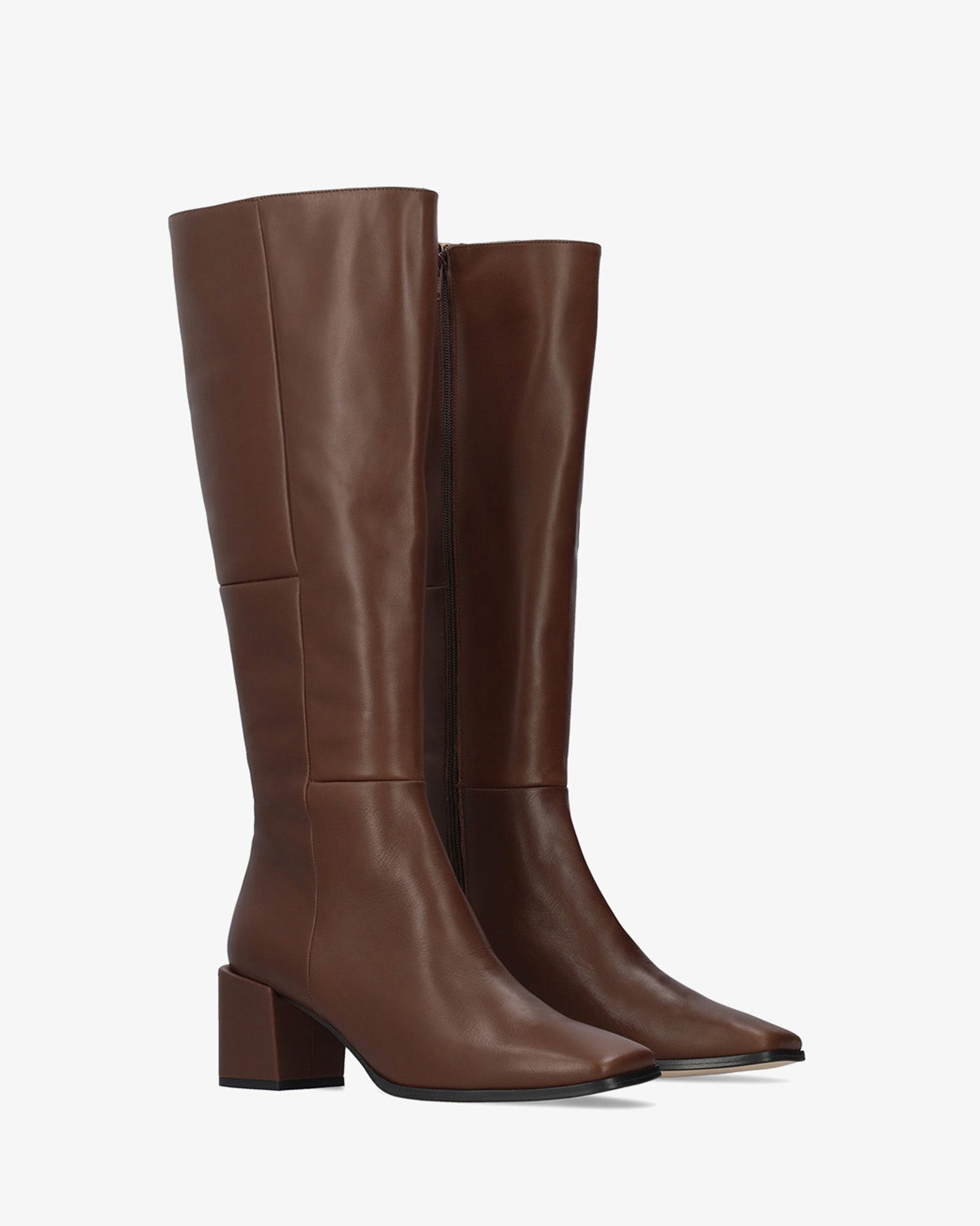 Knee-high leather brown boots. The design features a tone-on-tone elastic band on the outer side and zip closing on the inner side of the shaft. Finished in a square-toe box with beige leather inner lining. The wide heel lined in the same colour is 2,36" high for small sizes from 32 to 35 EU and 2,76" high for large sizes from 42 to 45 EU. Made in Spain. This model may vary from the standard, we recommend you check the cms of the insole.