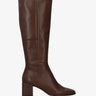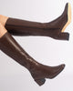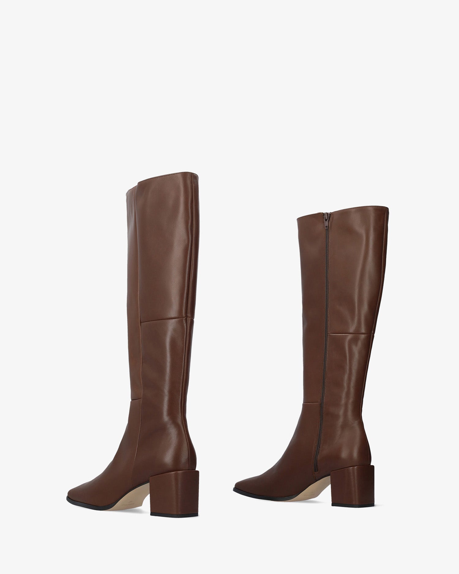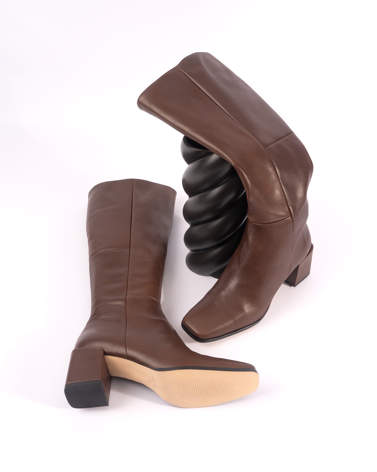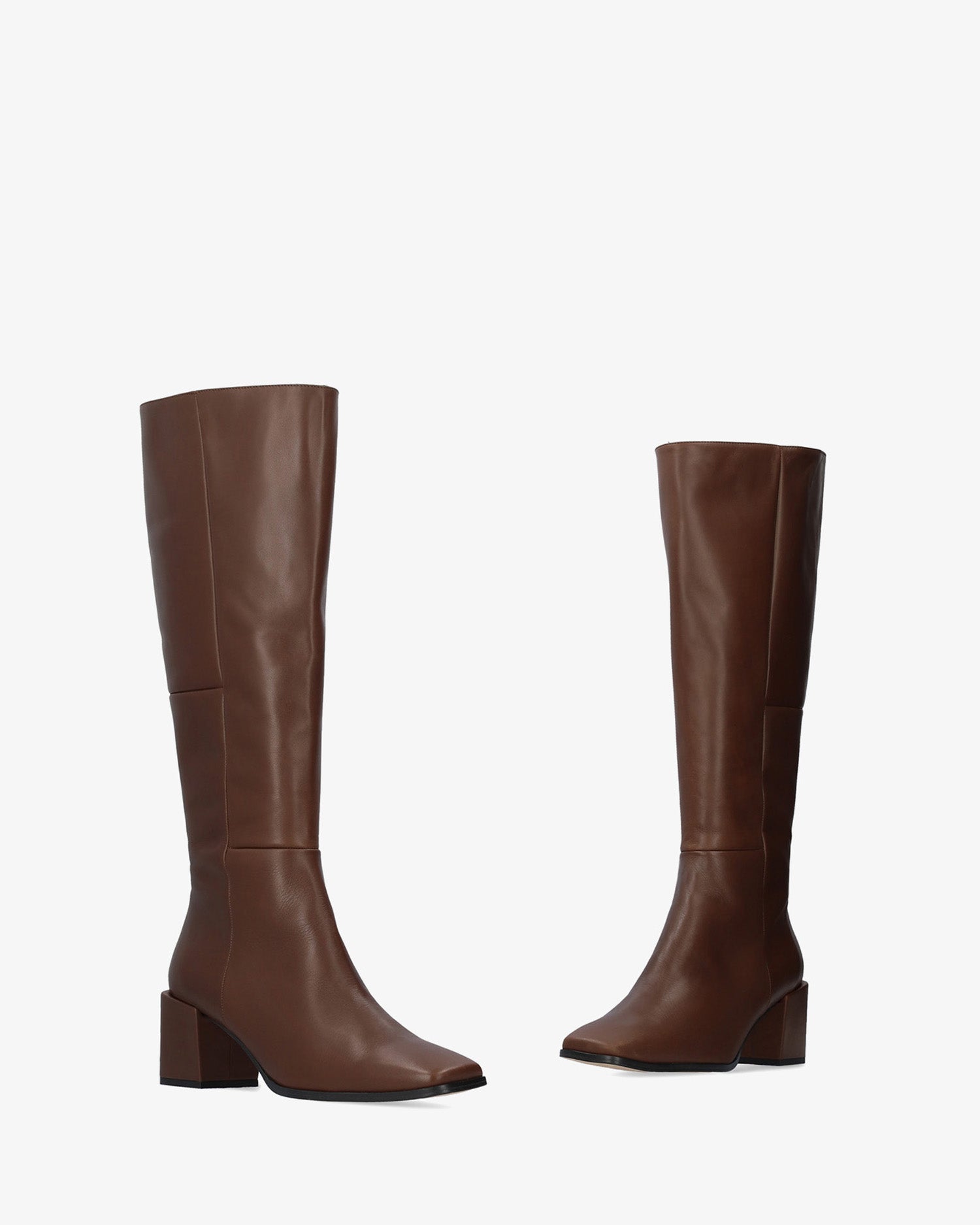 Knee-high leather brown boots. The design features a tone-on-tone elastic band on the outer side and zip closing on the inner side of the shaft. Finished in a square-toe box with beige leather inner lining. The wide heel lined in the same colour is 2,36" high for small sizes from 32 to 35 EU and 2,76" high for large sizes from 42 to 45 EU. Made in Spain. This model may vary from the standard, we recommend you check the cms of the insole.