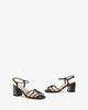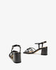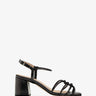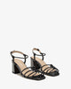Sandals in metallic black leather. Designed with matching straps, knotted at the instep. Buckle closure around the ankle with knotted side straps. Wide heel lined with matching leather. Available in sizes 32 to 35 EU. The heel is 6 cm / 2.36`` high for small sizes from 32 to 35 EU. The heel is 6.5 cm / 2.55`` high for medium sizes from 36 to 41 EU. The heel is 7 cm / 2.75`` high for large sizes from 42 to 45 EU.