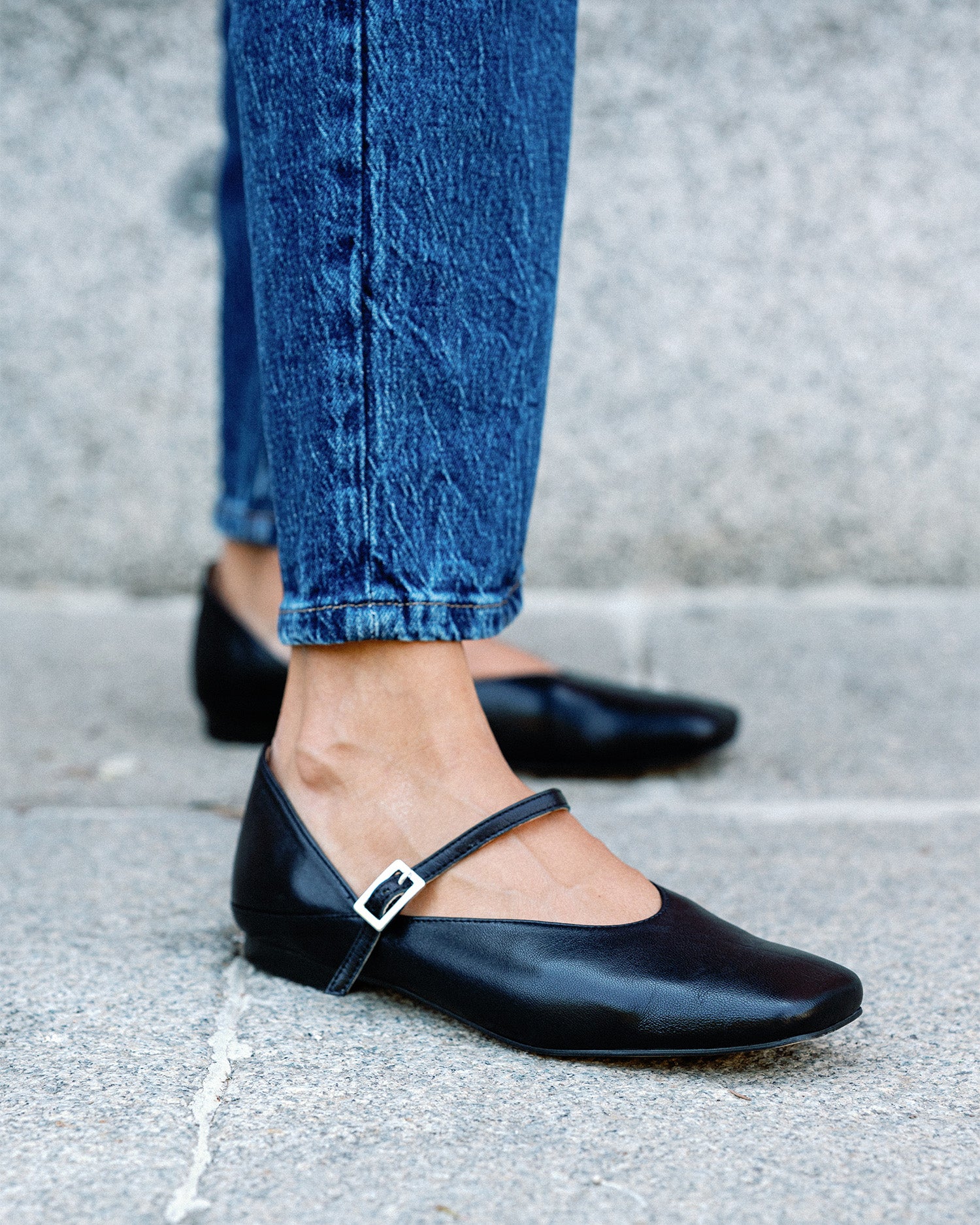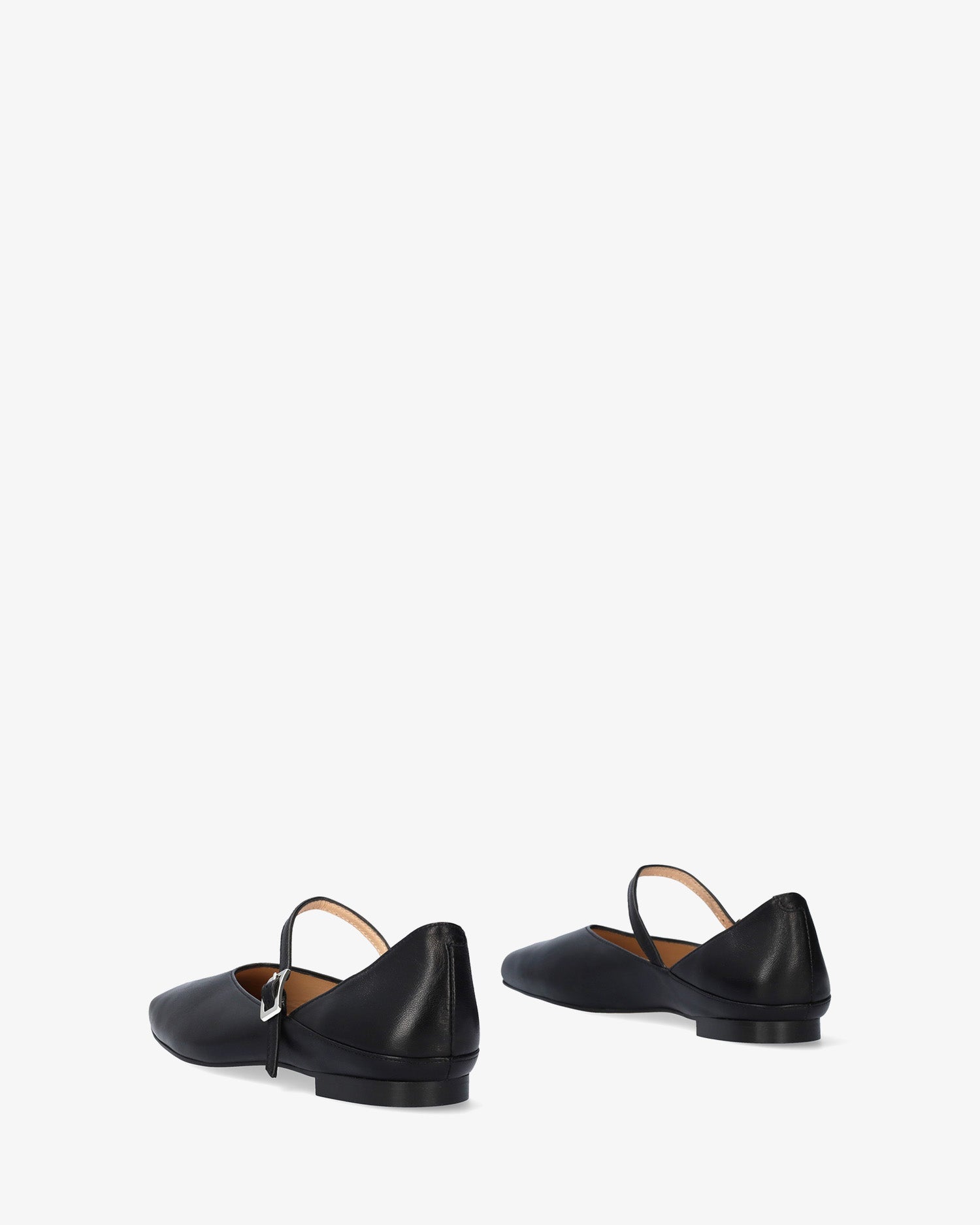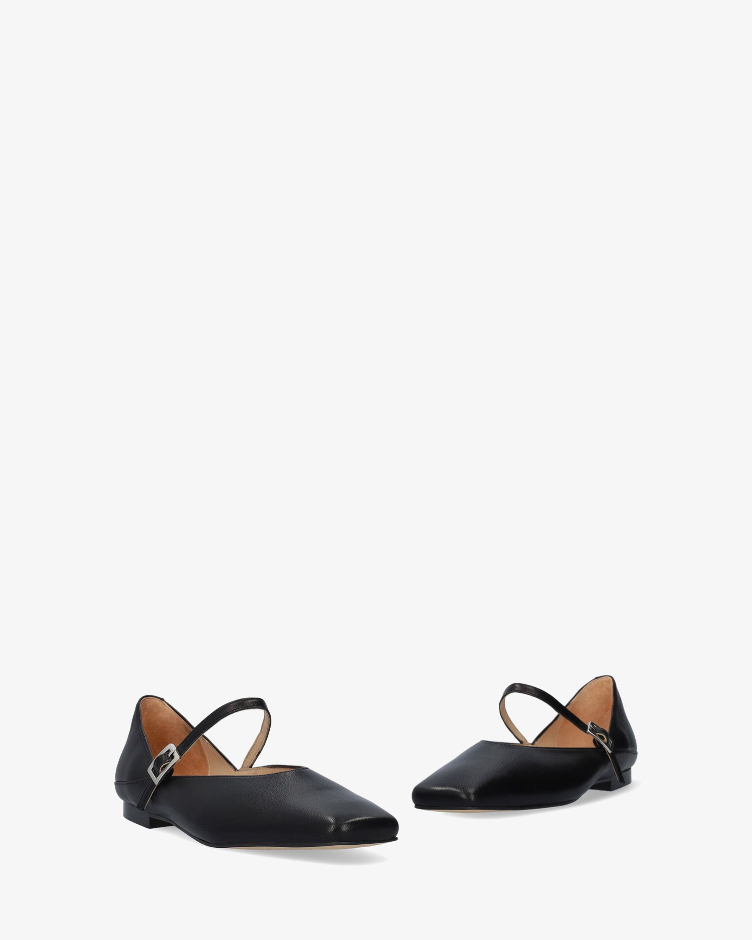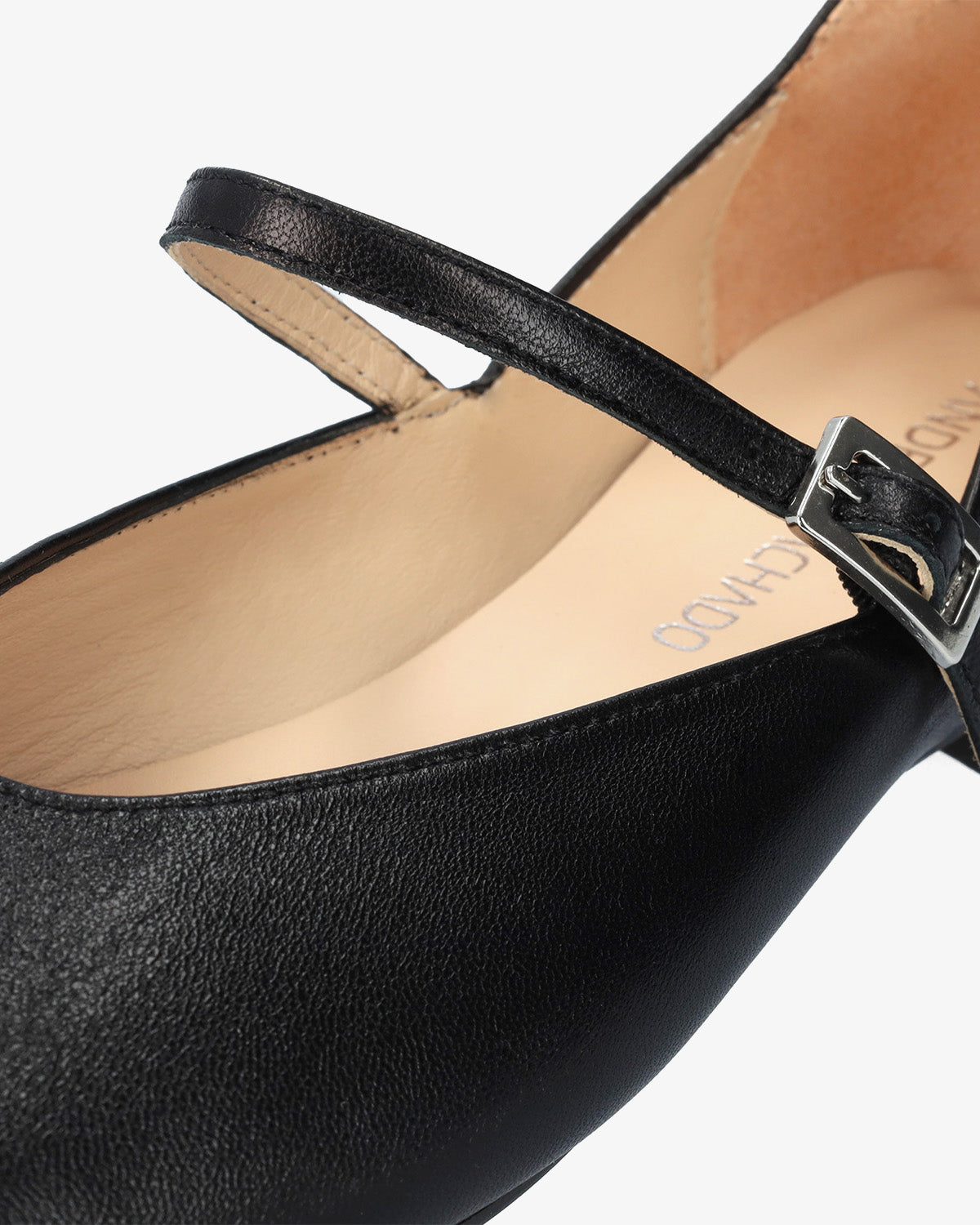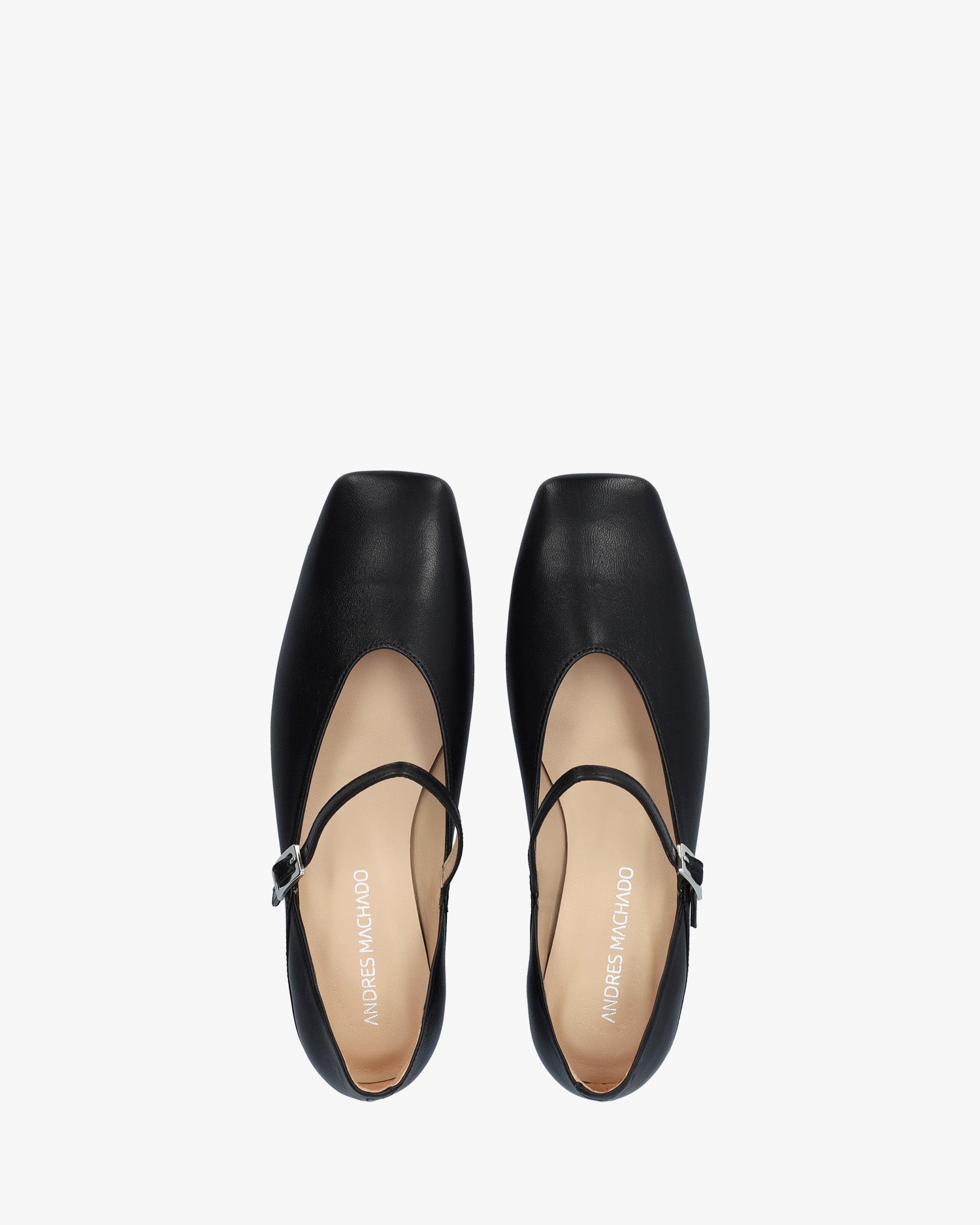 Flat Mary Jane-style leather ballerina with square toe and matching strap across the instep with a side buckle fastening. Available in small sizes from 32 to 35 and large sizes from 42 to 45. Made in Spain.