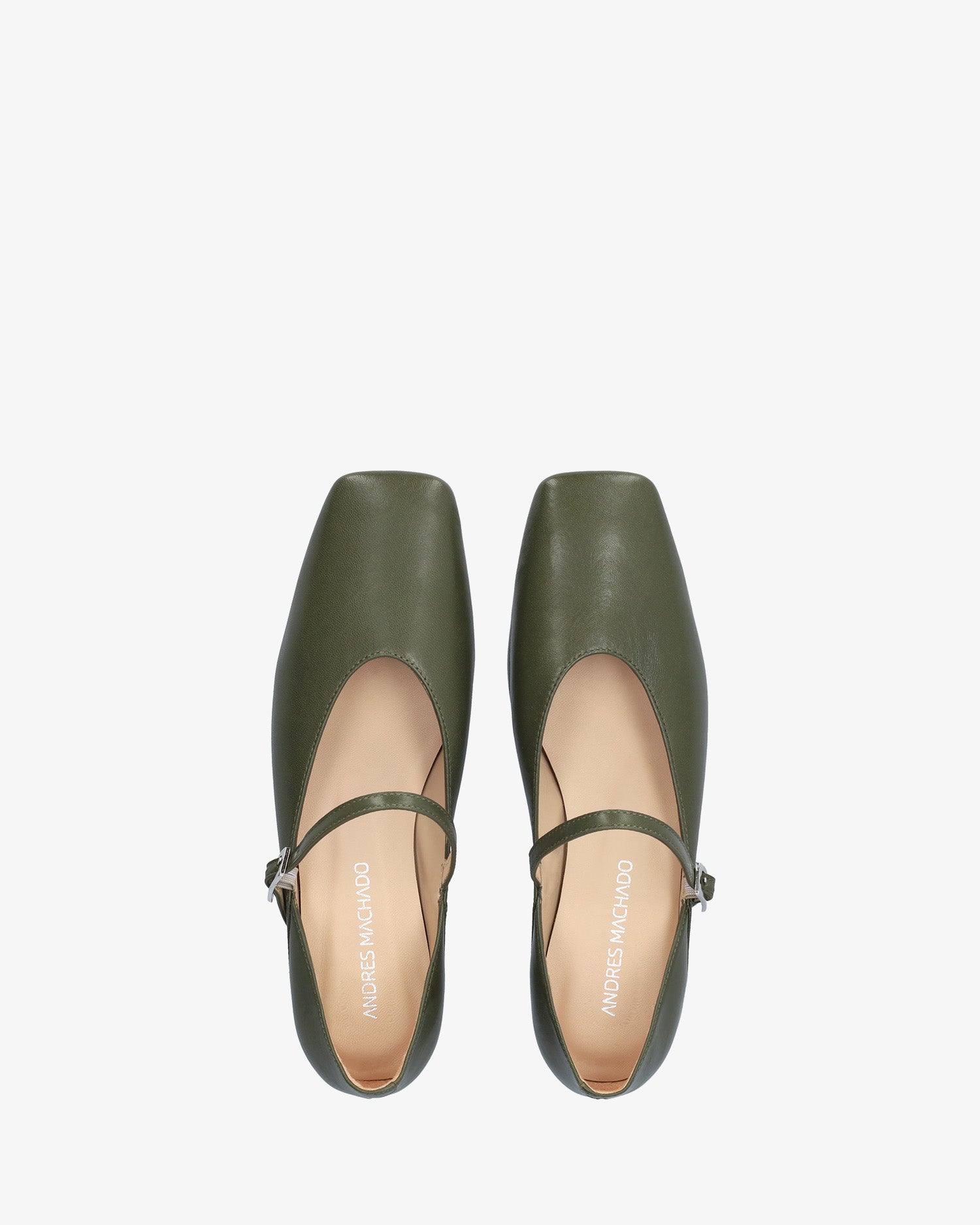 Flat Mary Jane-style leather ballerina with square toe and matching strap across the instep with a side buckle fastening. Available in small sizes from 32 to 35 and large sizes from 42 to 45. Made in Spain.