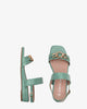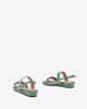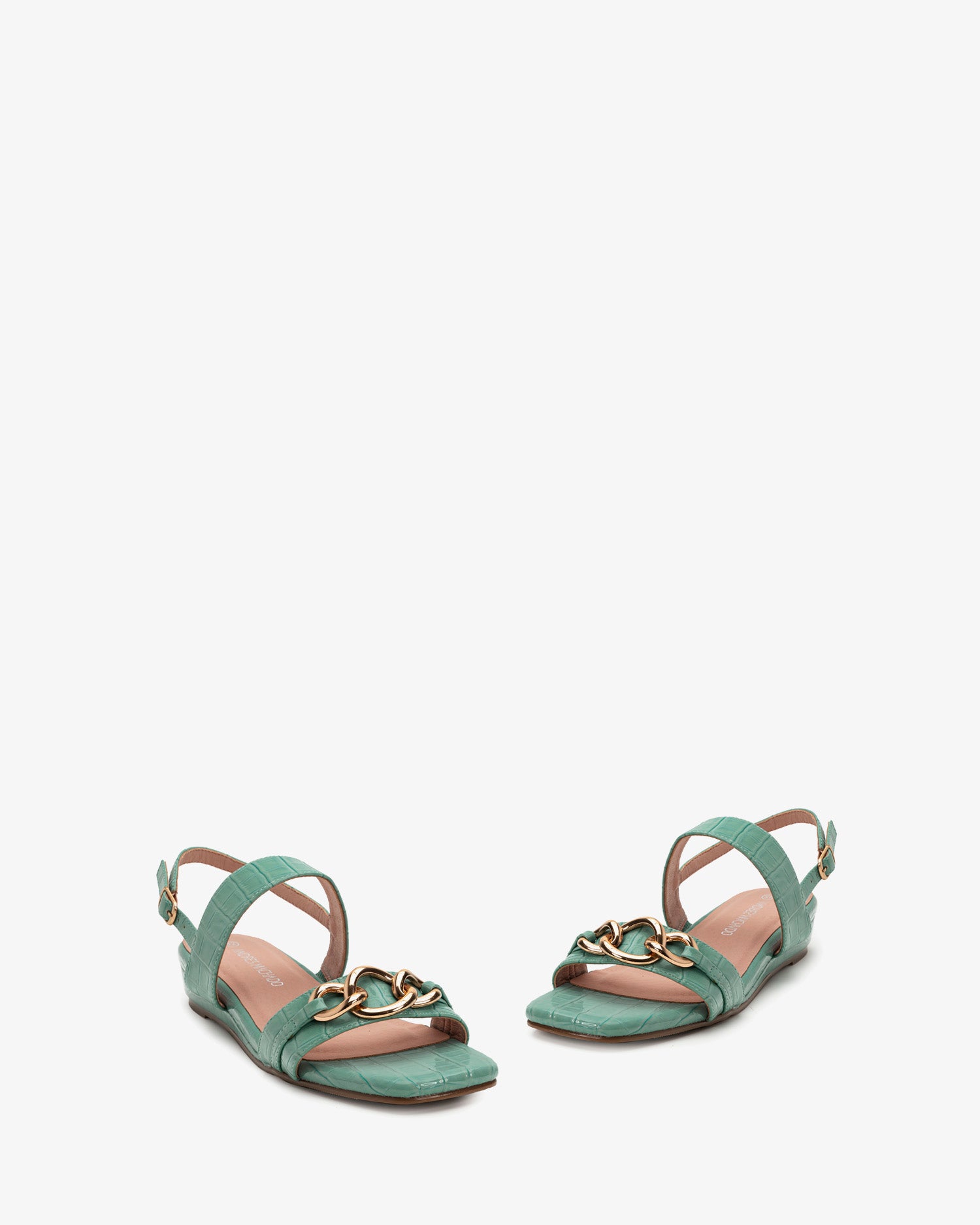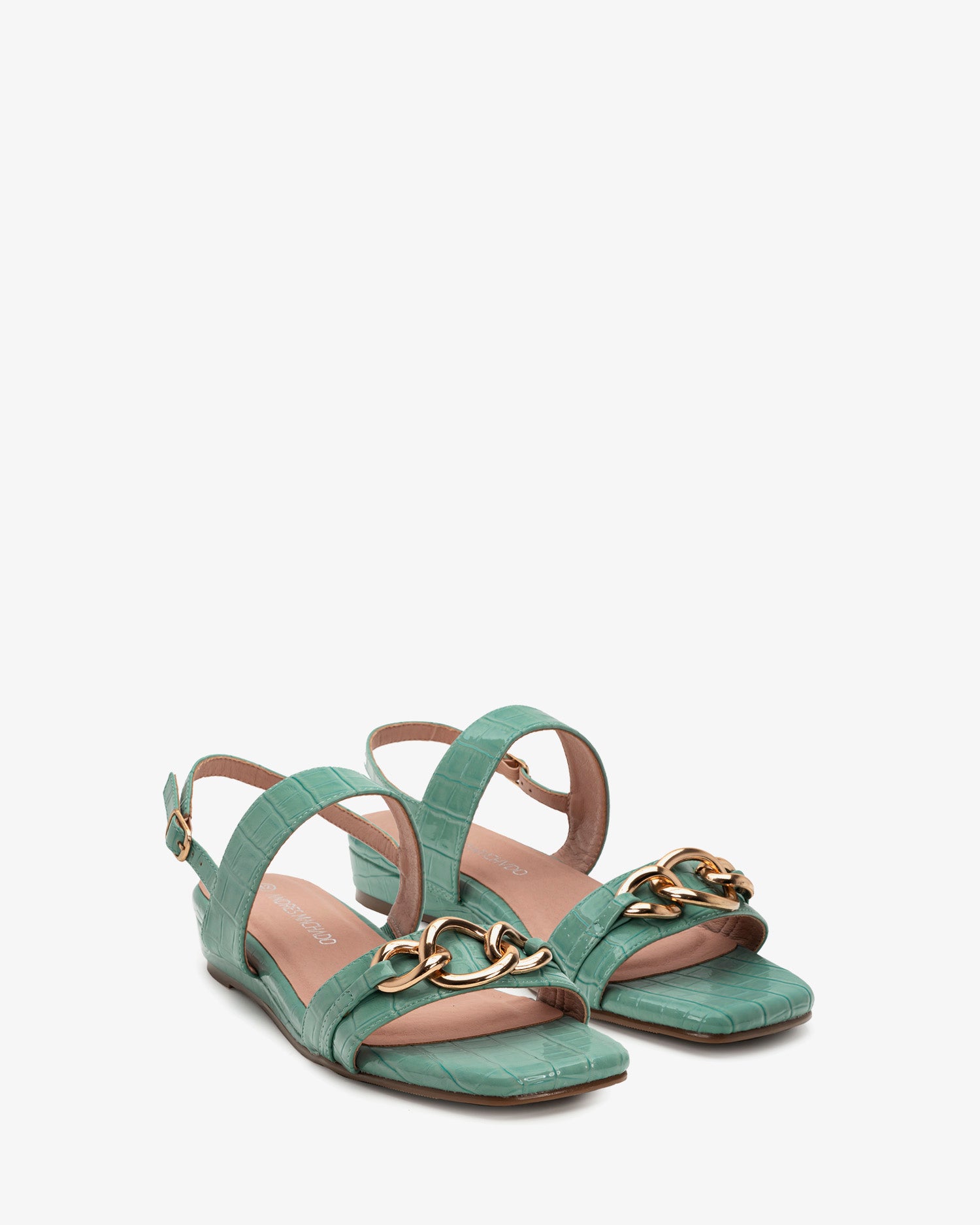 Cream colored patent sandals with crocodrile texture. Its design features a gold studded, matching, wide strap over the vamp. Buckled strap closure around the ankle. Open and square toe box. The matching wedge is 2.5 cm / 0.98`` high for small sizes from 32 to 35 EU and 3 cm / 1.18`` high for large sizes from 42 to 45 EU.