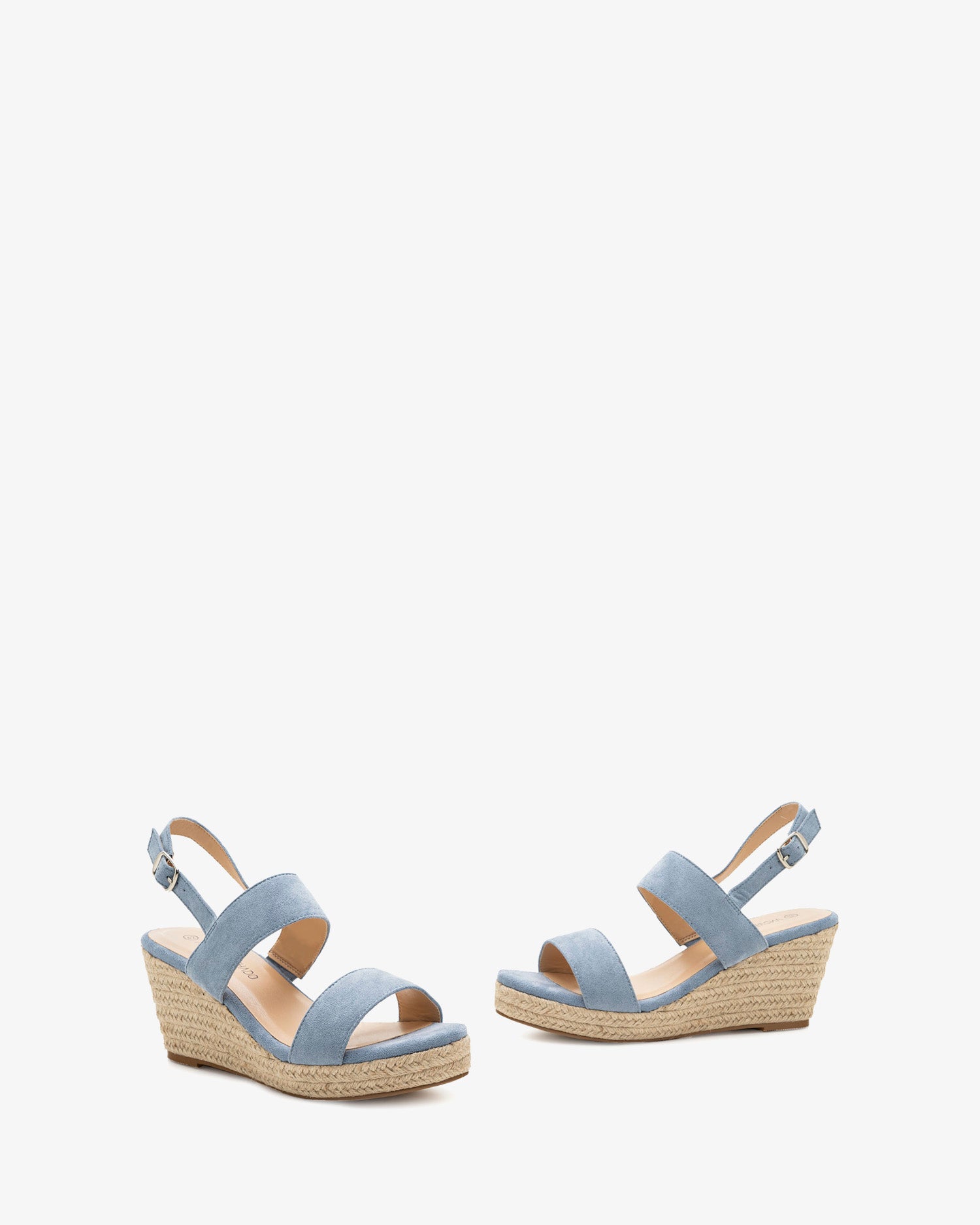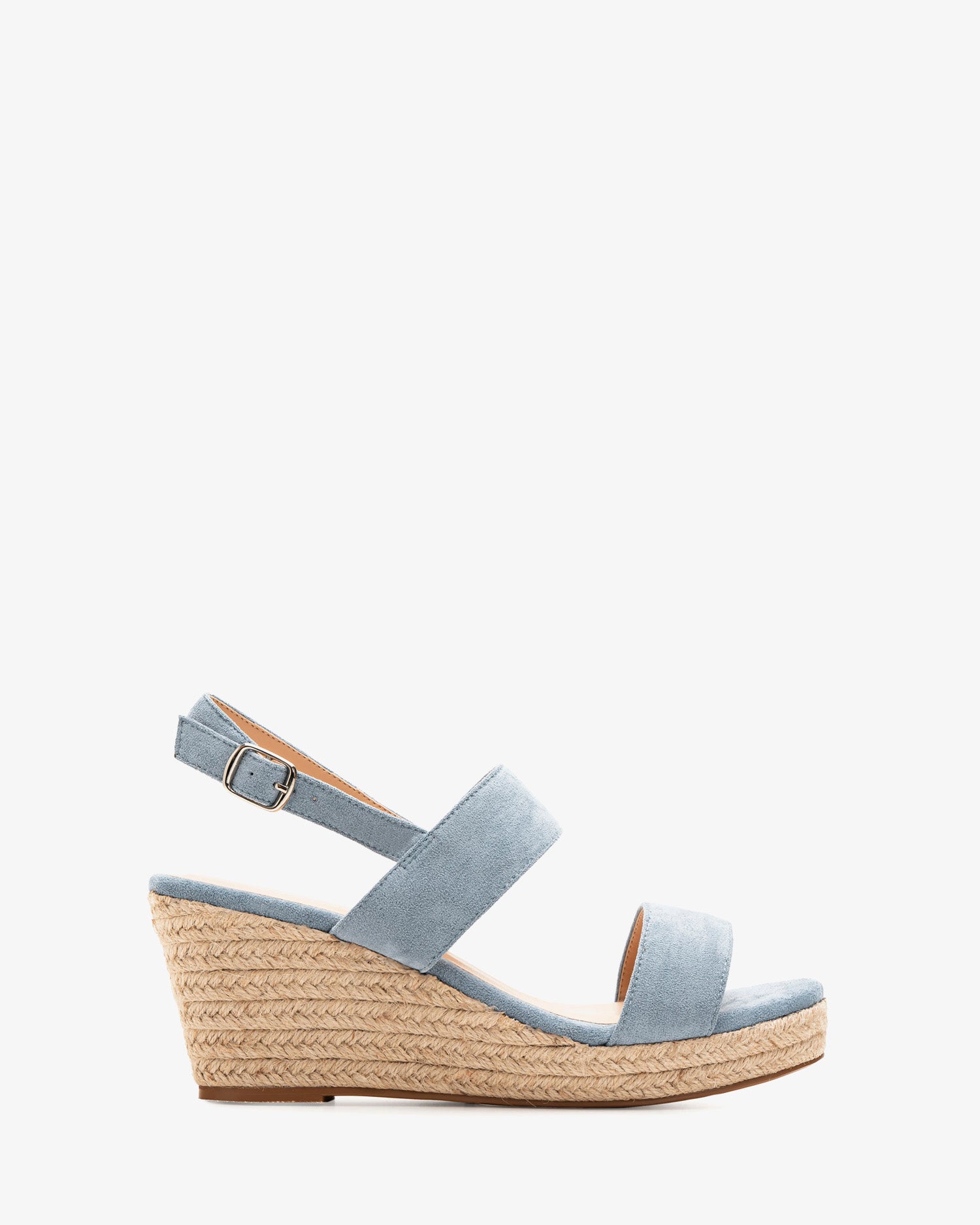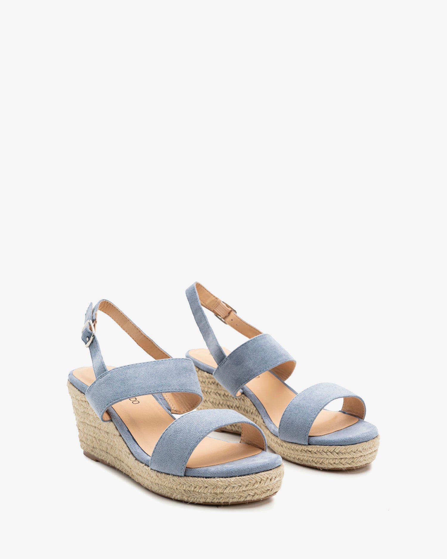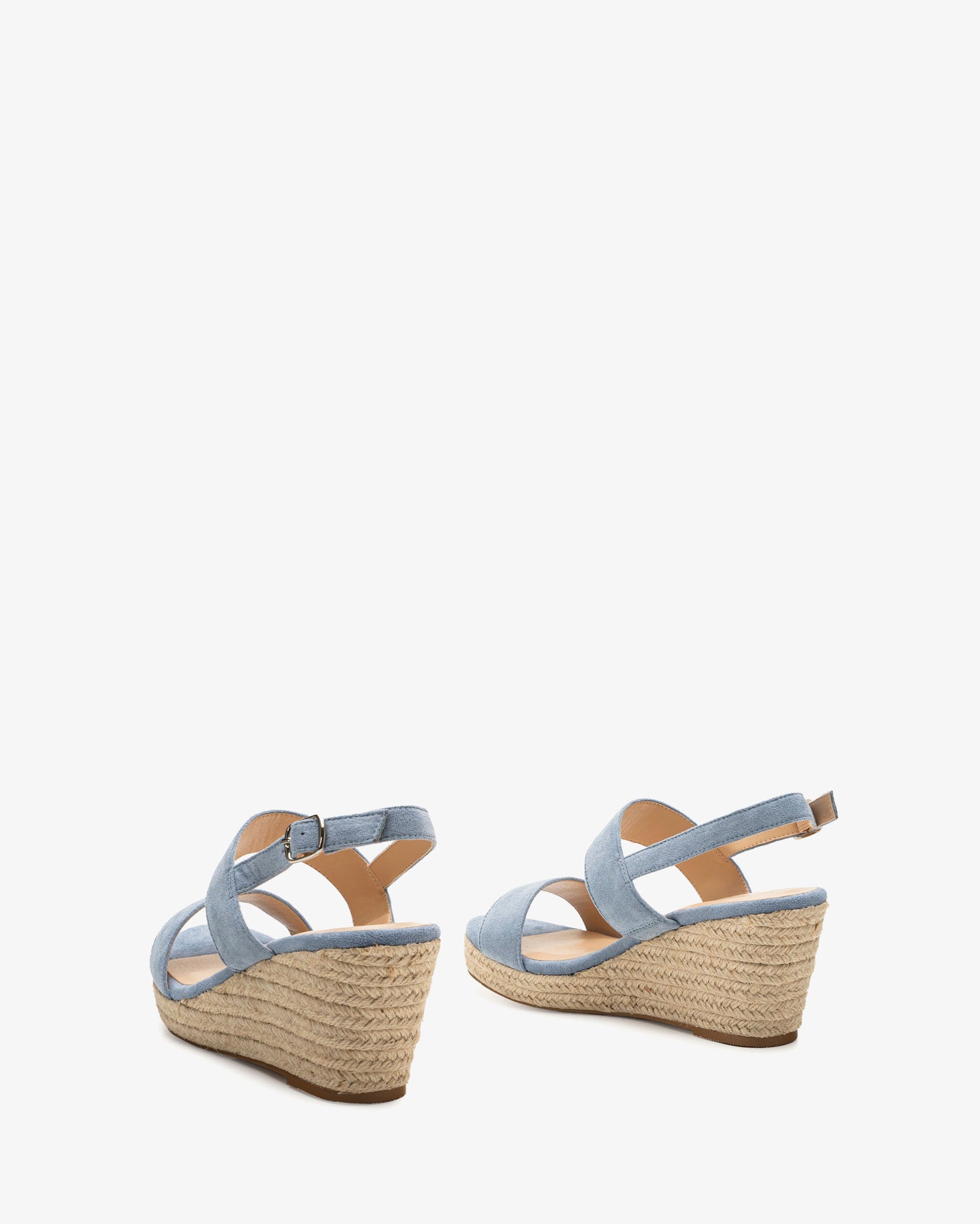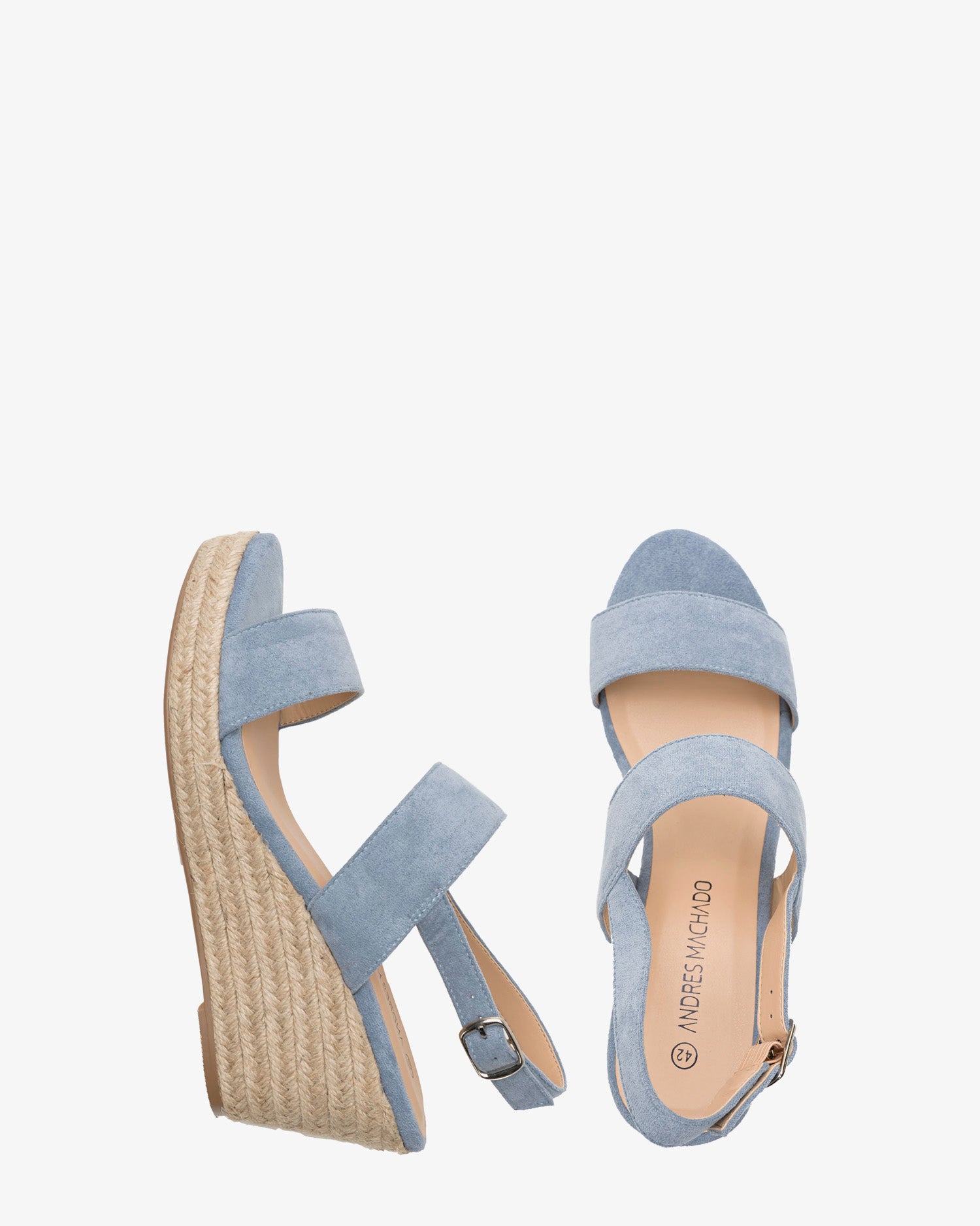 Light blue faux suede espadrille with jute wedge. Designed with two, matching wide straps over the vamp and instep. Buckle closure strap around the heel. Open and round toe box. Jute wedge and platform. The wedge is 7 cm / 2.75`` high and the platform is 2 cm / 0.78`` high for small sizes from 32 to 35 EU. The wedge is 8 cm / 3.15`` high and the platform is 2 cm / 0.78`` high for large sizes from 42 to 45 EU. This model fits small, we recommend taking one size larger than usual.