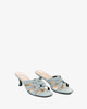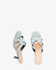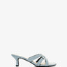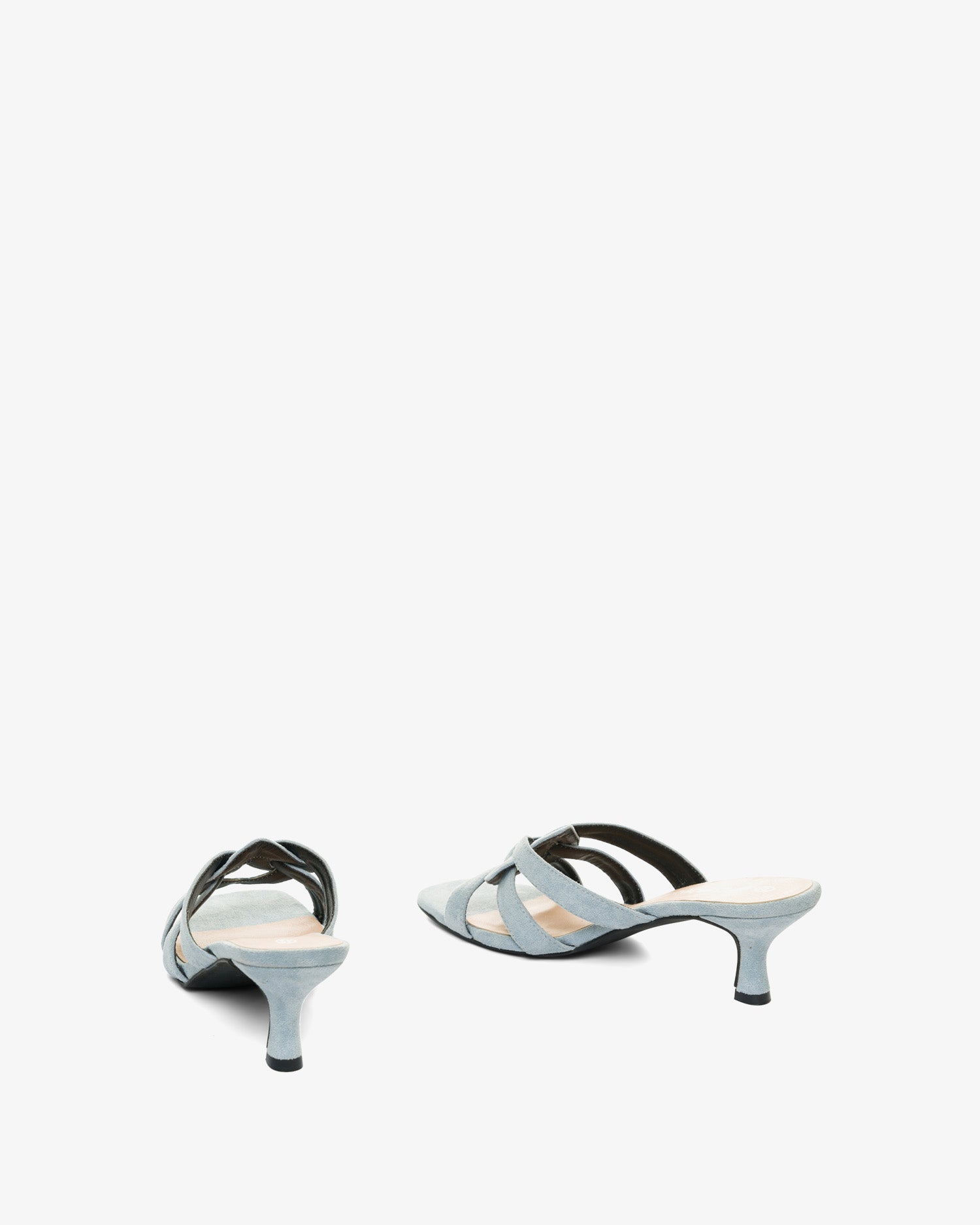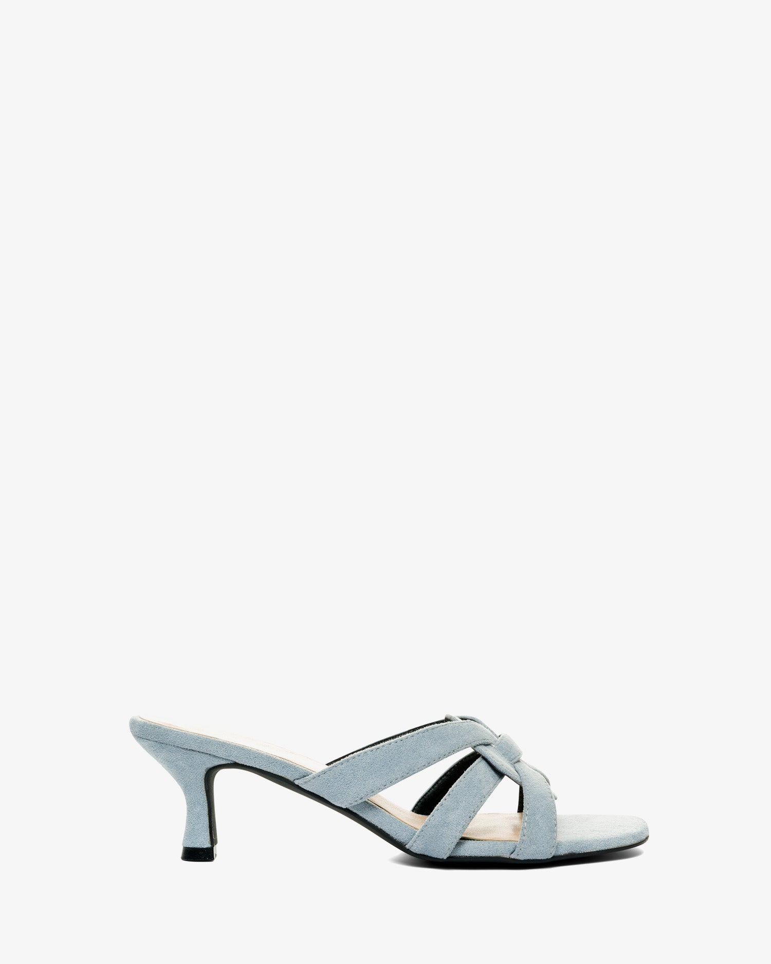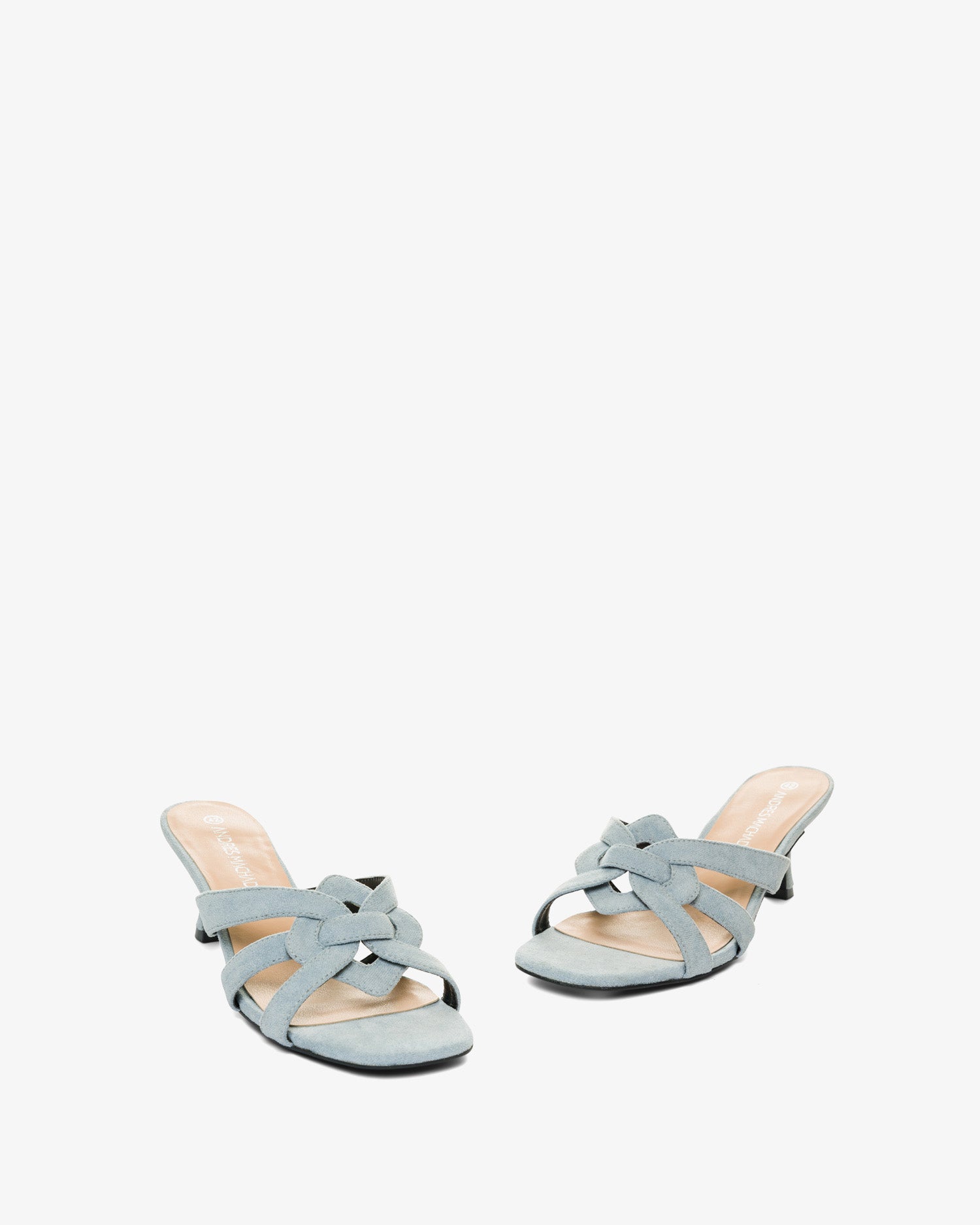 Light blue faux suede mules featuring a kitten heel. Intertwined straps detail over the vamp. Open and square toe box. The thin, matching heel is 6,5cm /2,56`` for small sizes from 32 to 35 EU. The thin, matching heel is 7cm /2,75`` for small sizes from 42 to 45 EU.