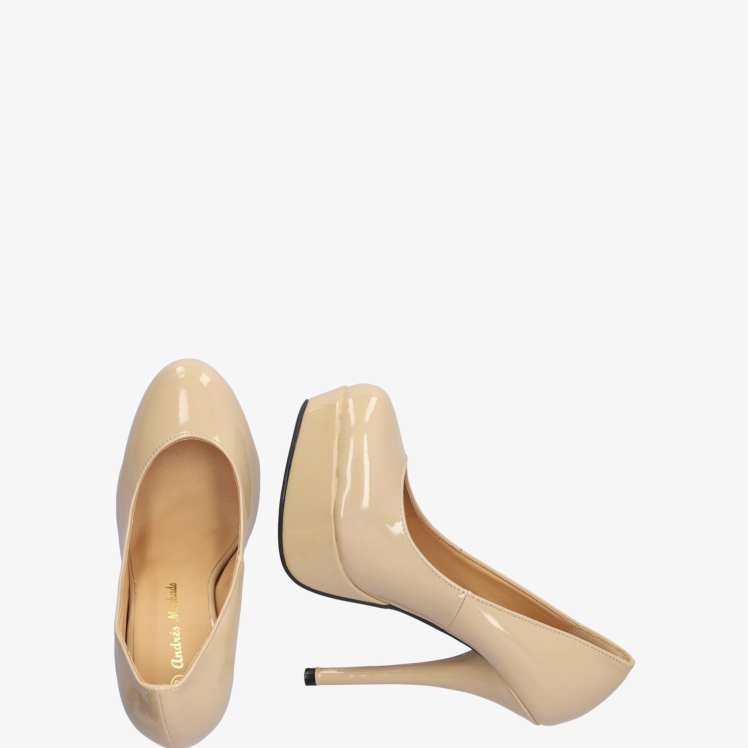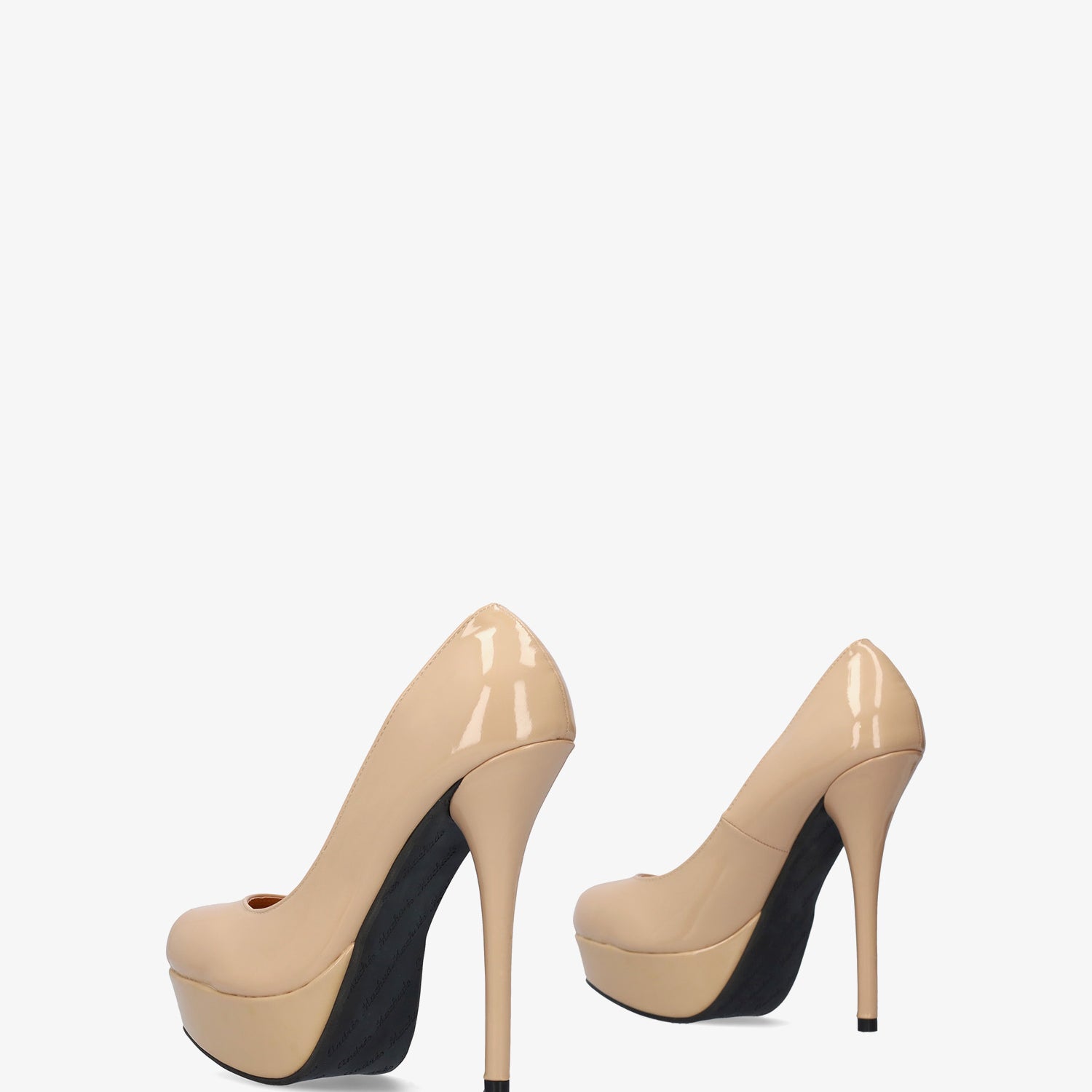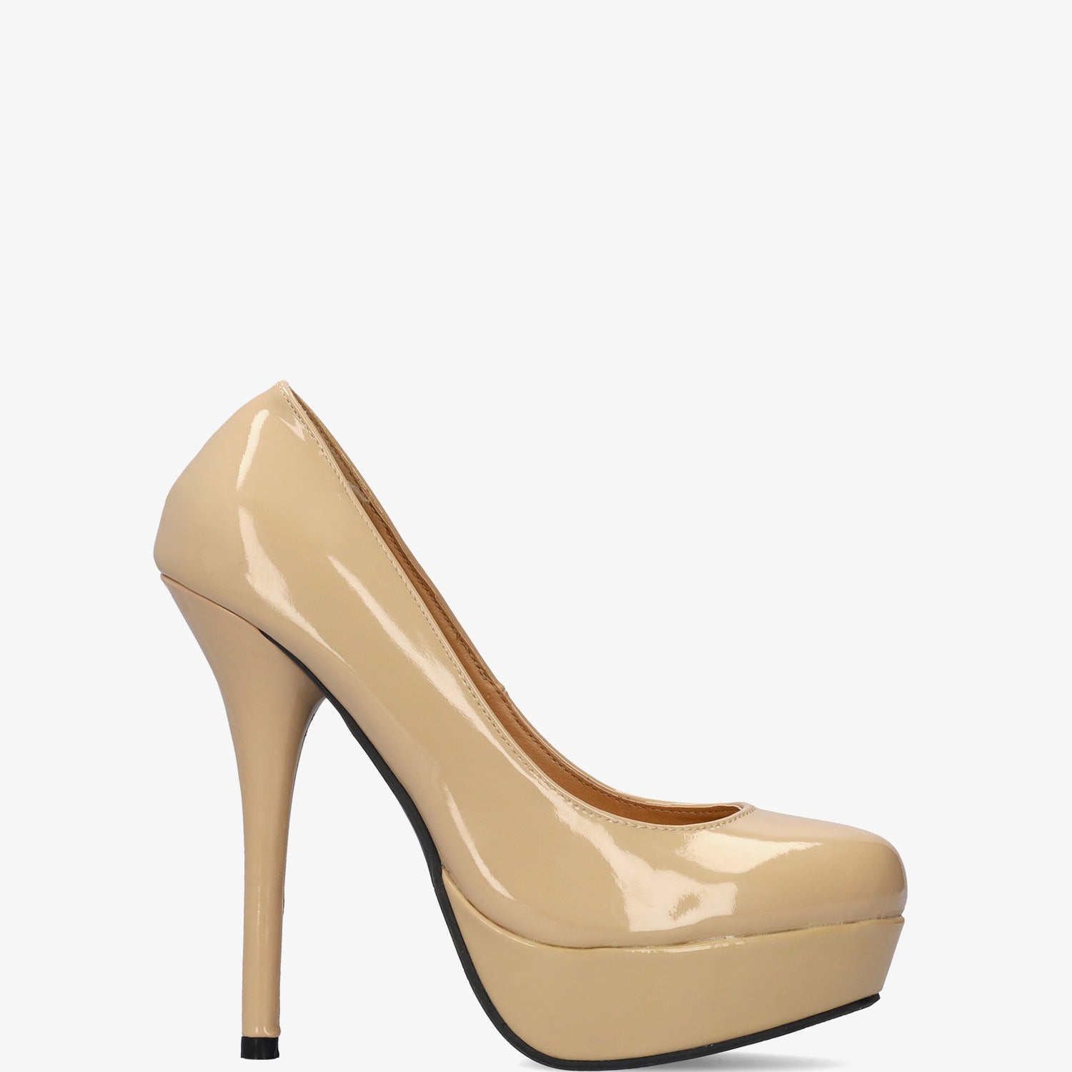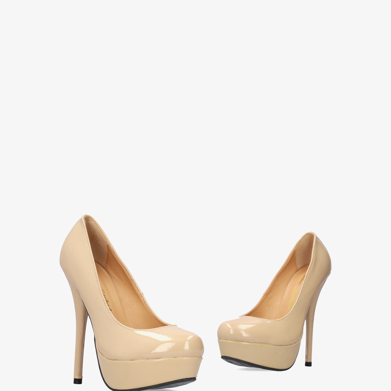 Light brown patent platform pumps with stiletto heel