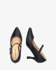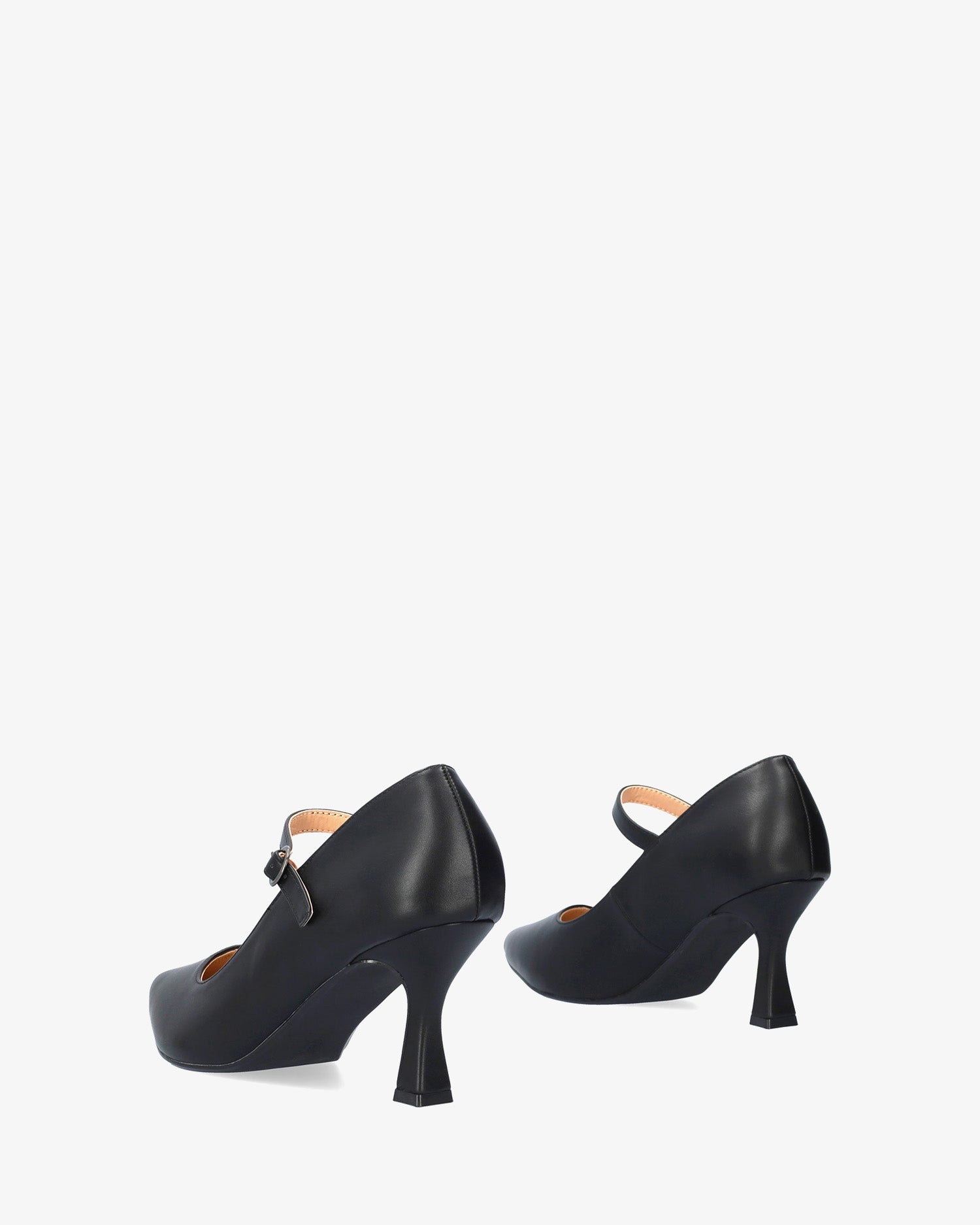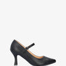 Mary Jane style shoe with kitten heel and black coloured faux soft leather. The pointed toe features a fine strap over the vamp finishing with a metallic buckle. Semi-fine heel lined in the same colour measures 2,75 inch for small sizes 32-35 and 3,14 inch for large sizes 43-45. This model may vary from the standard, we recommend you check the cms of the insole.