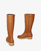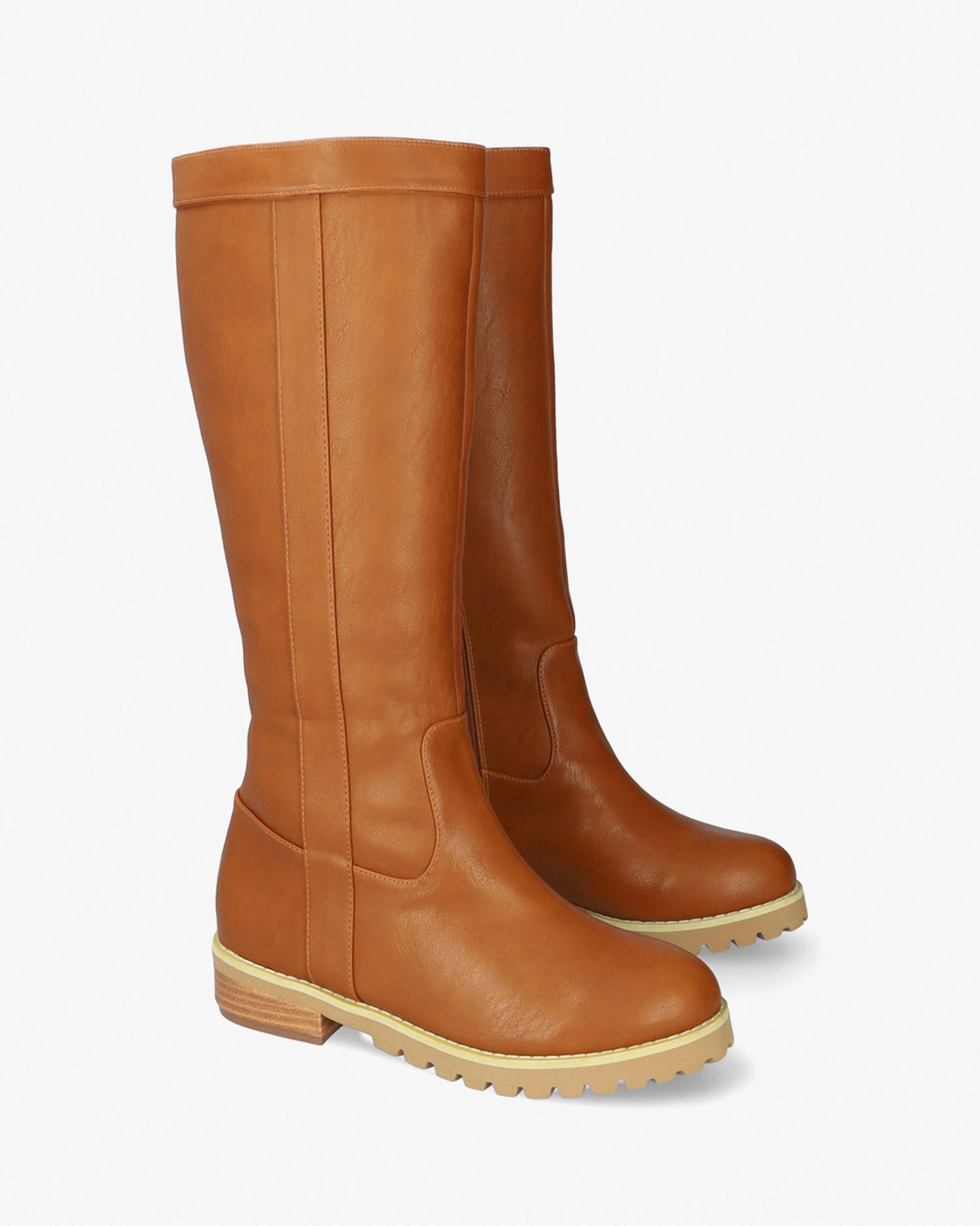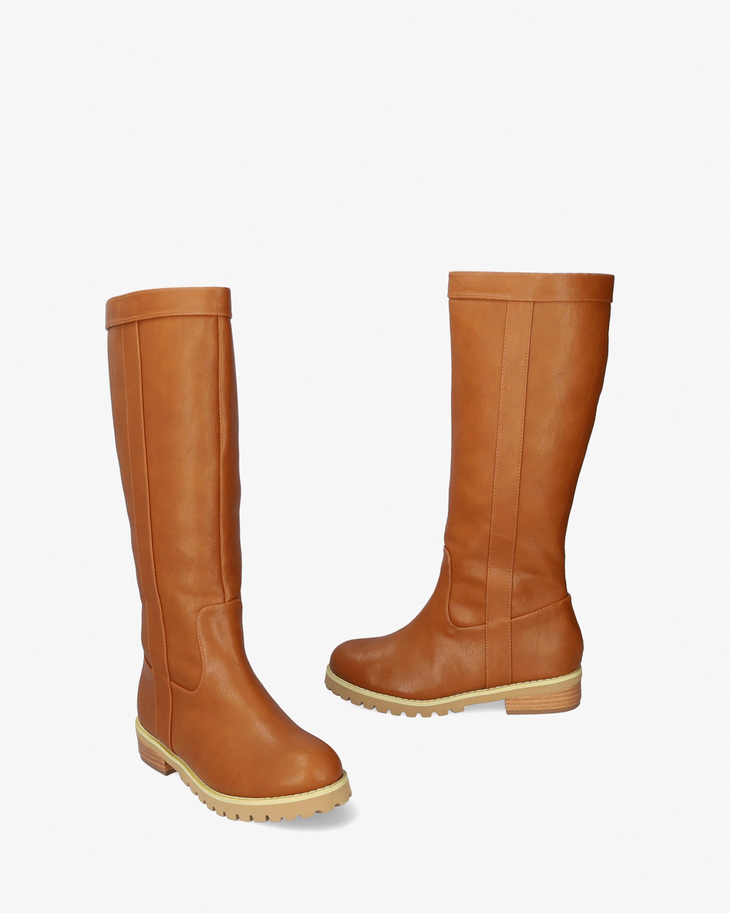 Mid-calf boots in camel faux leather. Matching zipper closure on the inner half of the shaft. Side strap detail on the external face and upper edge of the shaft. Round toe. Rubber track sole. Wooden effect laminated heel of 3cm / 1.18``. Available in large sizes from 42 to 45 EU.
