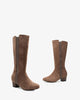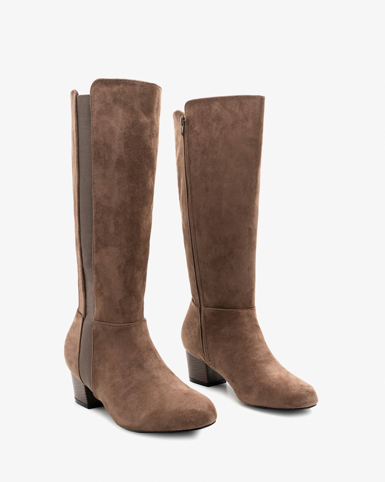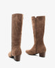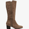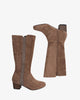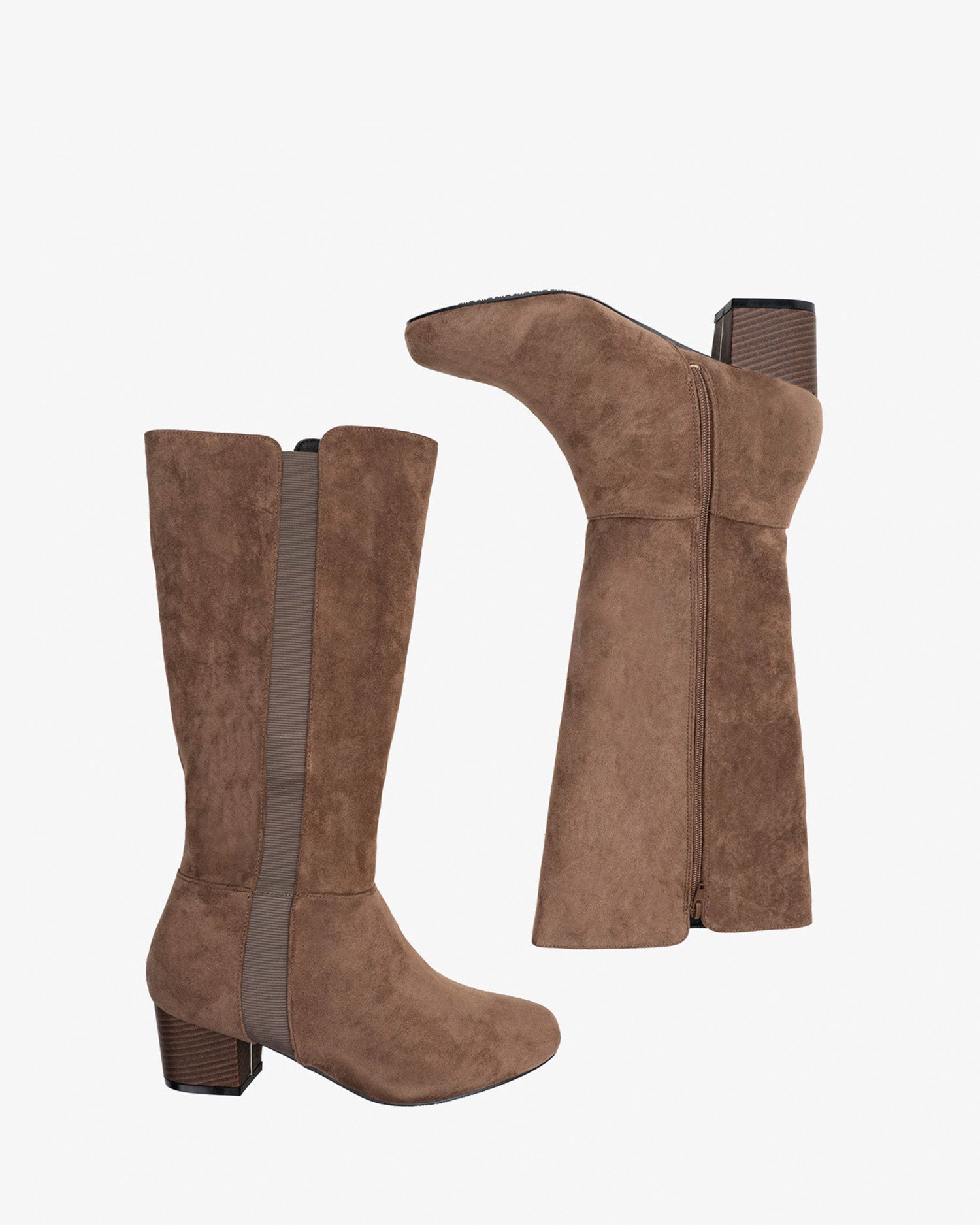 High boot in taupe-coloured suedette. Elastic matching strap in on the outer side. Matching zip closure on the inside. Wide brown wood effect 4cm/ 1.57in high heel for small sizes from 32 to 35. 6cm/ 2.36in high heel for large sizes from 42 to 45.