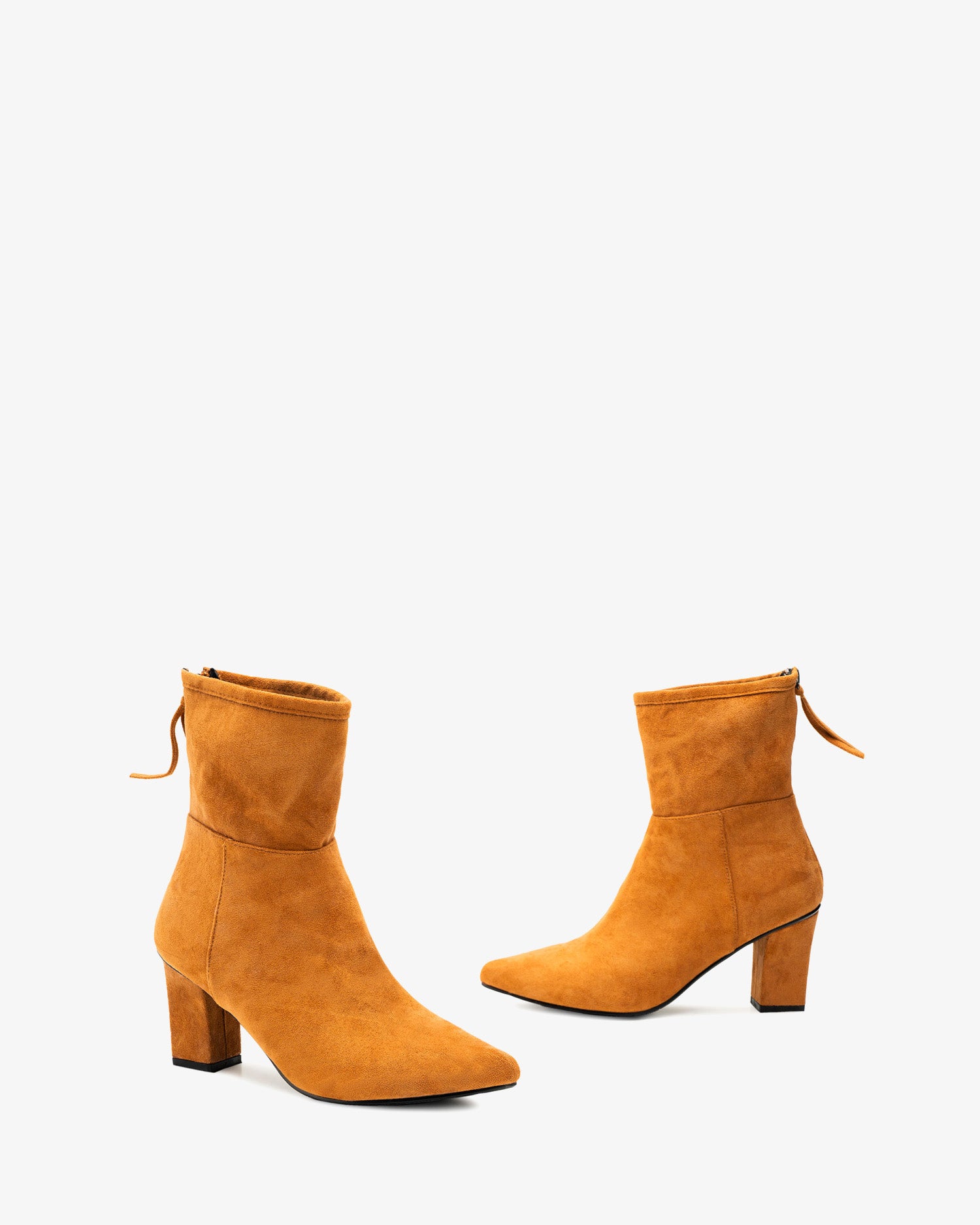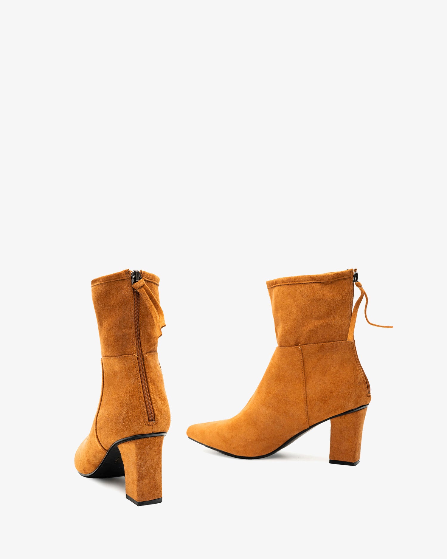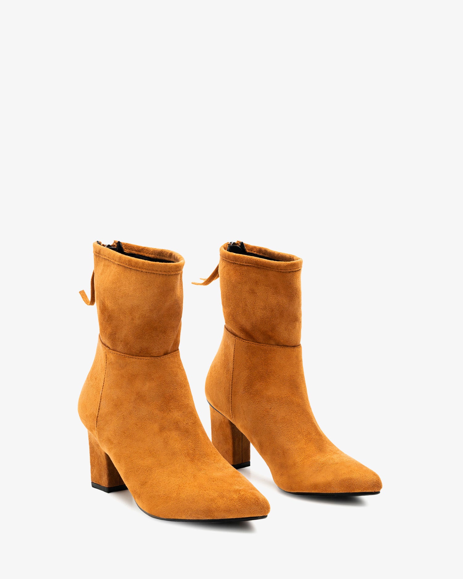 Camel-colored suedette boots. Matching zipper on the back. Decorative strip detail in matching suedette, on the sides and on the front of the shaft. Wide, wood effect 7cm/ 2.75in high heel for small sizes from 32 to 35. 9cm/ 3.54in high Heel for large sizes from 42 to 45.