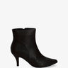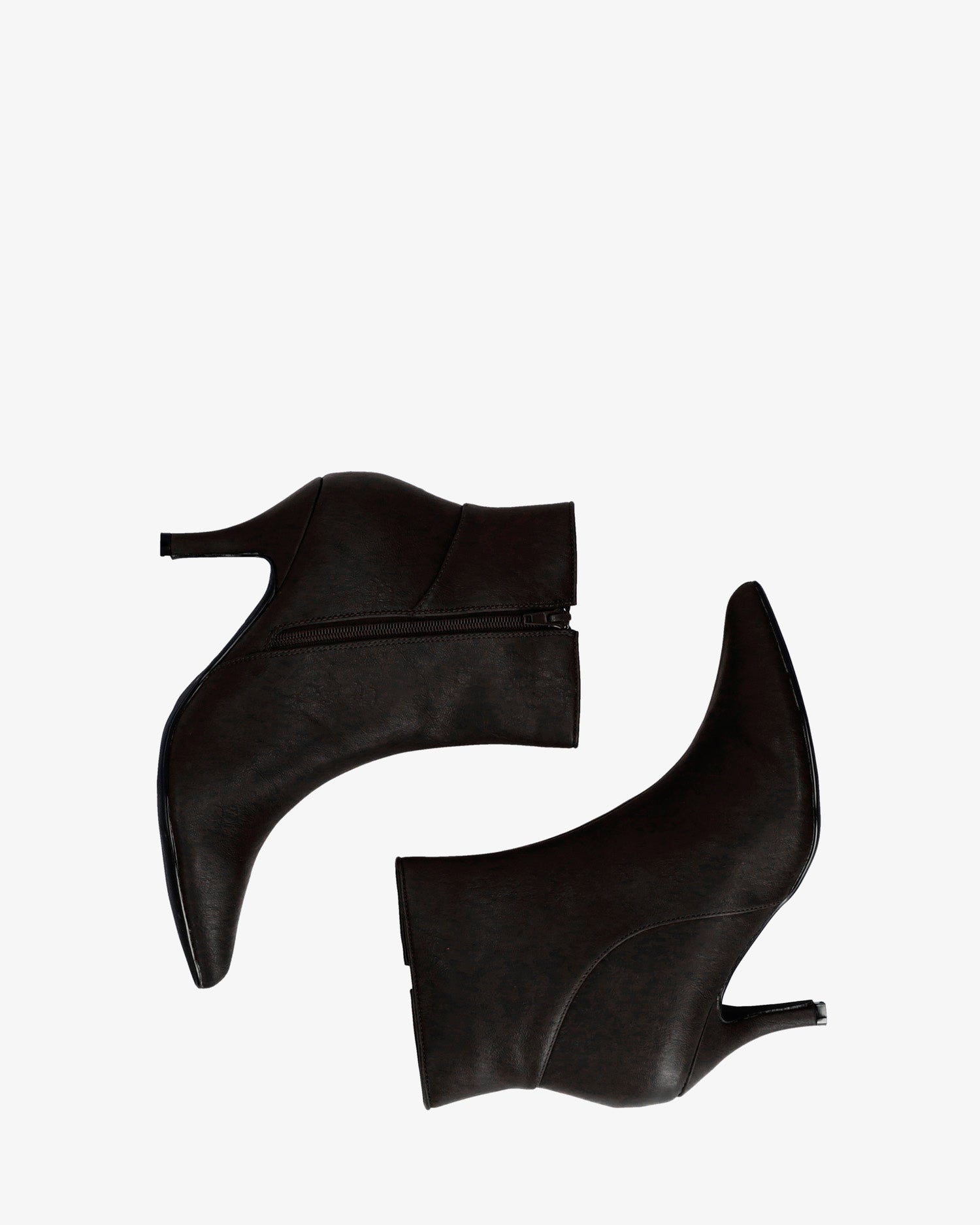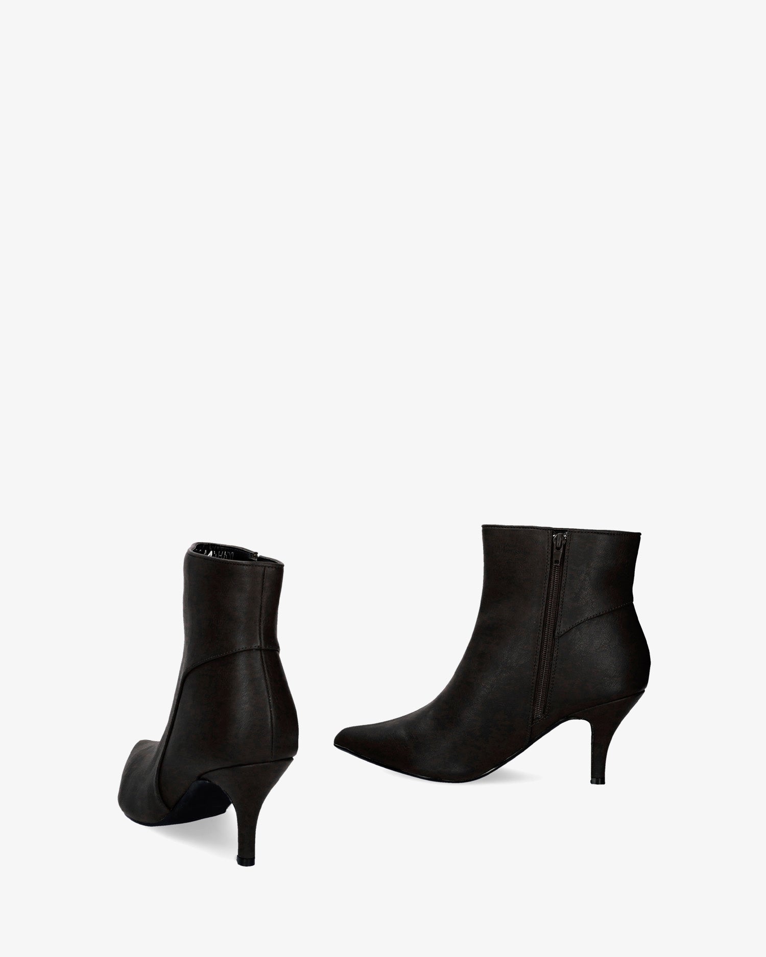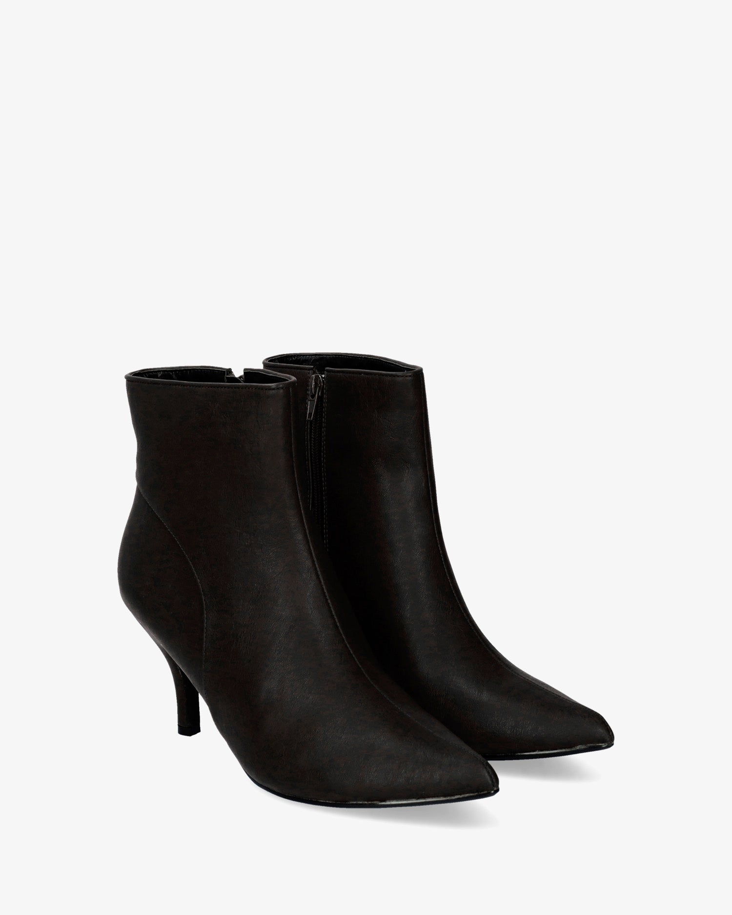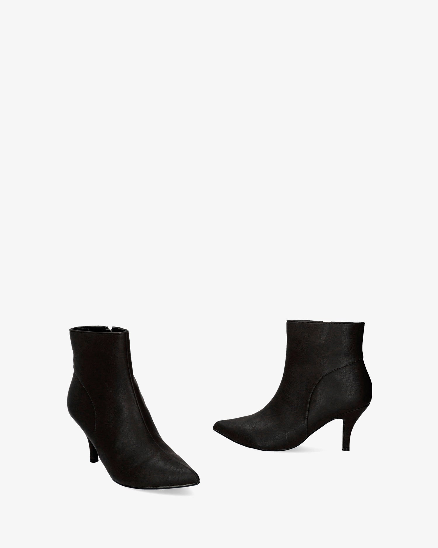 Booties in black faux leather. Mid-height shaft with matching zipper closure on its internal side. Decorative stitching from the tip of the toe box to the upper edge of the shaft and around the ankle. The thin heel is 7 cm / 2.75`` high for smalls sizes from 32 to 35 EU and 8 cm / 3.14`` high for large sizes from 42 to 45 EU.