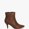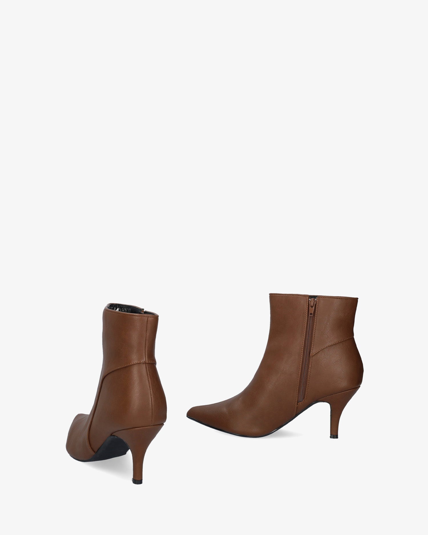 Booties in brown faux leather. Mid-height shaft with matching zipper closure on its internal side. Decorative stitching from the tip of the toe box to the upper edge of the shaft and around the ankle. The thin heel is 7 cm / 2.75`` high for smalls sizes from 32 to 35 EU and 8 cm / 3.14`` high for large sizes from 42 to 45 EU.