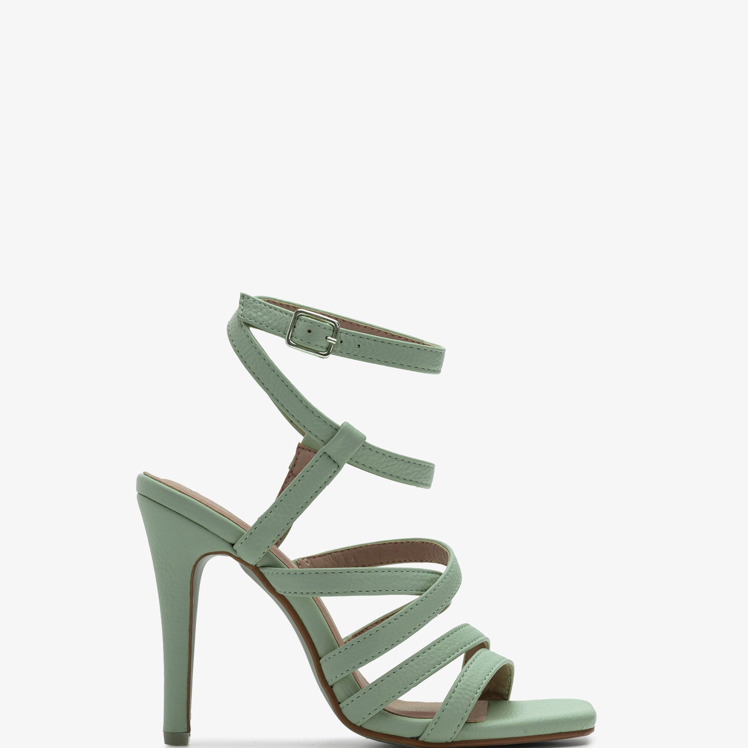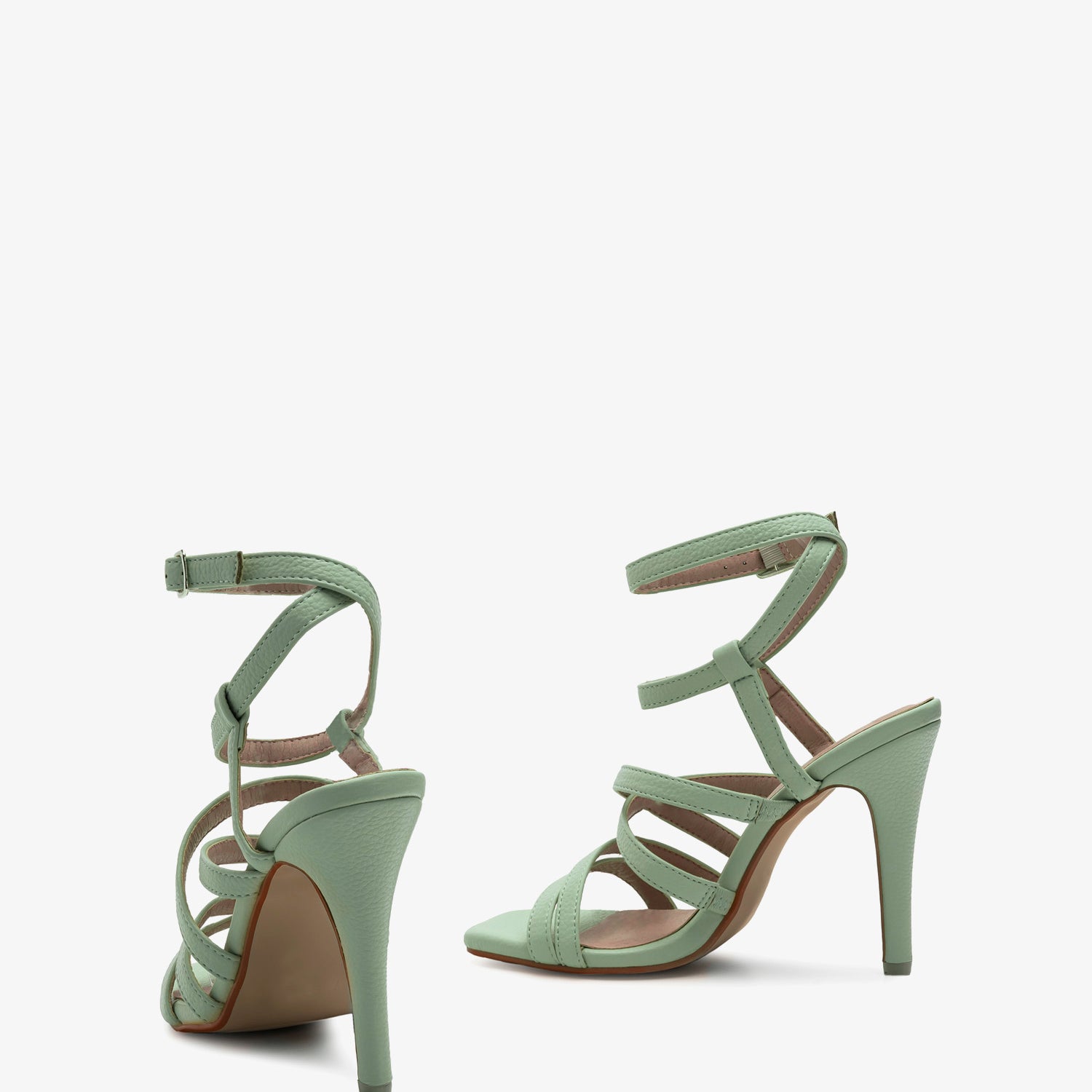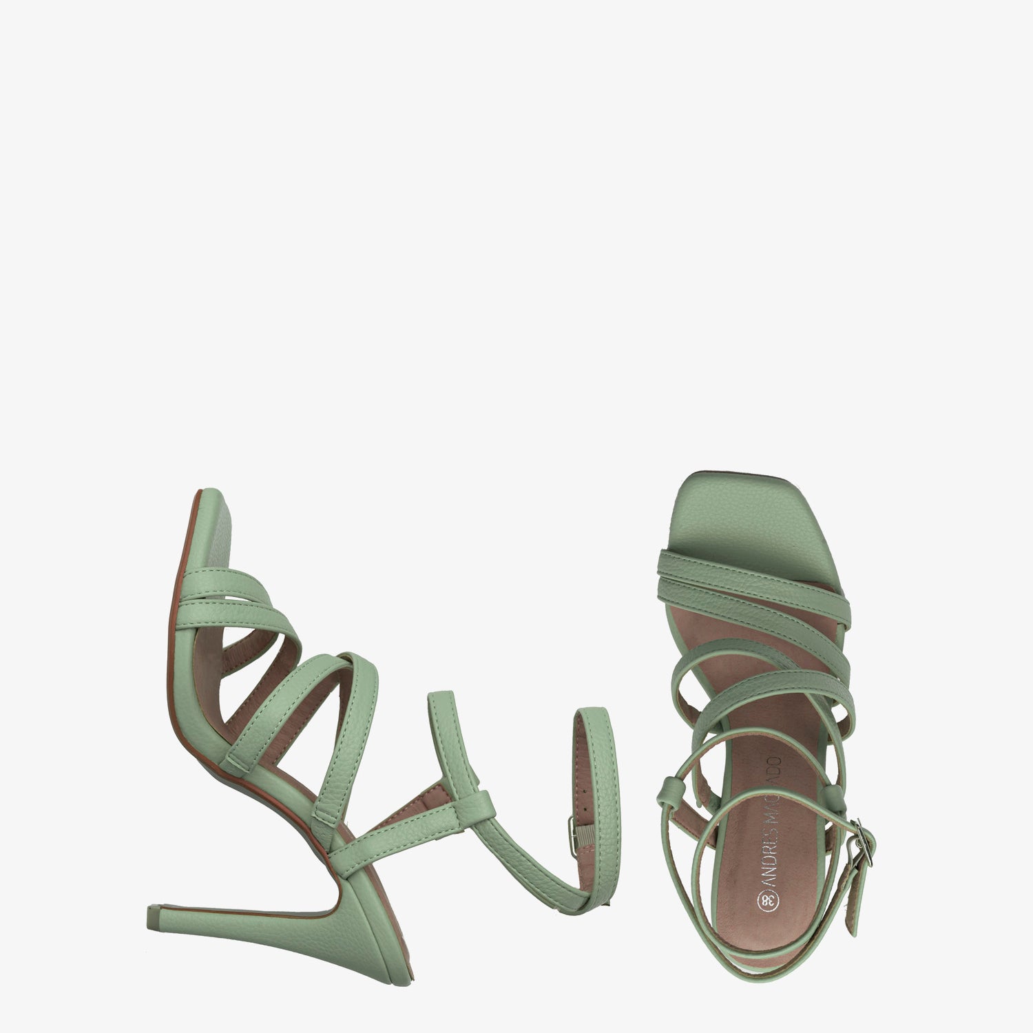 Mint faux leather sandals. Strappy design with matching thin straps accross the instep and vamp. Buckled strap closure around the ankle. Open and square toe box. The thin, lined heel is 9 cm / 3.54`` high for small sizes from 32 to 35 EU. The heel is 11.5 cm / 4.52`` high for large sizes from 42 to 45 EU.
