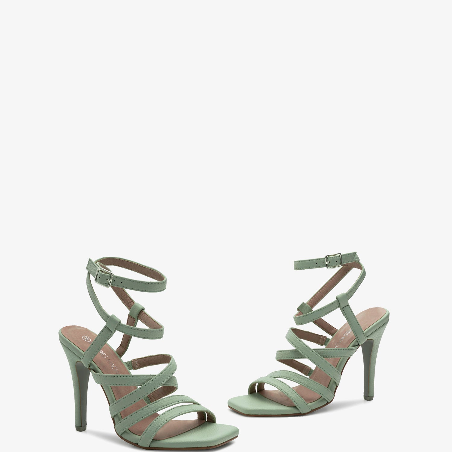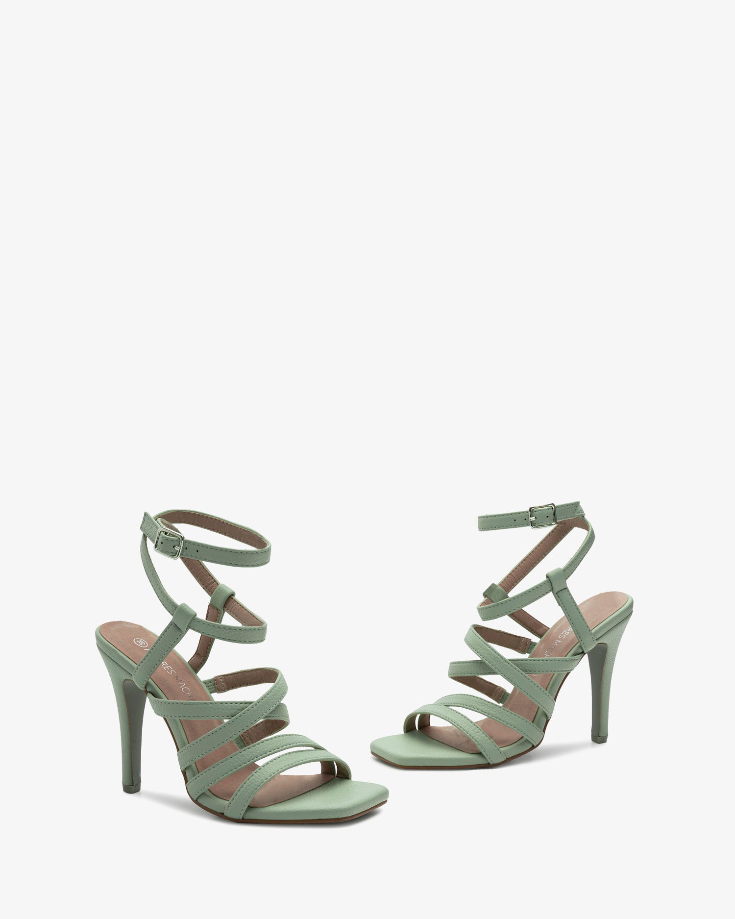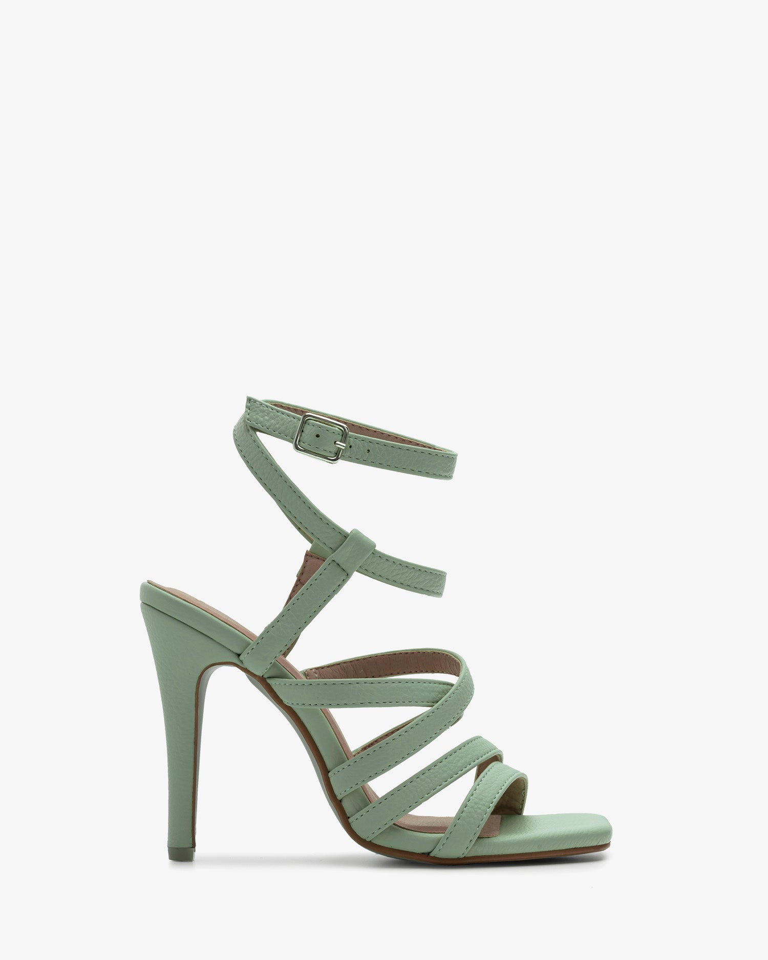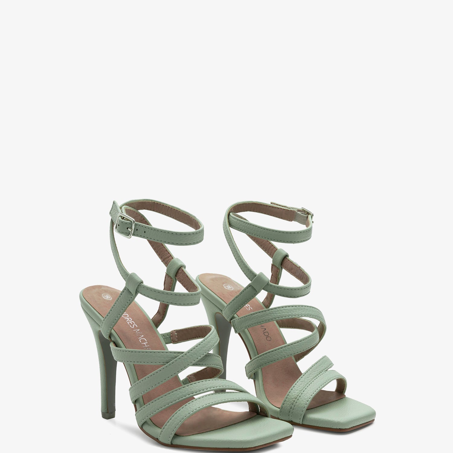 Mint faux leather sandals. Strappy design with matching thin straps accross the instep and vamp. Buckled strap closure around the ankle. Open and square toe box. The thin, lined heel is 9 cm / 3.54`` high for small sizes from 32 to 35 EU. The heel is 11.5 cm / 4.52`` high for large sizes from 42 to 45 EU.