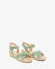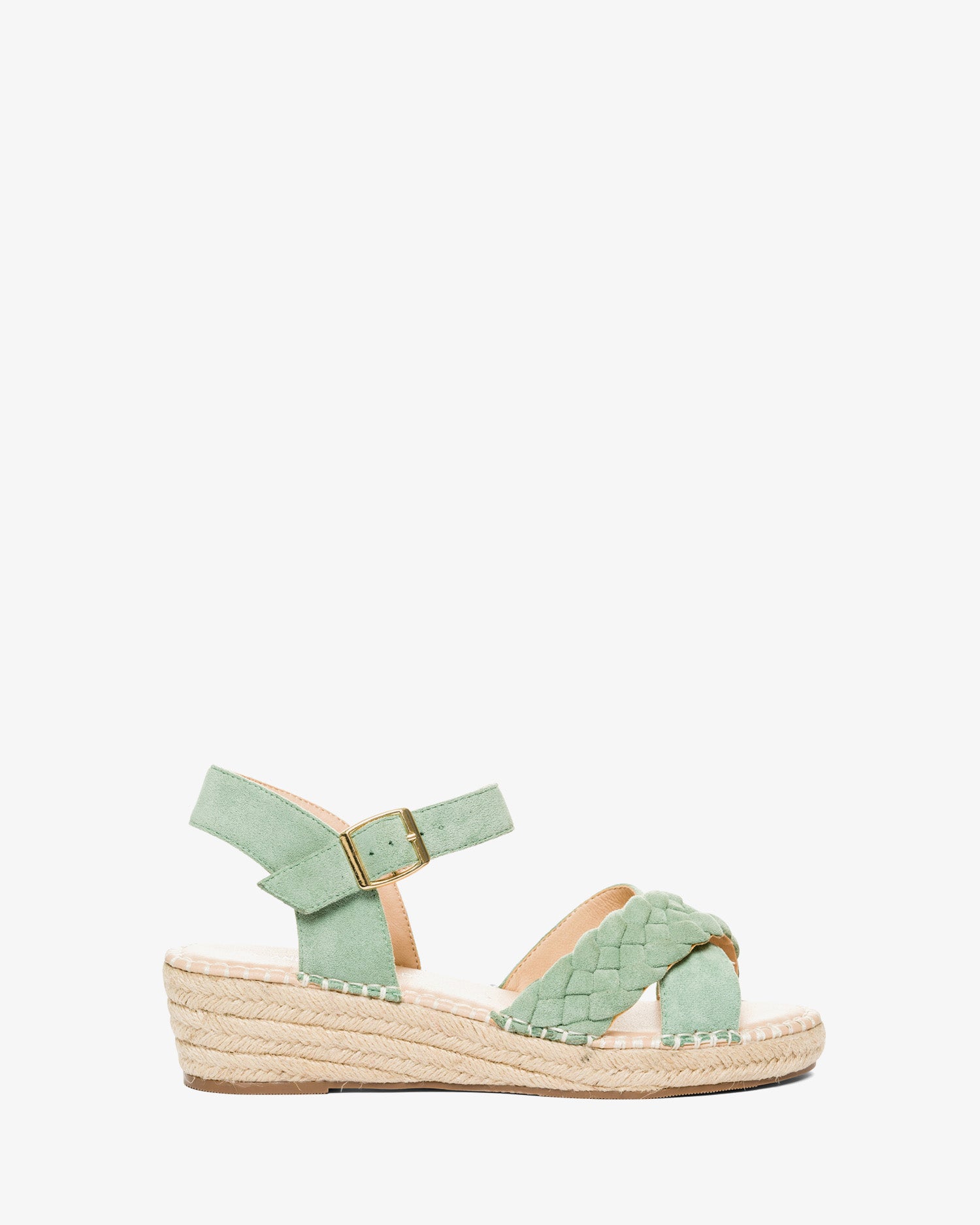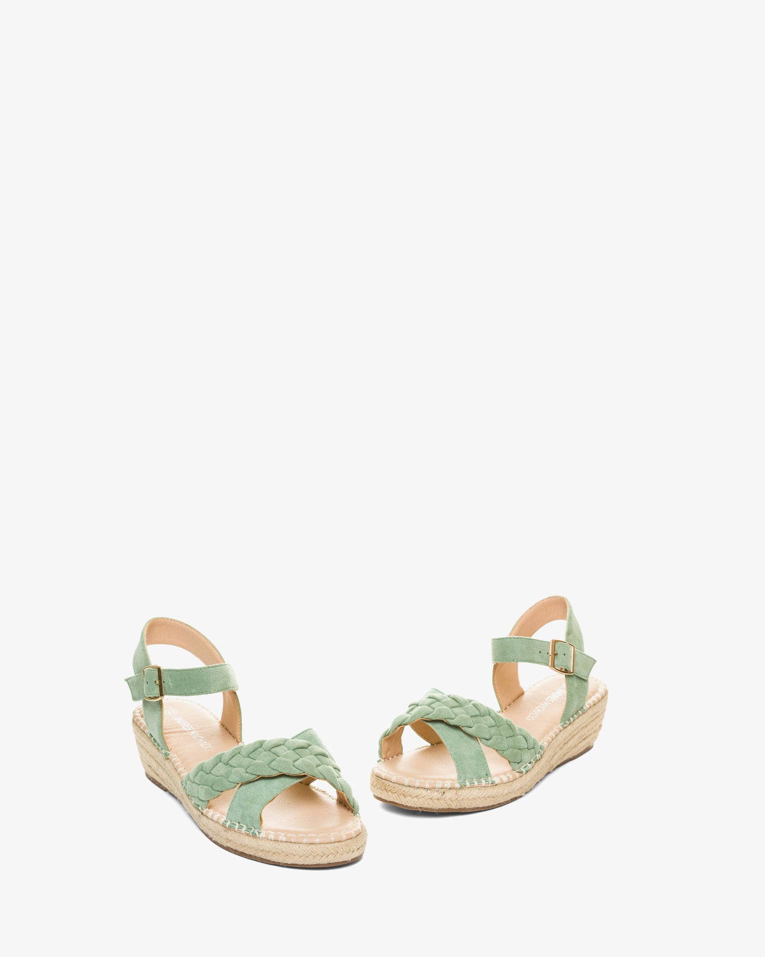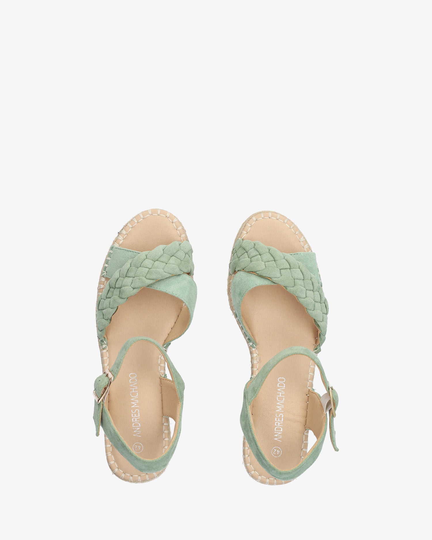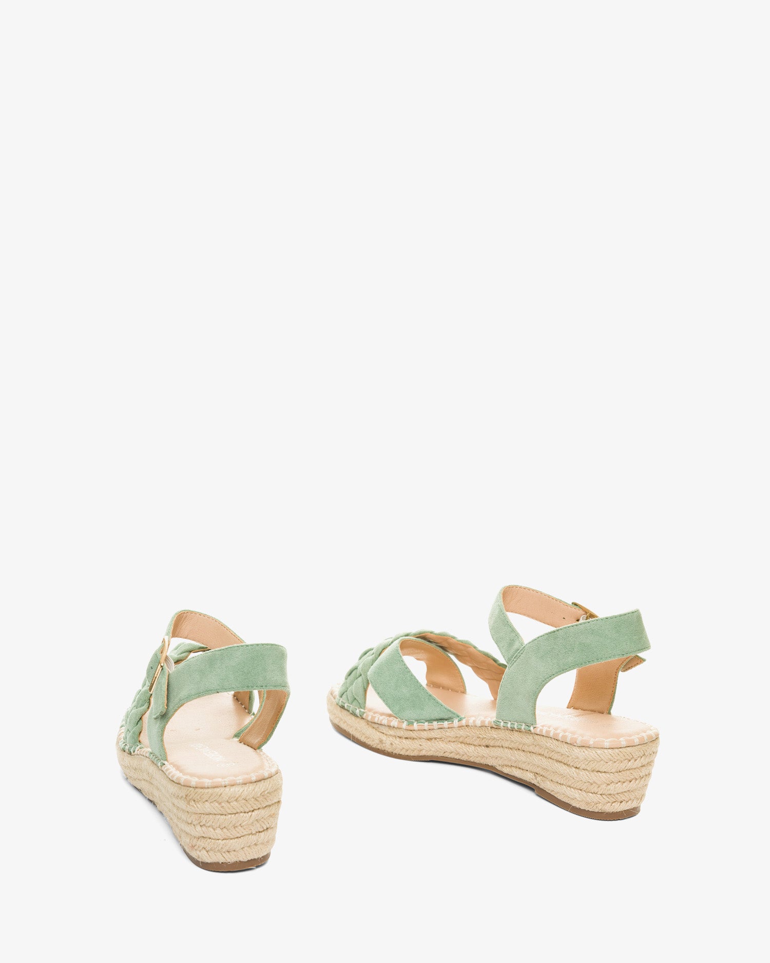 Mint faux suede sandals. Slingback design with two matching straps crossed over the vamp, one of them braided. Round and open toe. Matching buckled strap closure around the ankle. Jute wedge of 1,77"/4,5 cm and platform of 0,79"/2 cm for small sizes from 32 to 35 EU. Wedge of 2,16"/5,5 cm and platform of 0,79"/2 cm for large sizes from 42 to 45 EU.