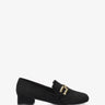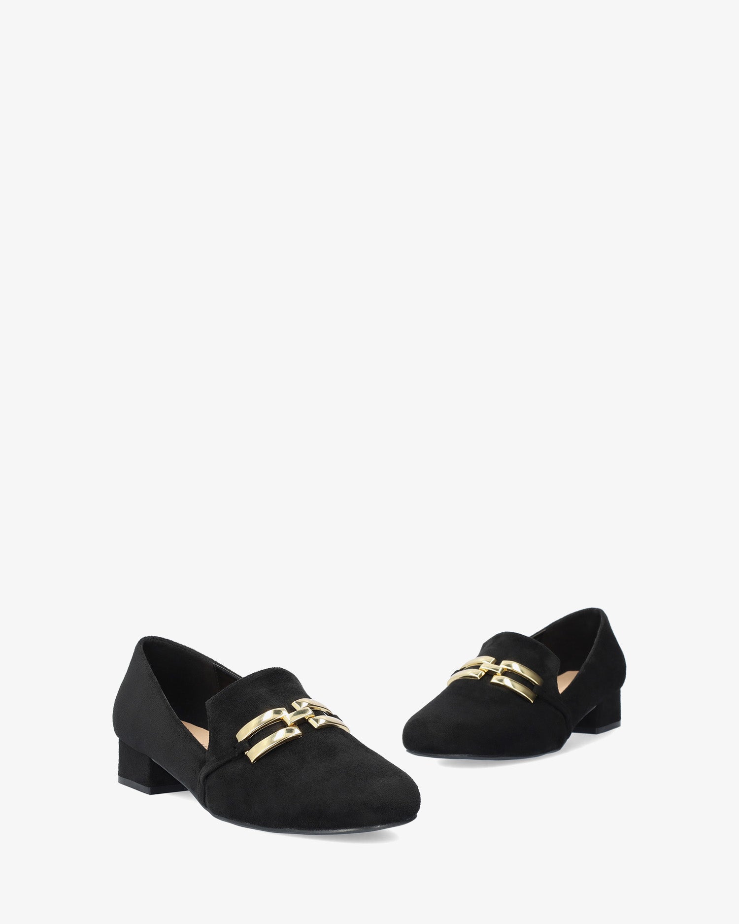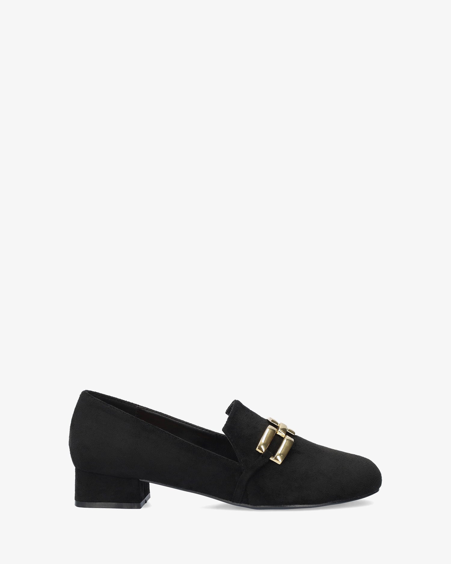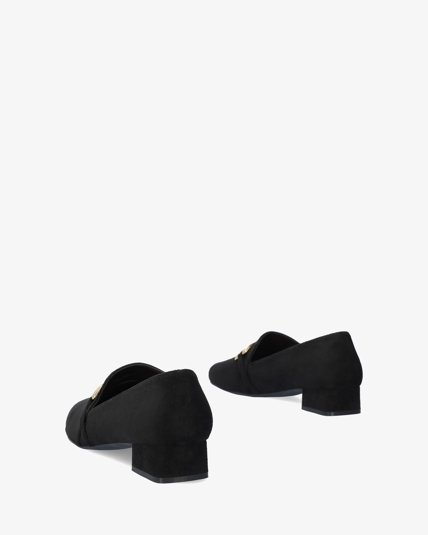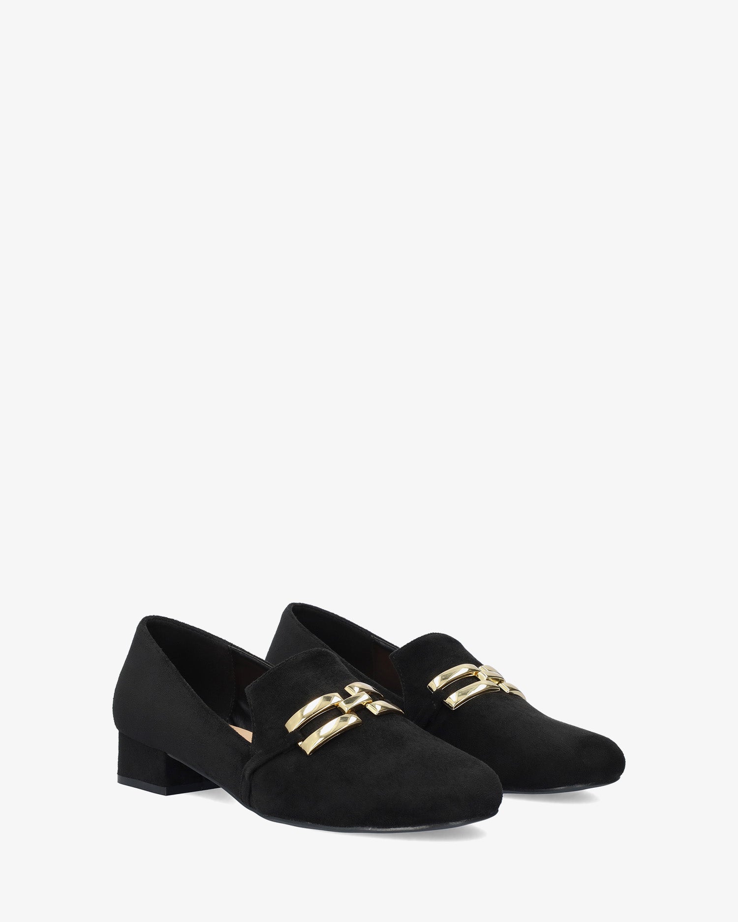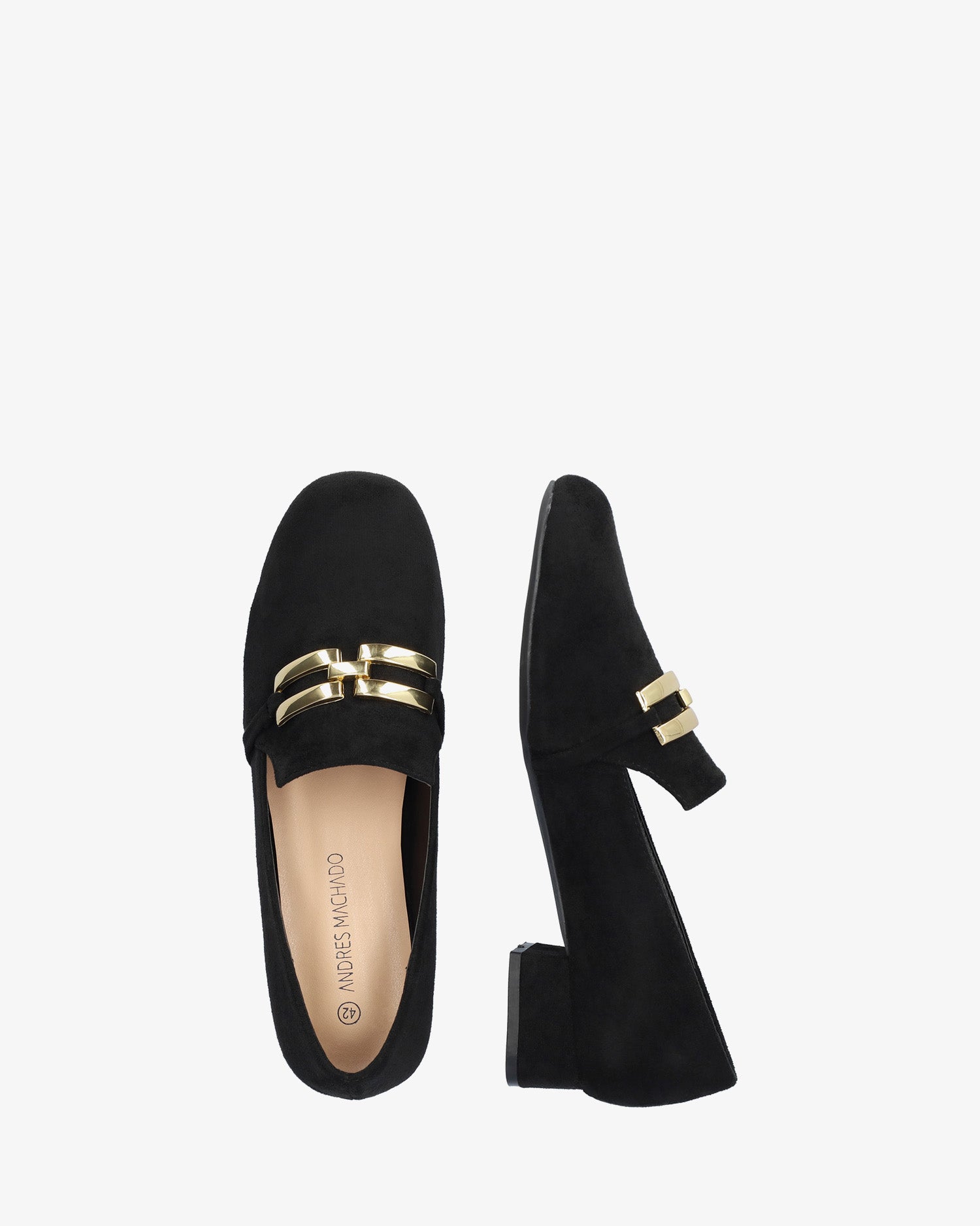 Moccasins in black faux suede with golden chain detail on the vamp. Finished in a rounded toe. The wide heel is 1,36" high for large sizes from 42 to 45 EU.