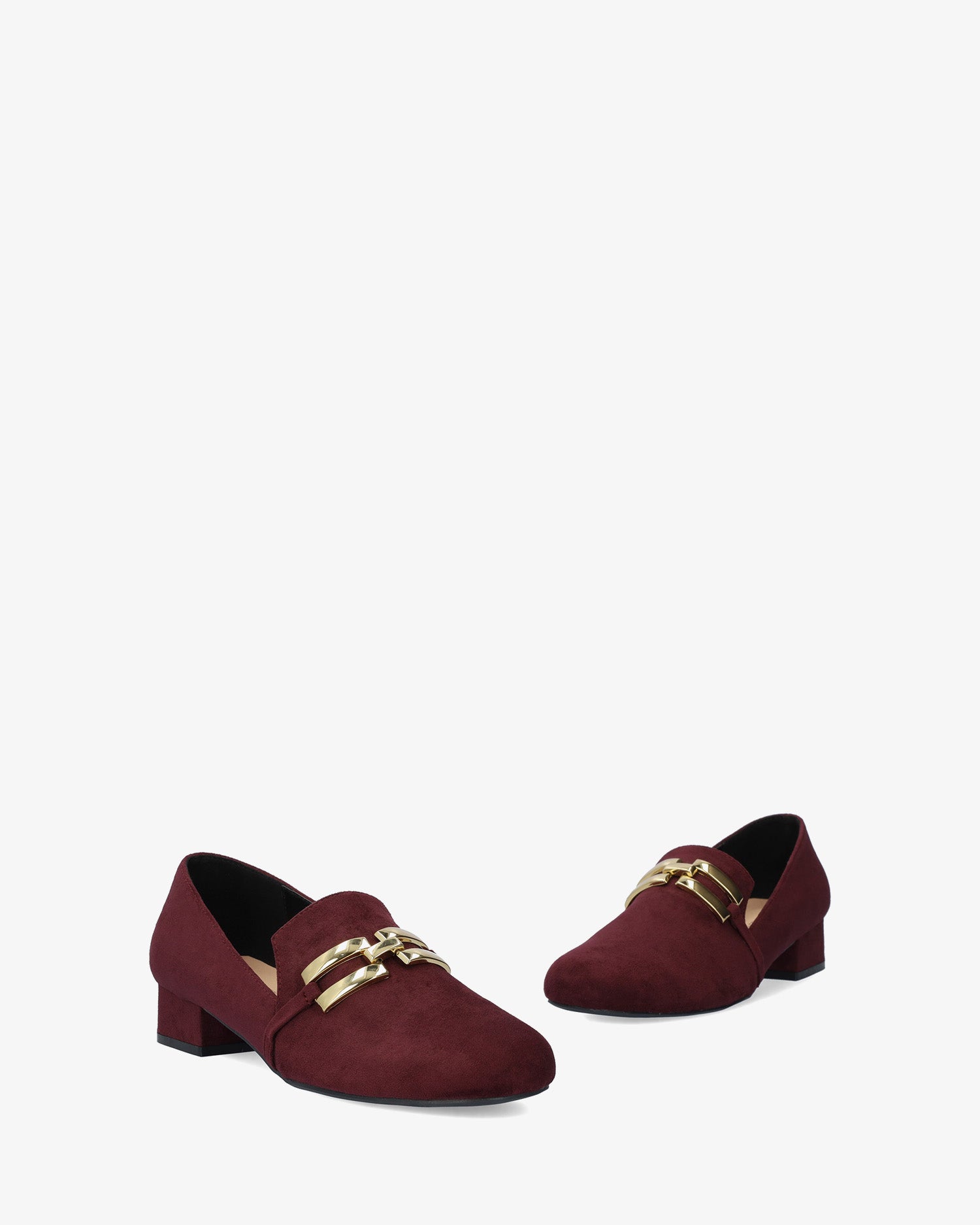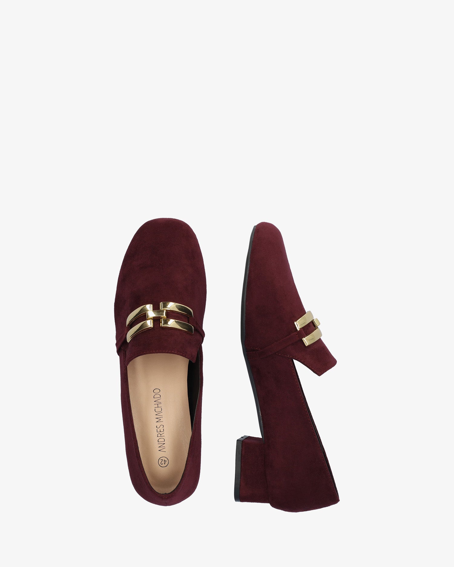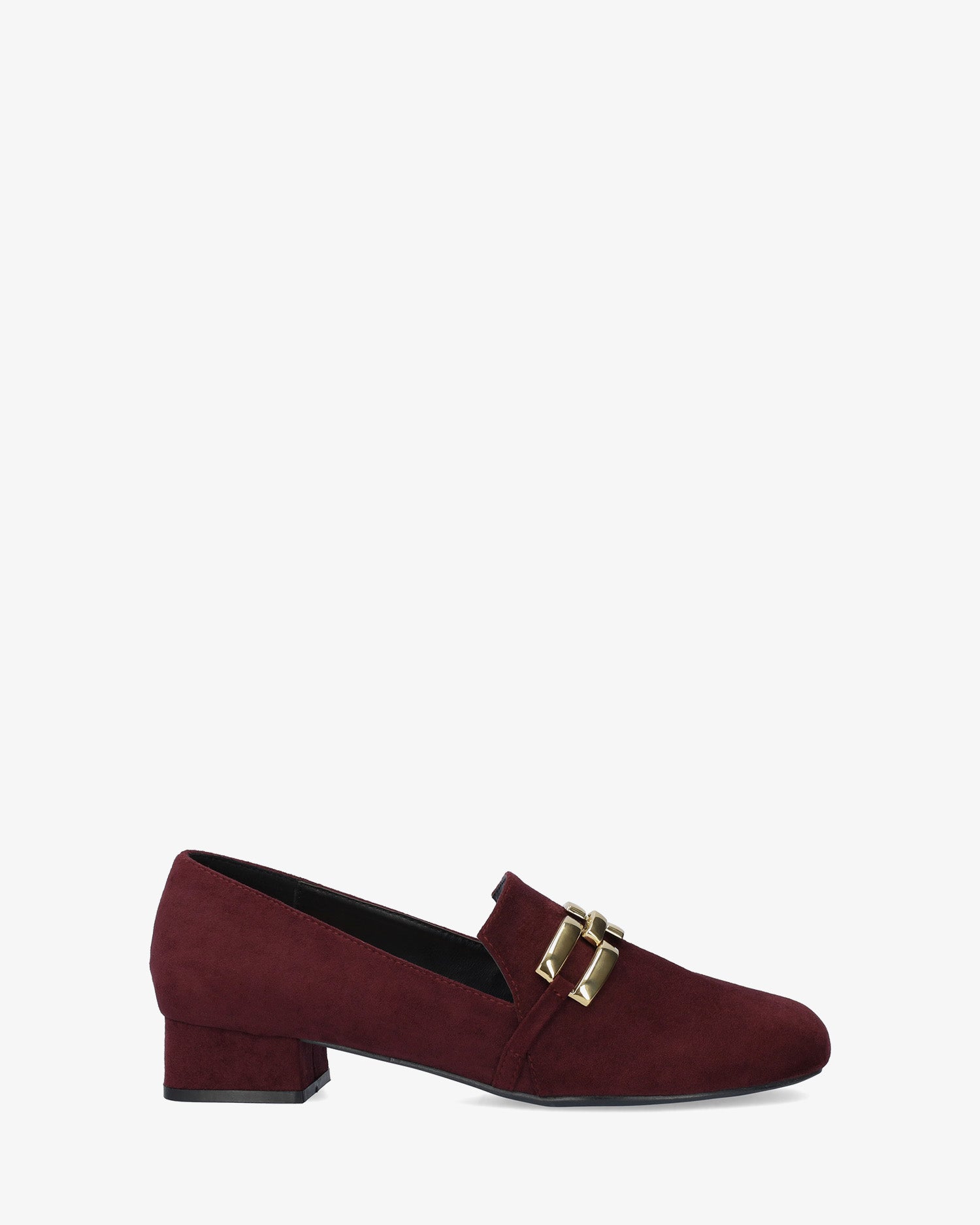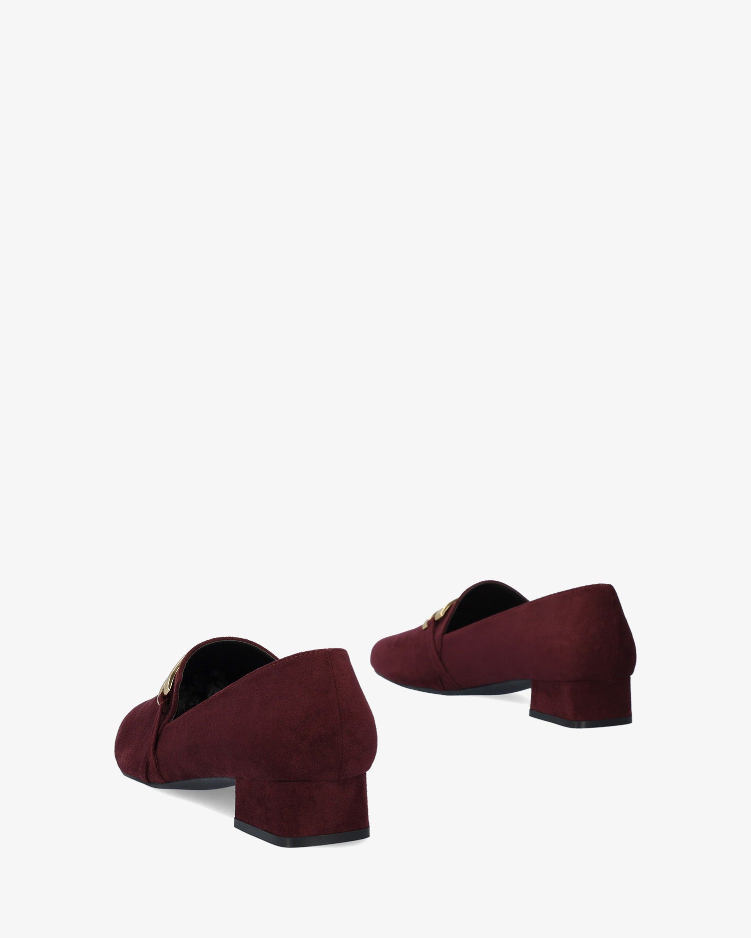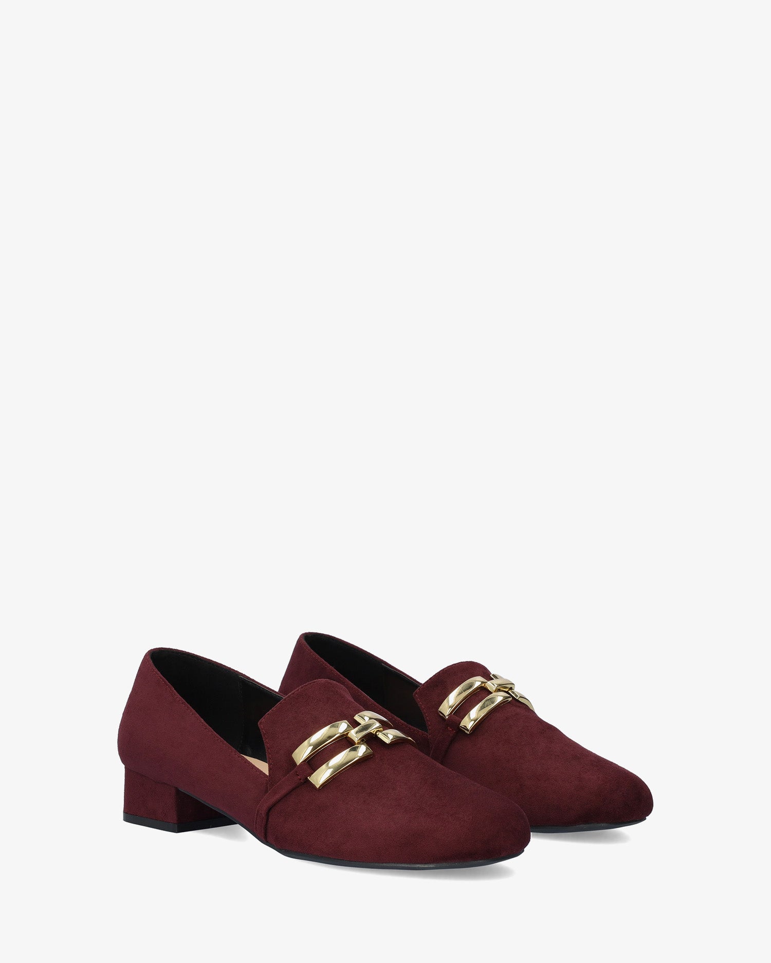Moccasins in burgundy faux suede with golden chain detail on the vamp. Finished in a rounded toe. The wide heel is 1,36" high for large sizes from 42 to 45 EU.