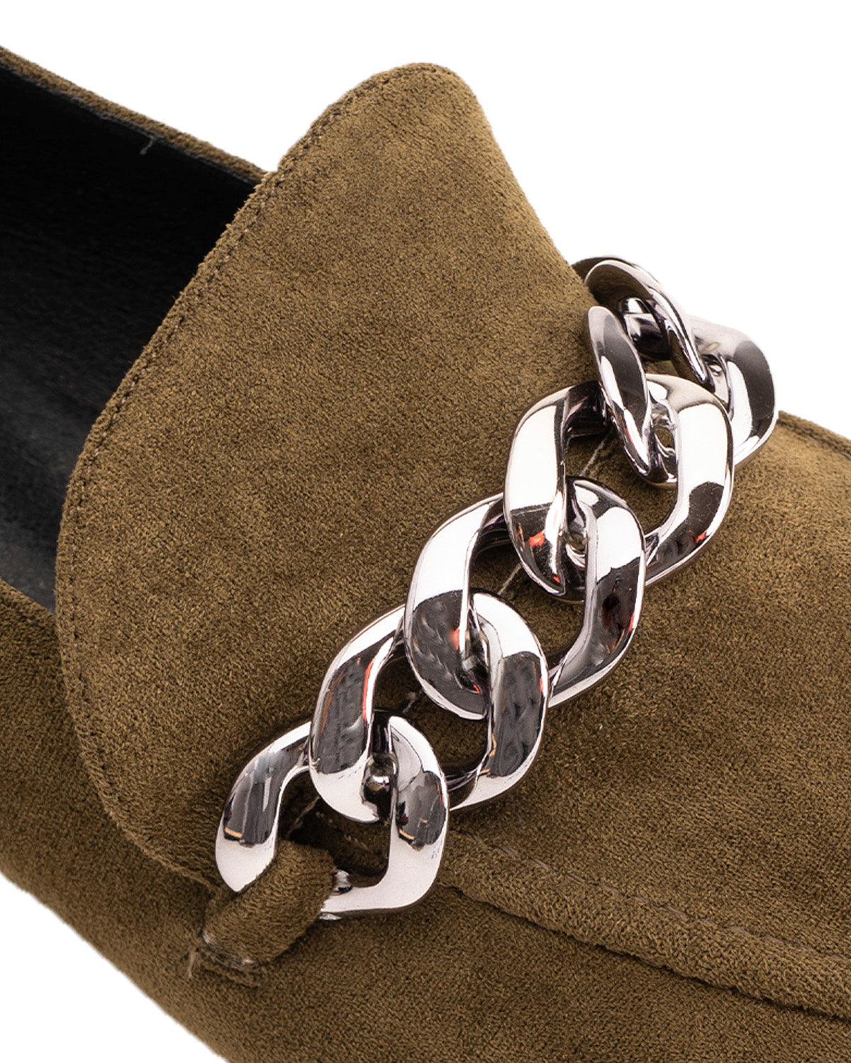Moccasins in kaki faux suede with silver chain link detail on the vamp. Finished in a square toe. The wide heel is 3 cm / 1.18`` high for small sizes from 32 to 35 EU and 3 cm / 1.18`` high for large sizes from 42 to 45 EU.