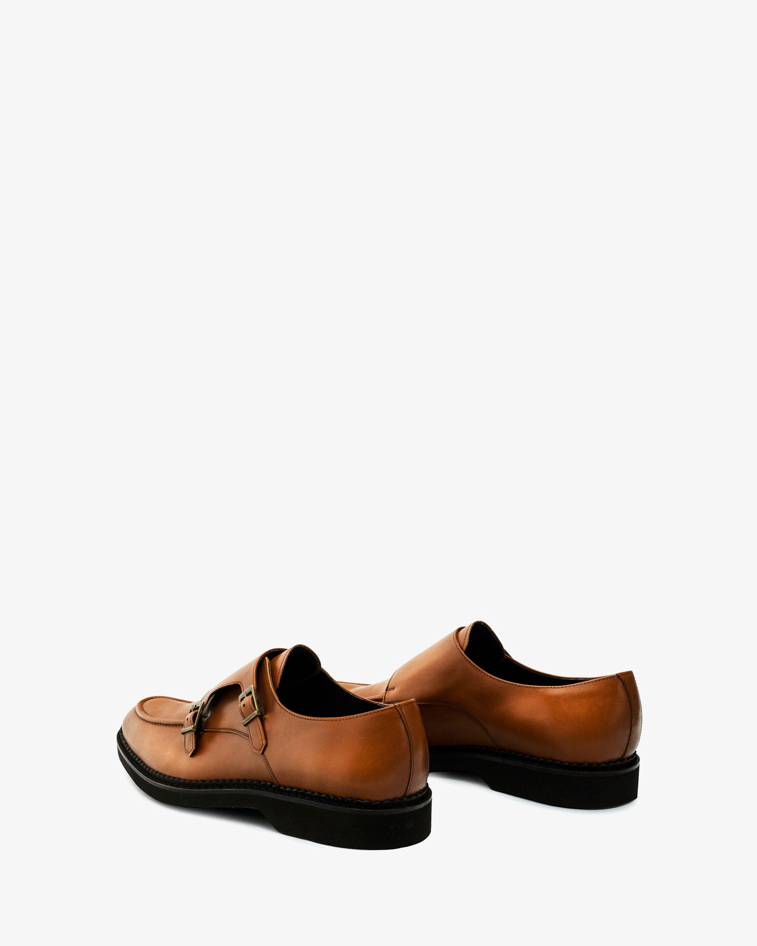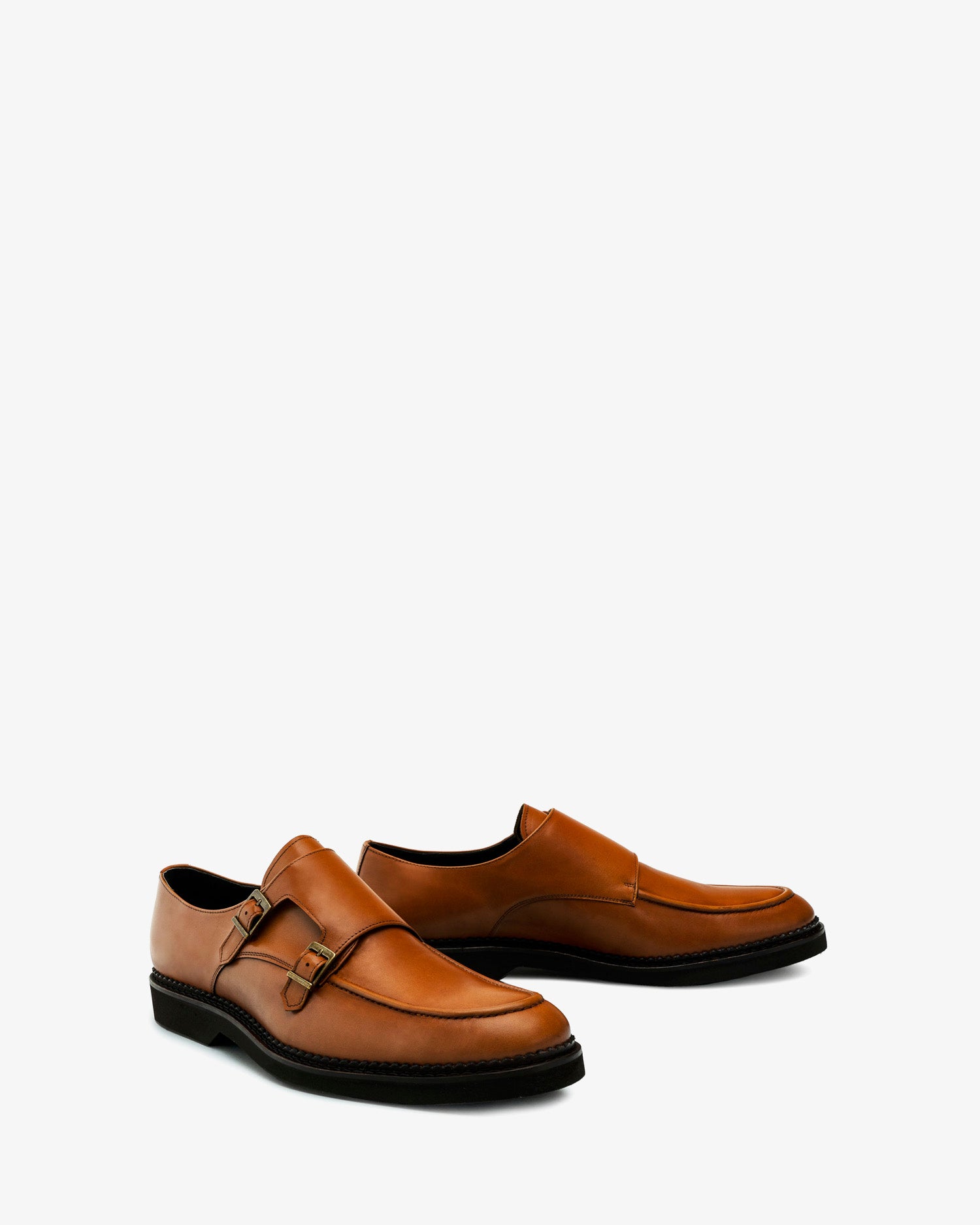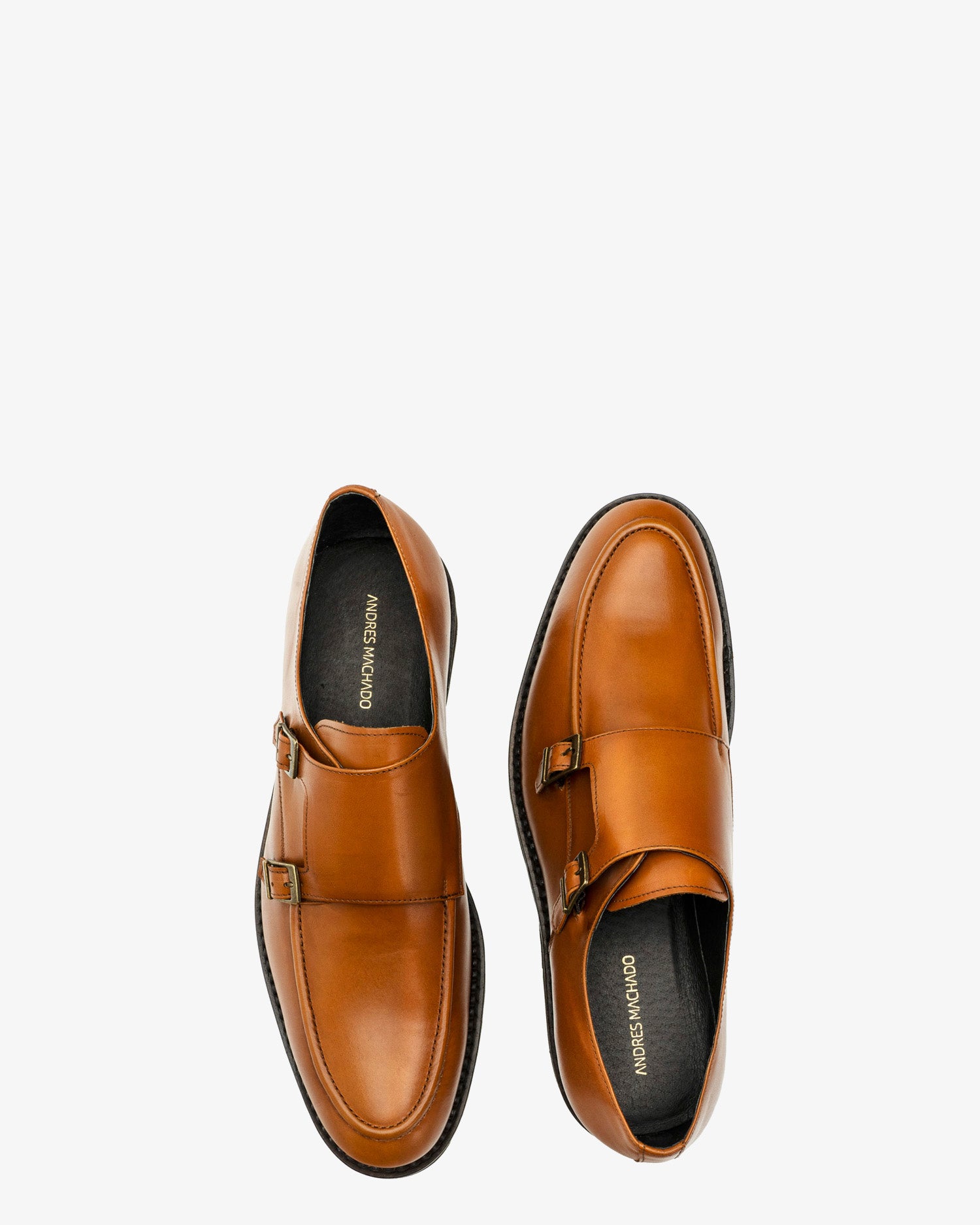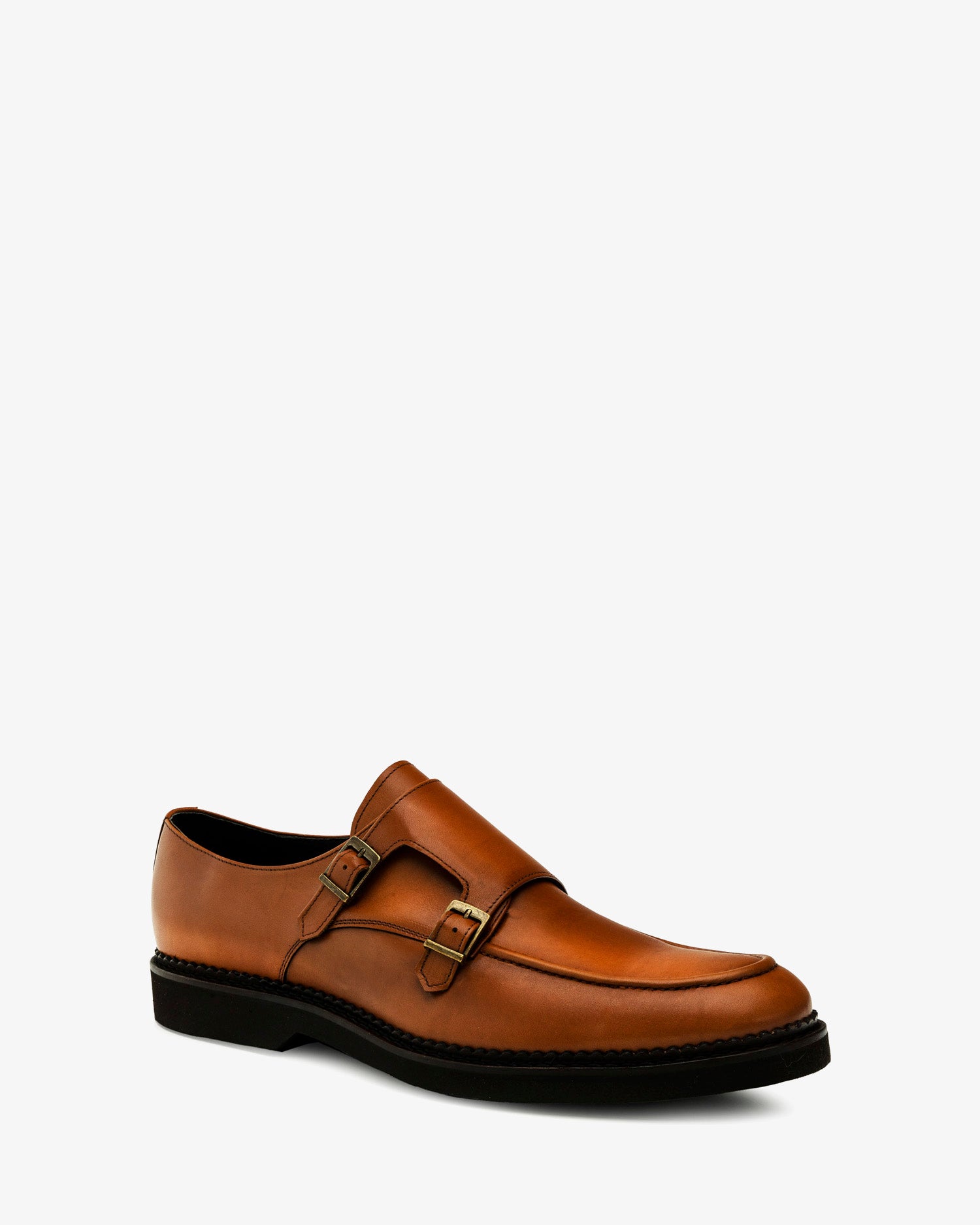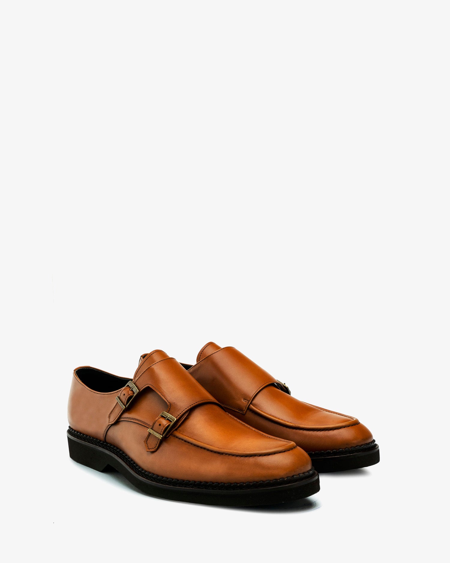 Monkstrap shoe in brown leather. Closure with two metal buckles on the outside. Black leather insole and lining. Black rubber sole. Large sizes from 47 to 50. Made In Spain
