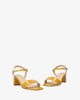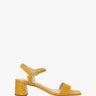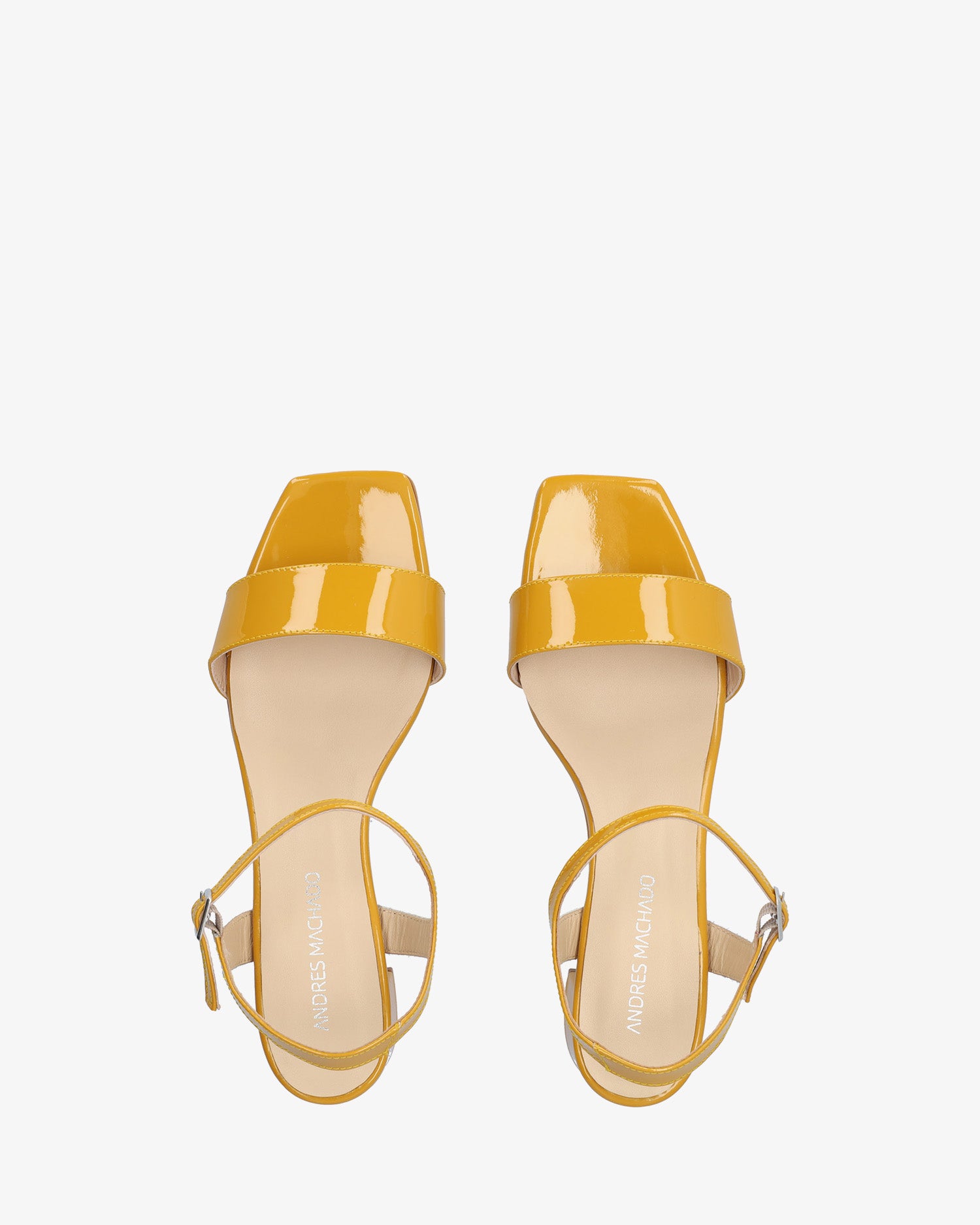 Mustard patent sandals. Matching wide strap on the vamp. Buckled strap closure around the ankle. Square toe box. Leather inner lining. The square heel lined with patent is 5,5cm / 2,16`` high for small sizes from 32 to 35 EU. The heel is 6cm /2,36`` high for large sizes from 42 to 45 EU. Made in Spain.