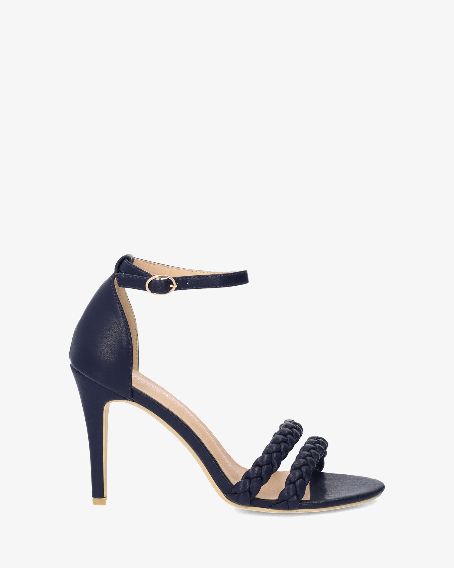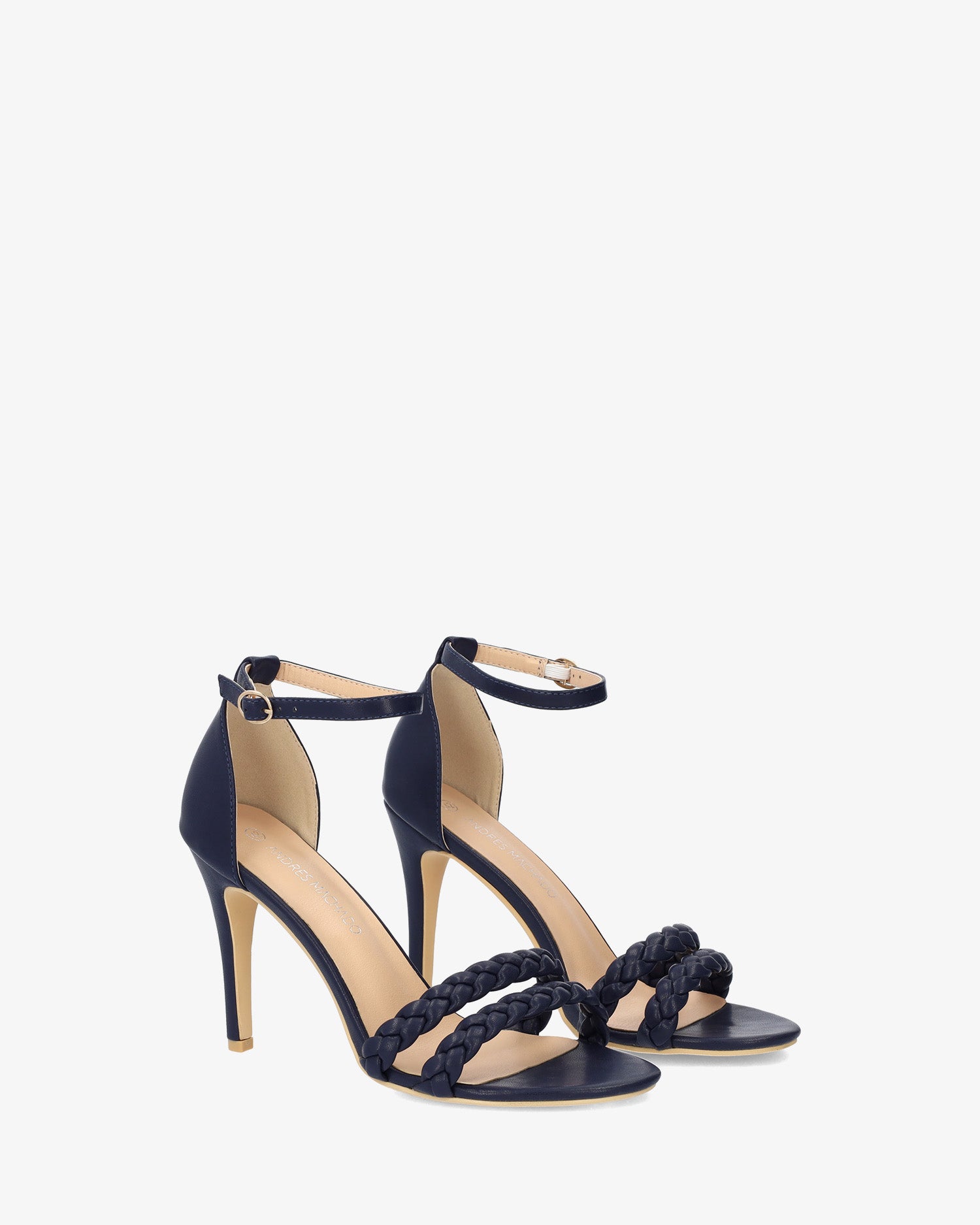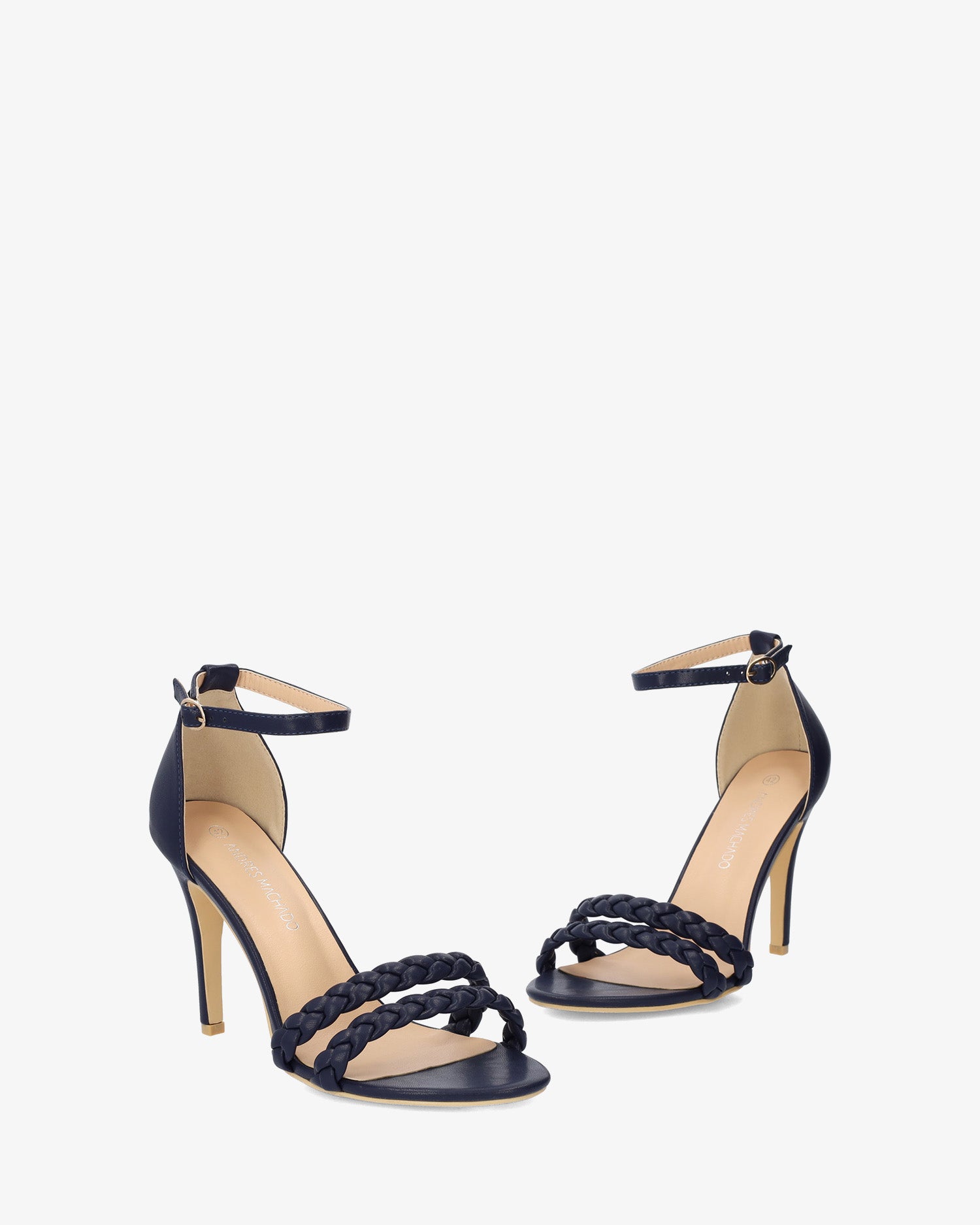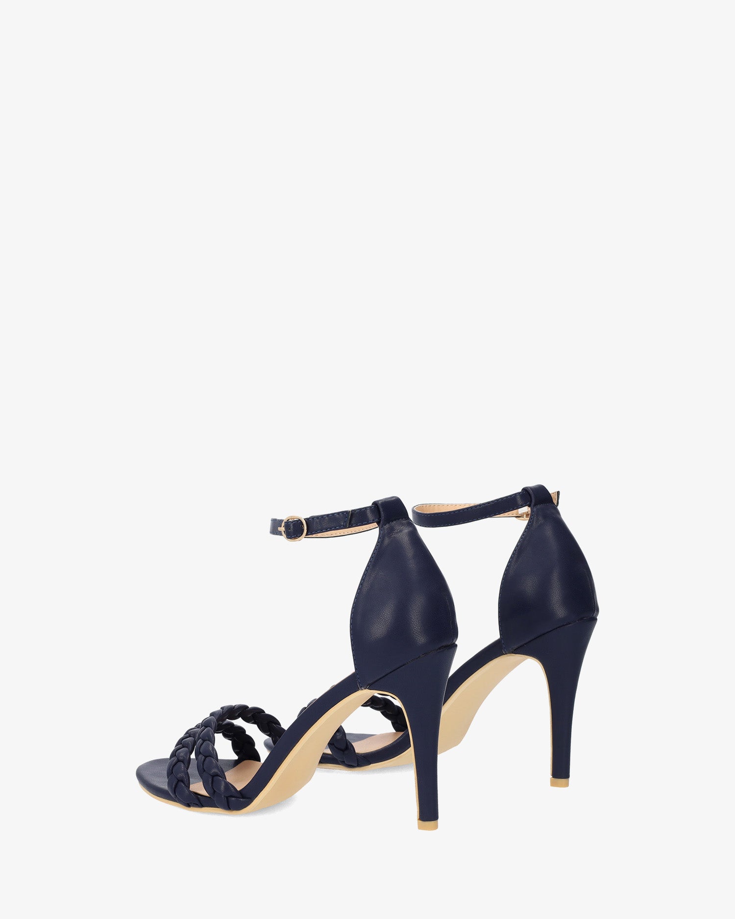 Navy faux leather heeled sandals with matching braided straps over the open toe box. Buckled strap closure around the ankle and matching counter. The thin, matching heel is 9cm / 3,54`` for small sizes from 32 to 35 EU. The thin, matching heel is 10,5 cm/4,13`` for small sizes from 42 to 45 EU.