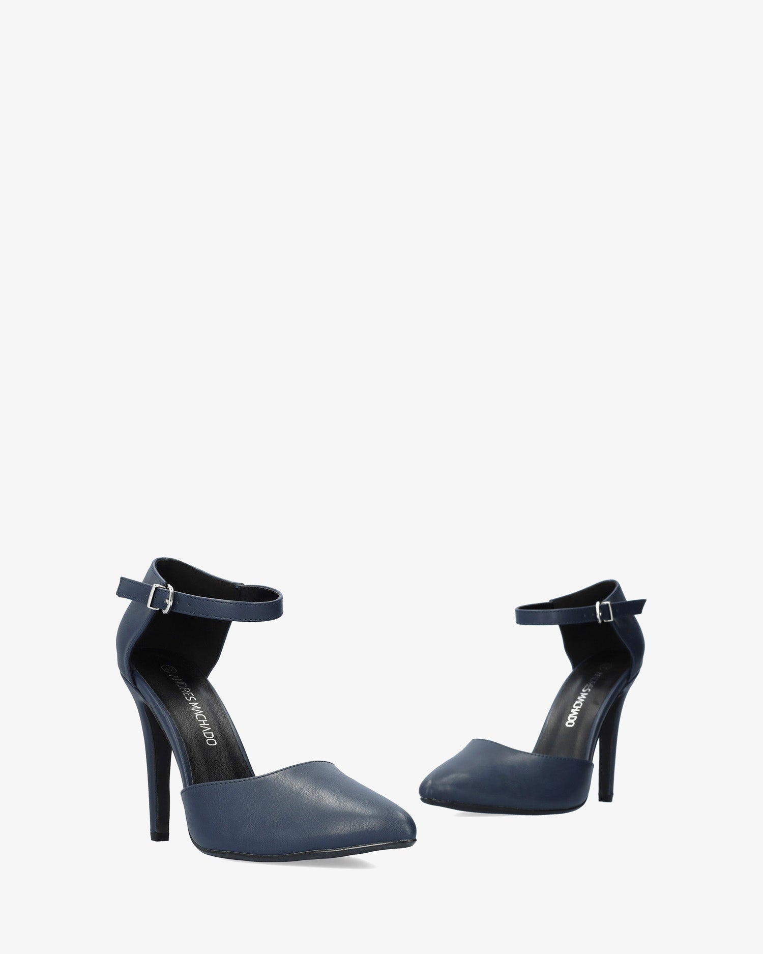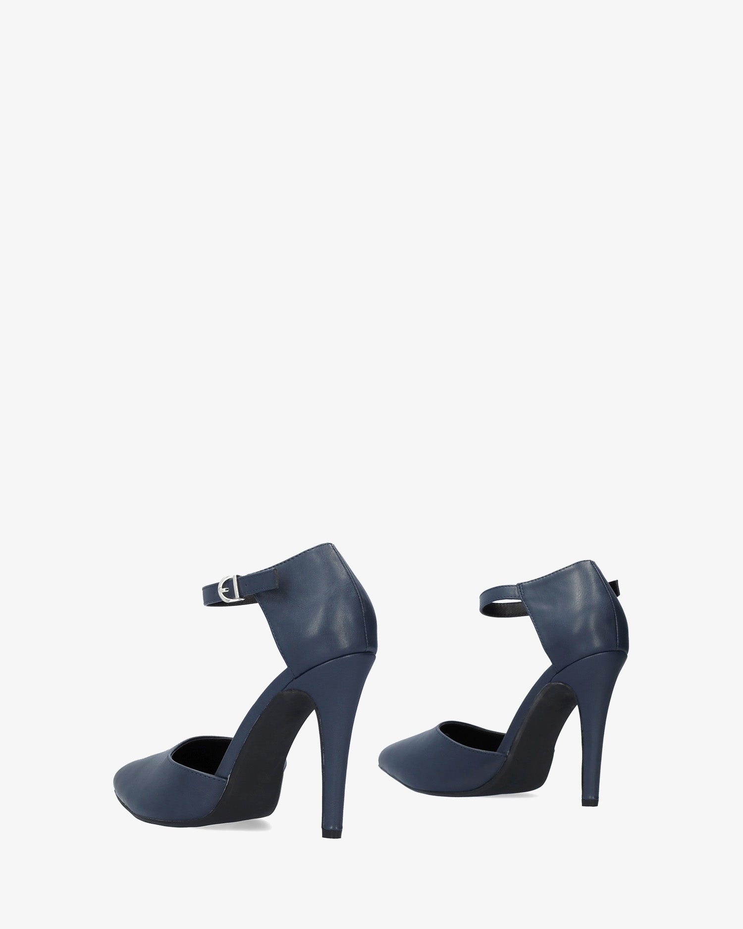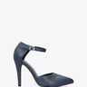 Soft navy pump with a fine high heel lined in the same colour. Designed with a covered heel and buckle fastening at the ankle strap. Finished with a fine toe. Heel height 3,74 inch for small size 32 to 35 and heel height 4,33 inch for large size 43 to 45.