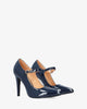 Heeled Mary Jane in beige coloured patent soft faux leather. The design features a strap over the vamp with a metallic buckle that finishes in a pointed toe. The tone on tone lined heel measures 3,74 inch for small sizes 32-35 and 4,33 inch for large sizes 42-45.