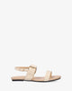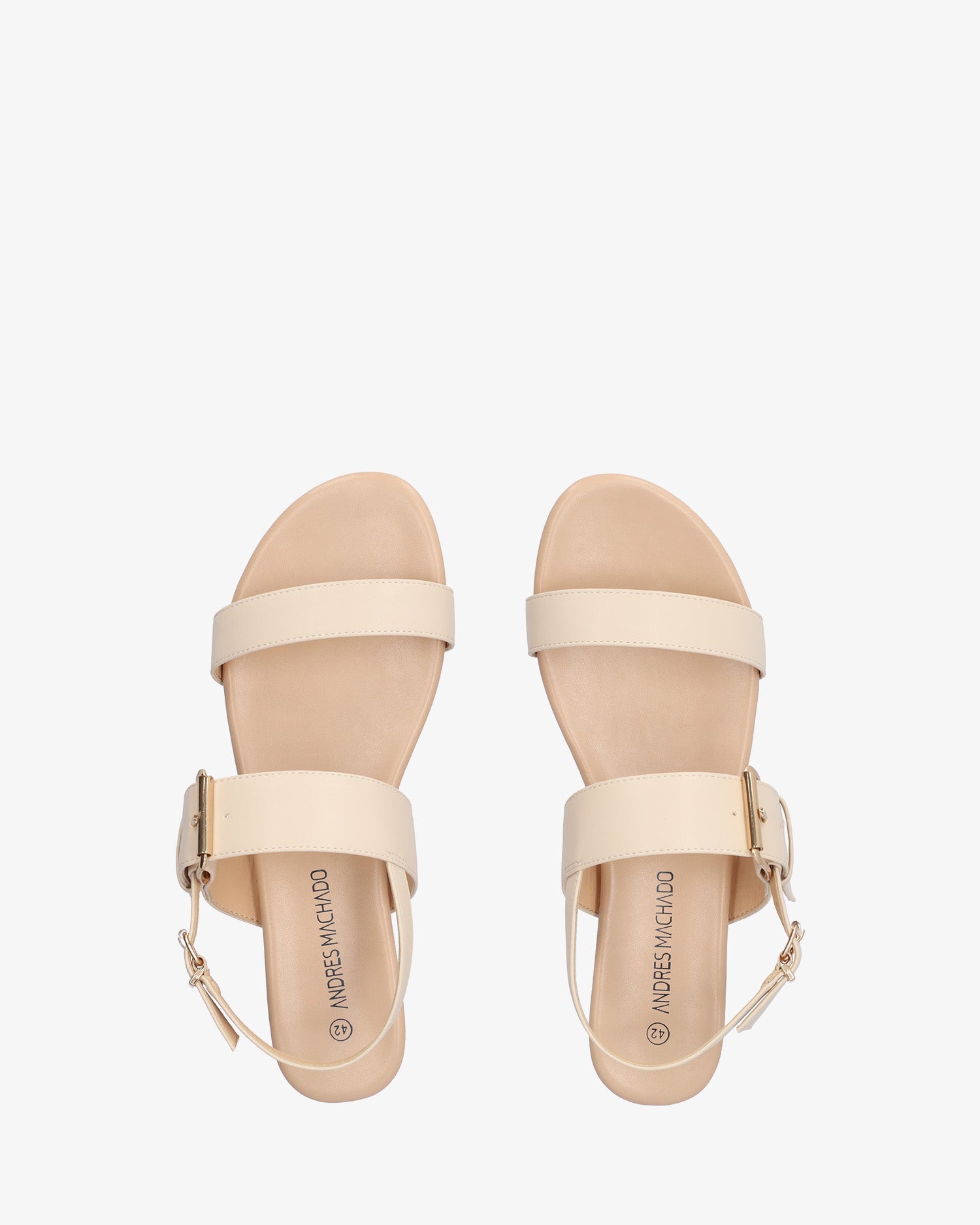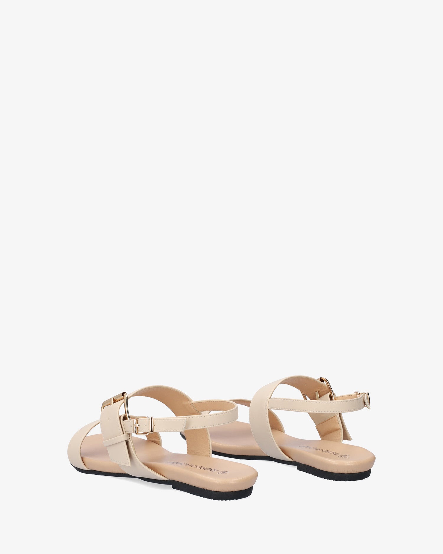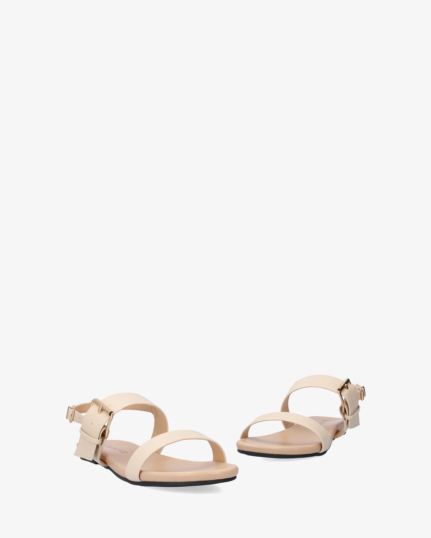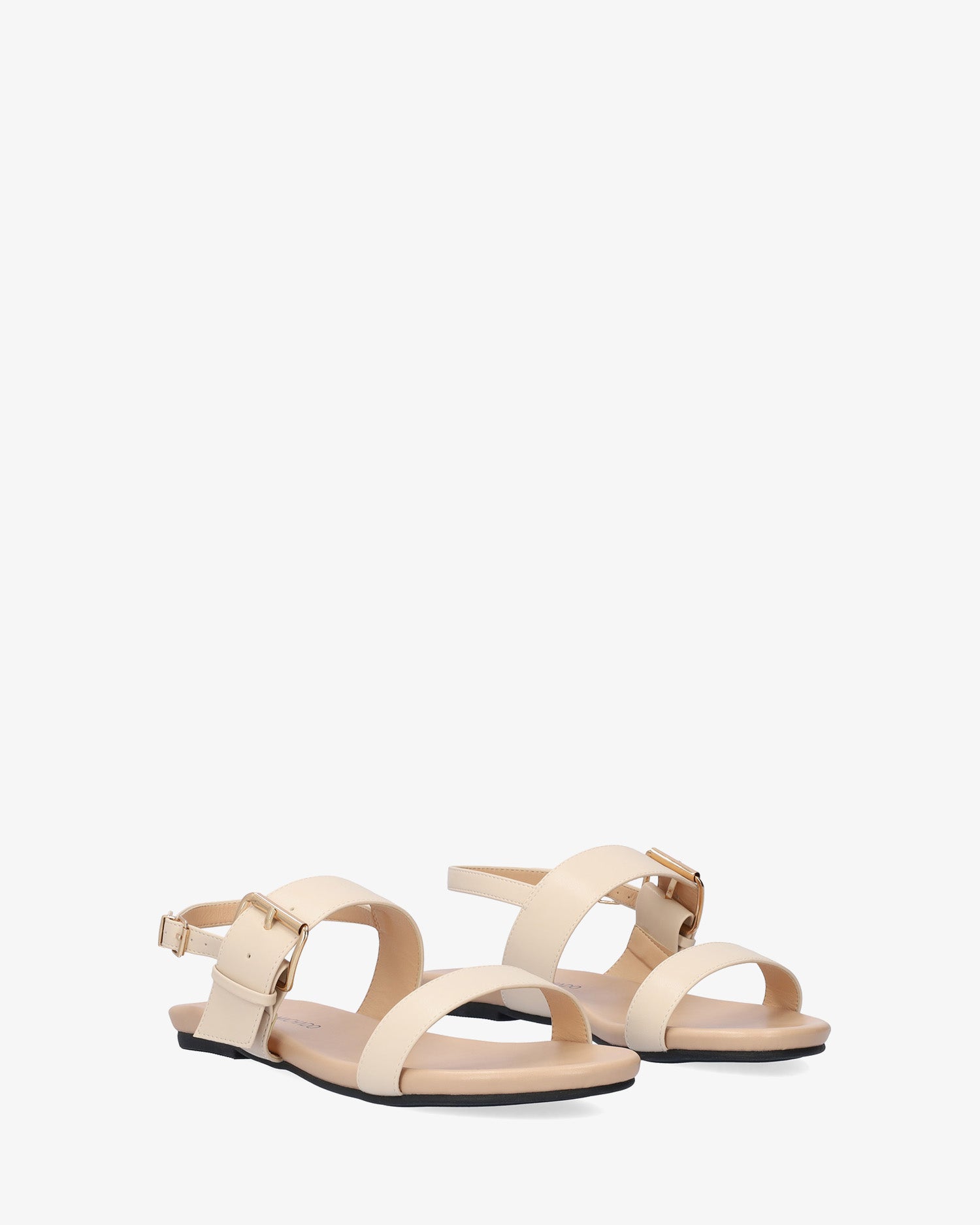 Off-white faux leather flat sandals. Slingback design featuring a thin strap over the vamp and a matching wide strap over the instep. Double buckle closure#pc# a big buckle closure on the instep strap and a secondary, small buckle on the ankle strap. Round and open toe box. Cushioned insole. Available in large sizes from 42 to 45 EU.