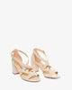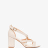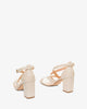 Off-white faux leather sandlas with block heel. Closed counter featuring crossed straps over the instep. Matching buckled strap closure around the ankle. Round and open toe box. Heel of 2,75" for small sizes from 32 to 35 EU. Heel of 3,54" for large sizes from 42 to 45 EU.
